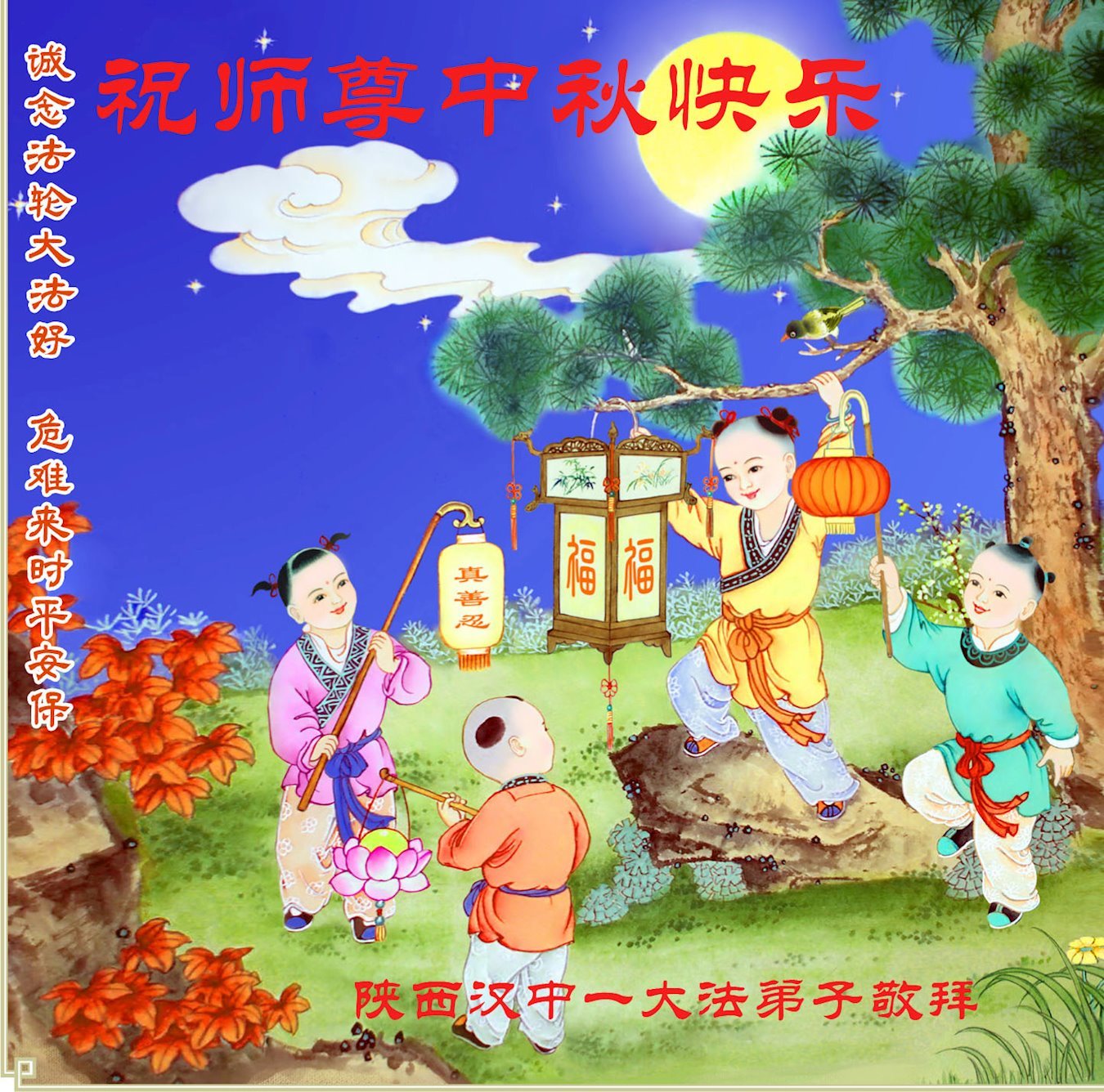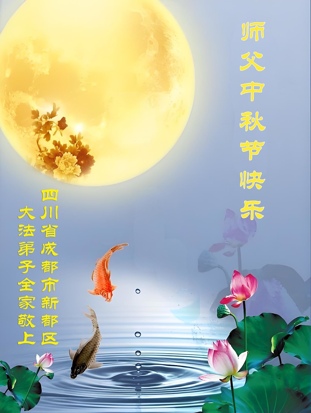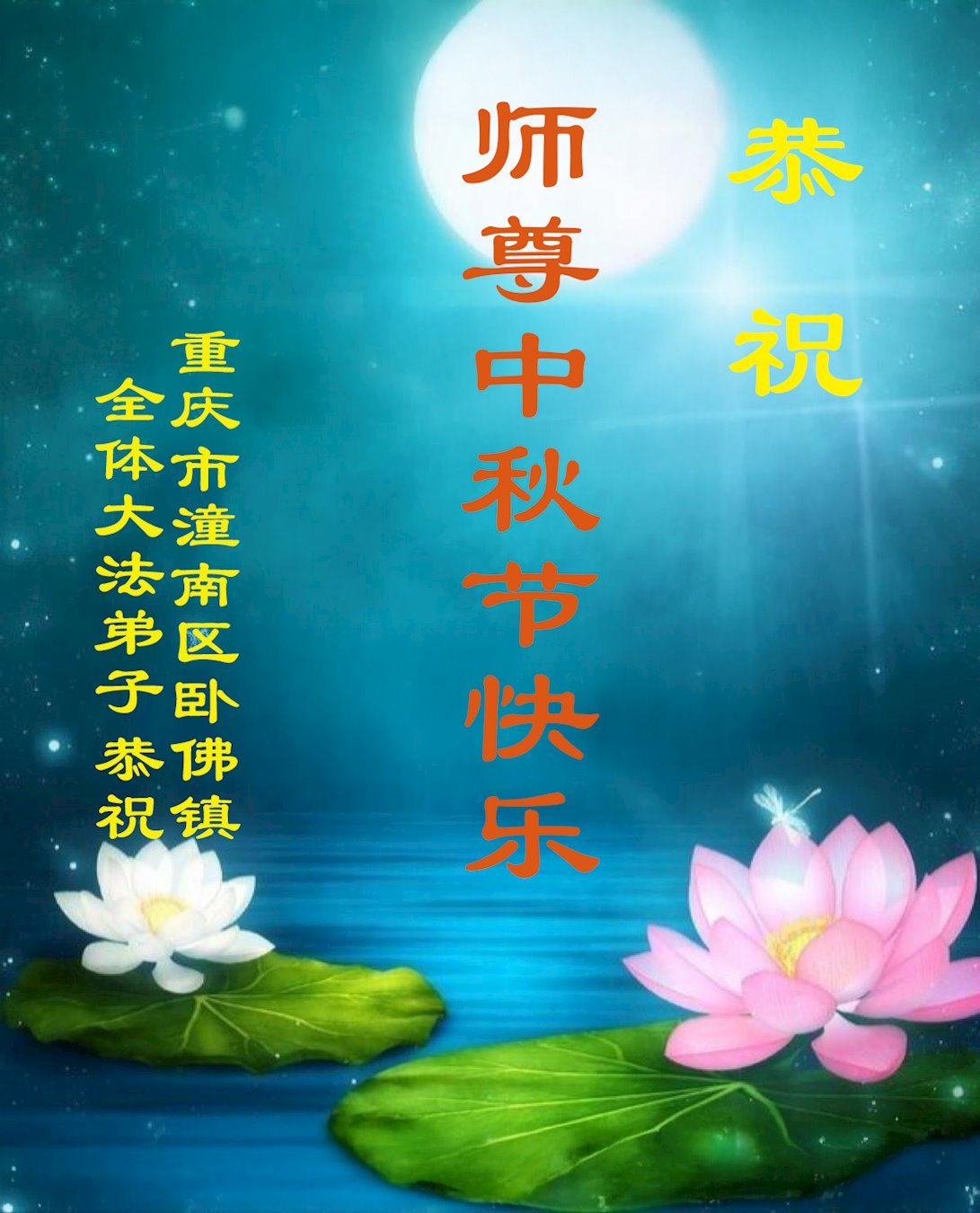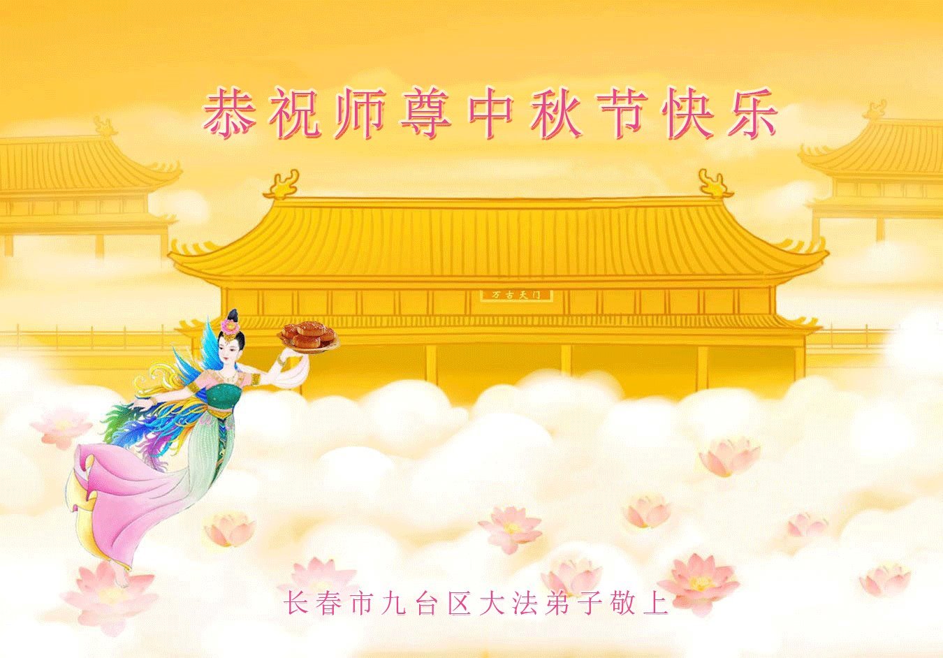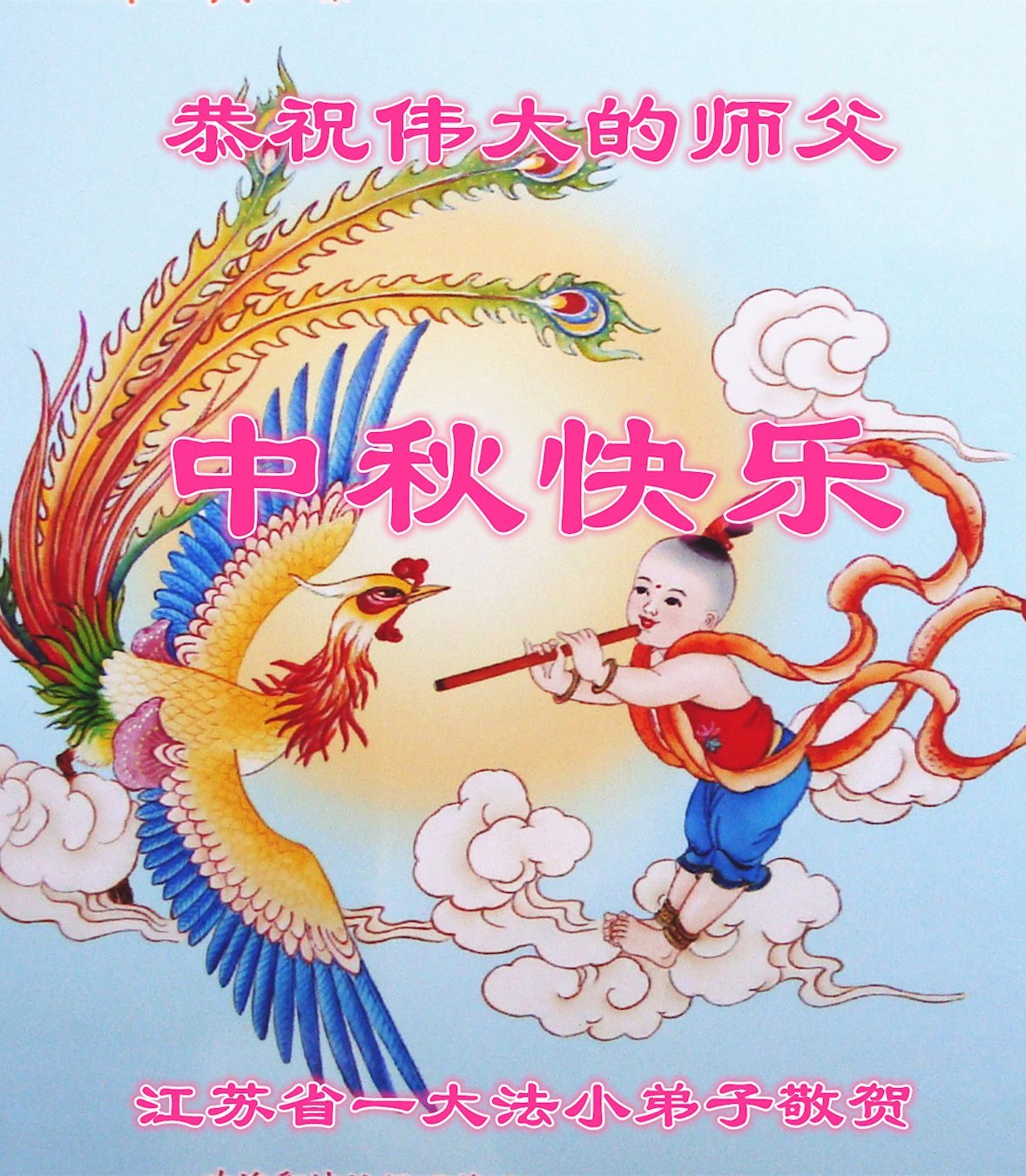 敬祝地球上最最尊敬的大法師父中秋節快樂!盼望大法師父早日回中國和您的弟子們團聚,願您的弟子們早日脫離苦海!也祝福大師的弟子們中秋快樂!