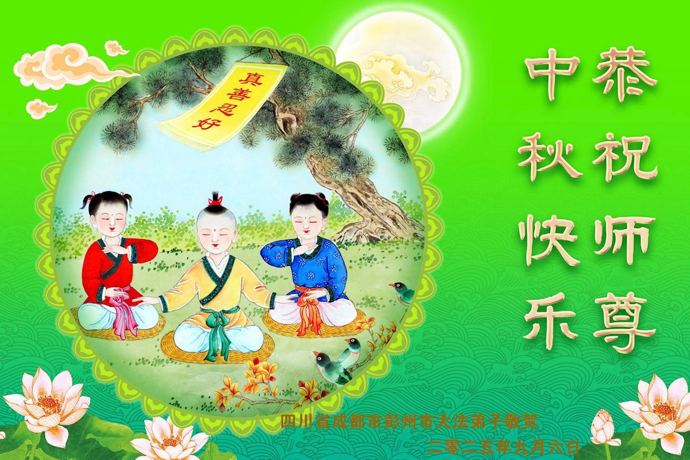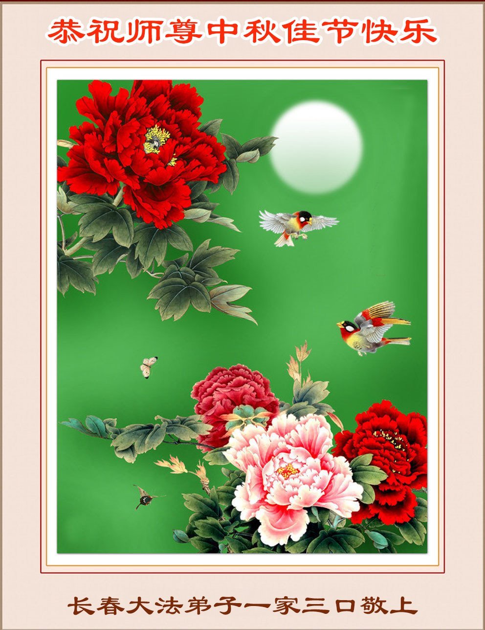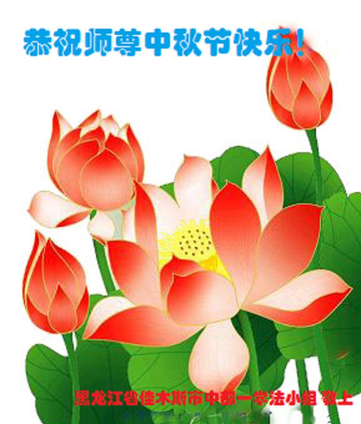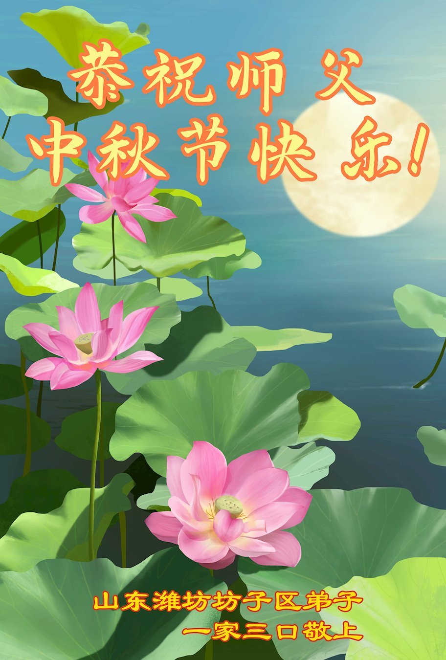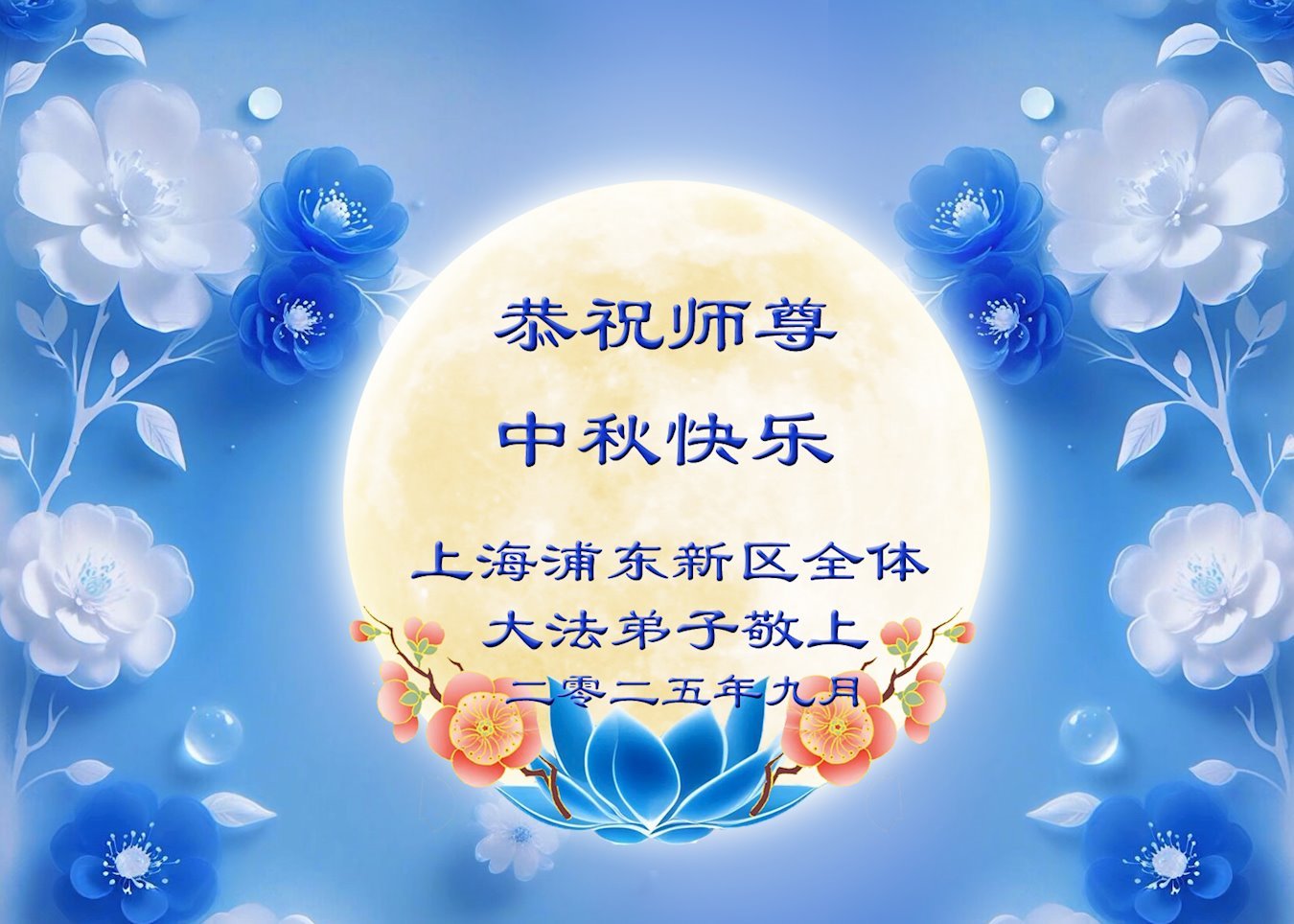 敬祝地球上最最尊敬的大法師父中秋節快樂!盼望大法師父早日回中國和您的弟子們團聚,願您的弟子們早日脫離苦海!也祝福大師的弟子們中秋快樂!