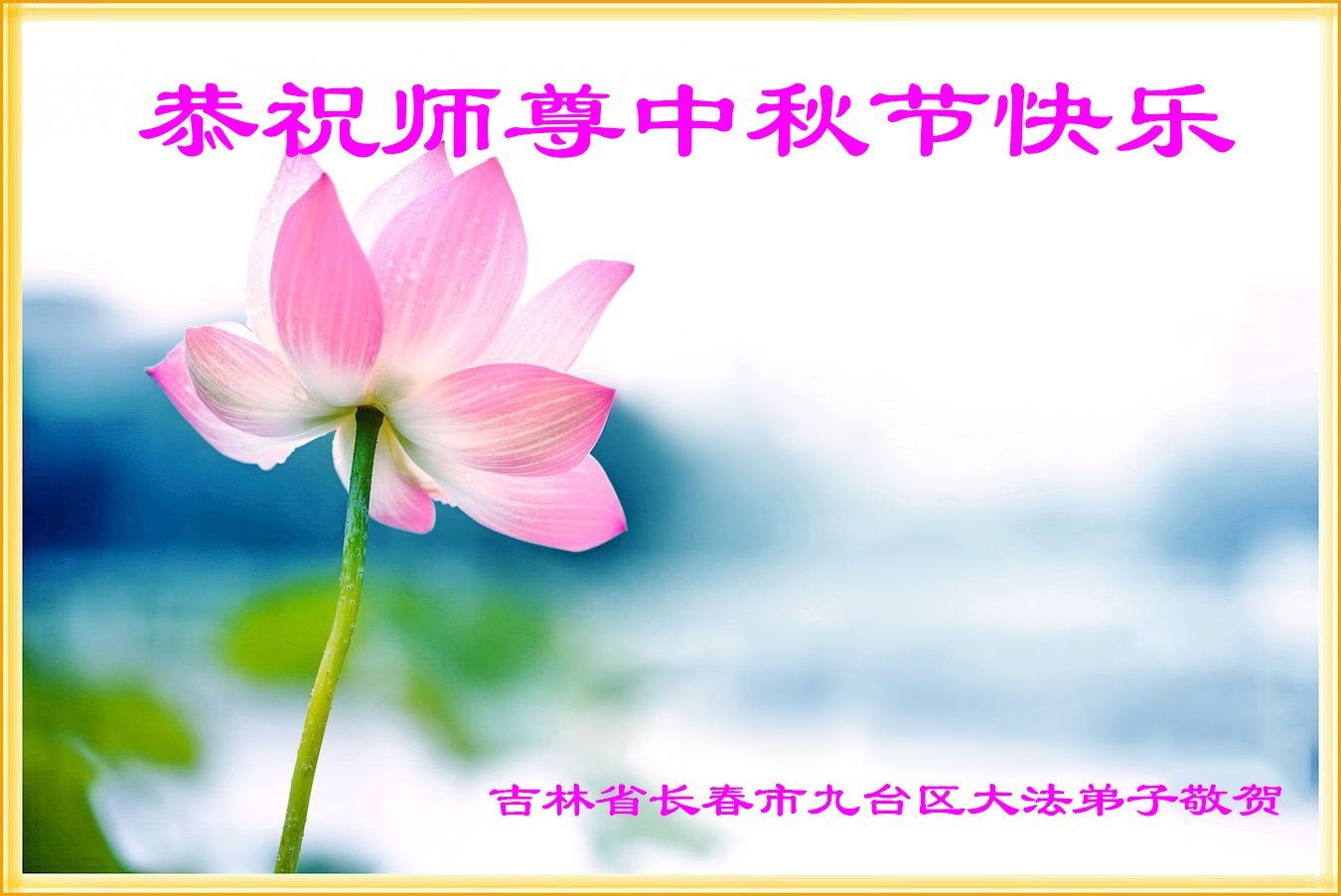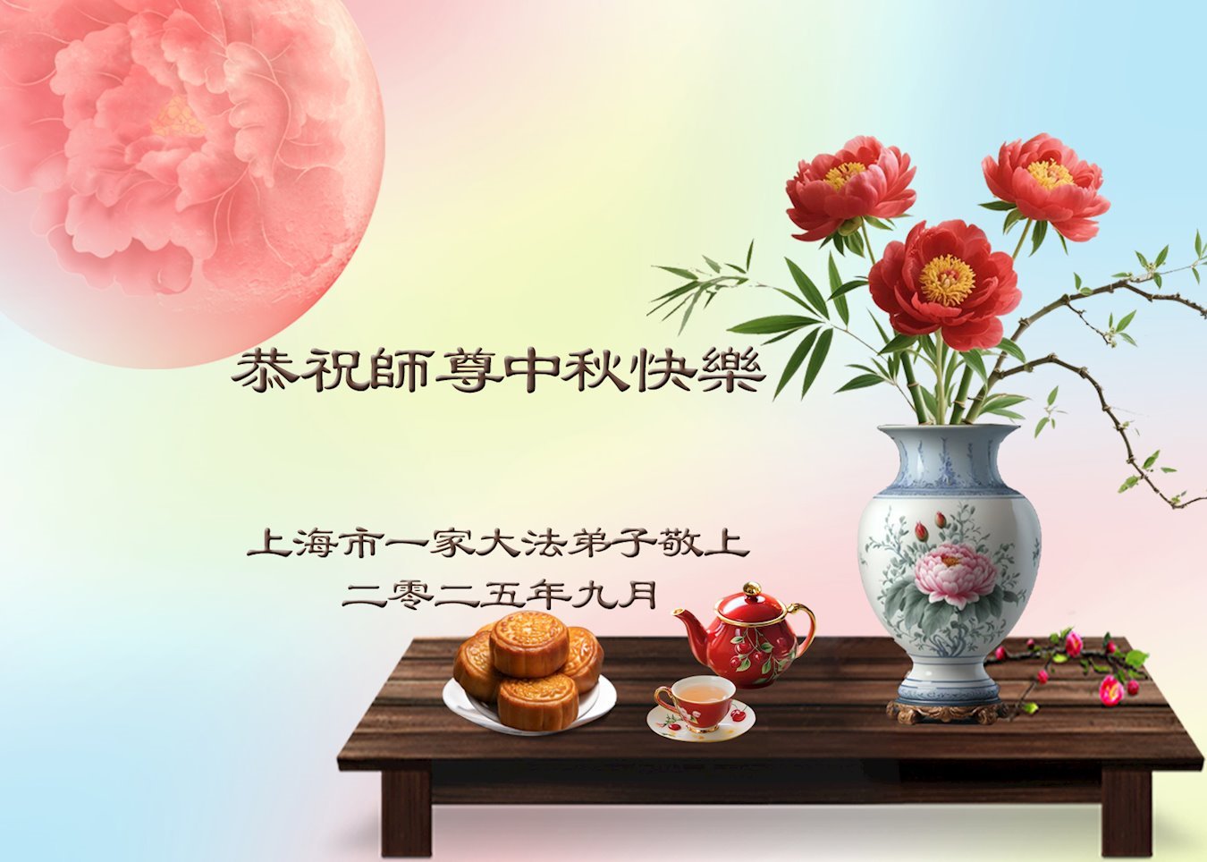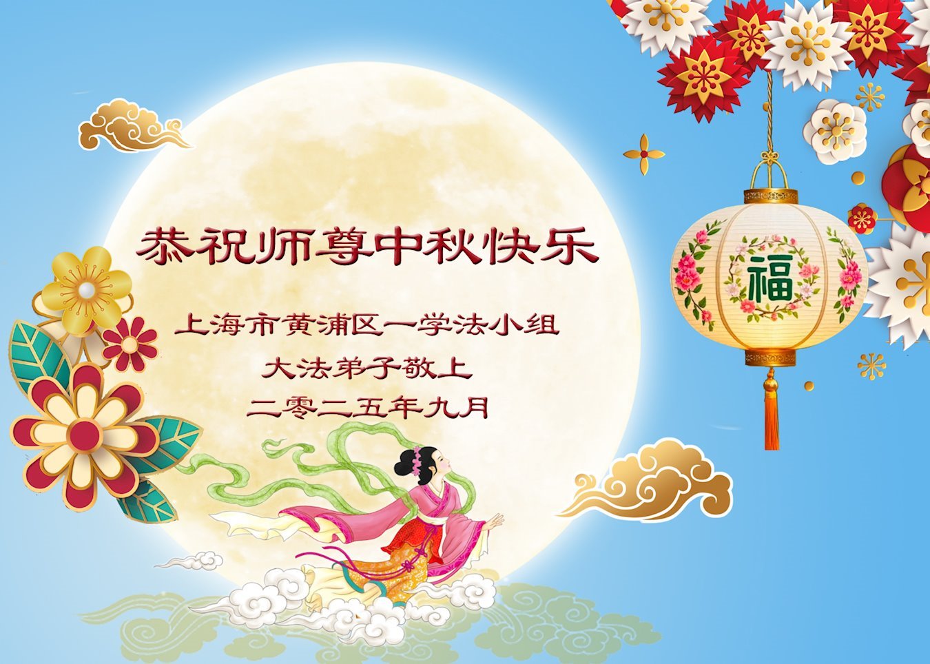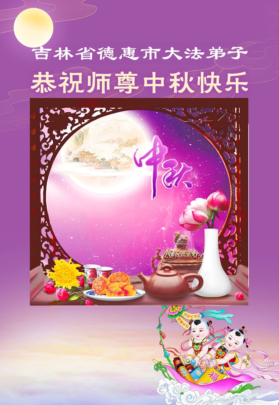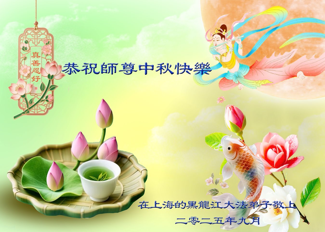 敬祝地球上最最尊敬的大法師父中秋節快樂!盼望大法師父早日回中國和您的弟子們團聚,願您的弟子們早日脫離苦海!也祝福大師的弟子們中秋快樂!