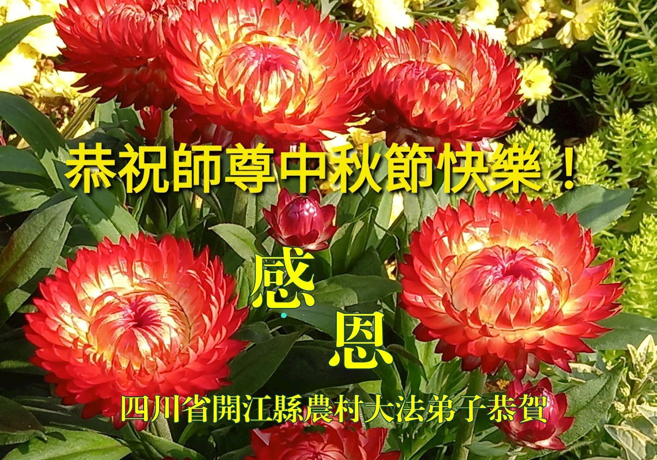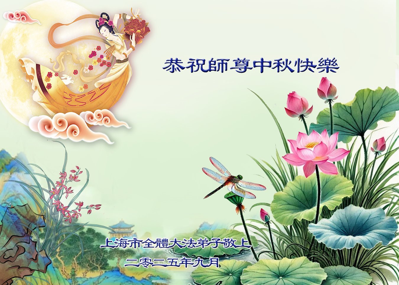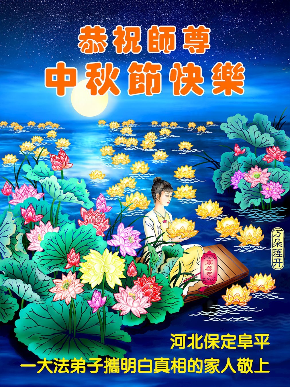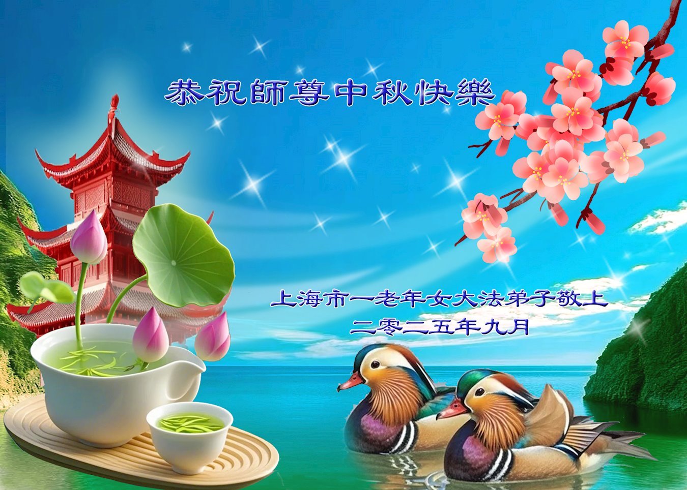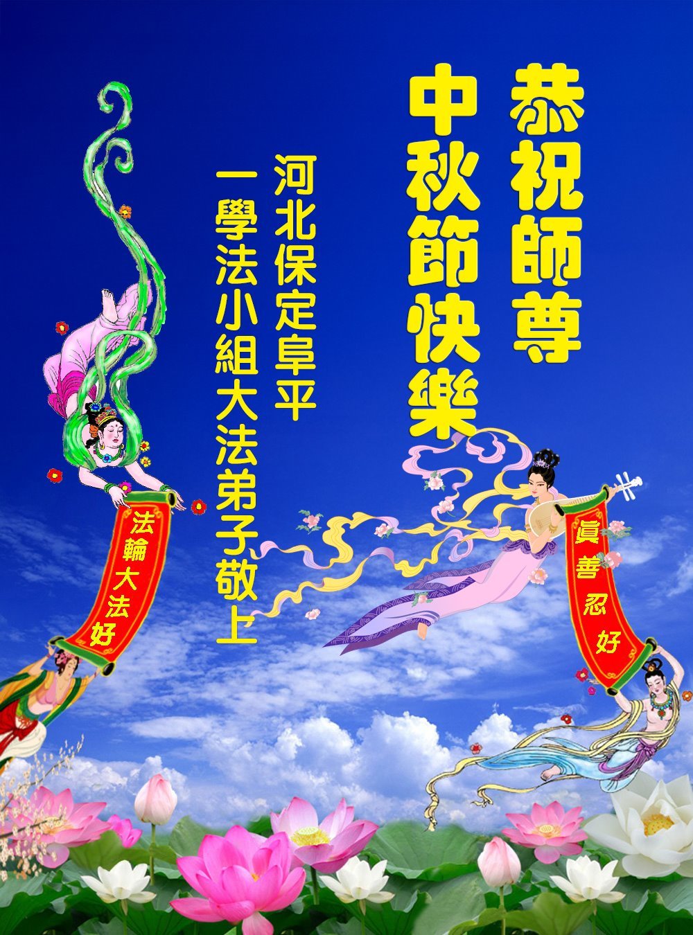 敬祝地球上最最尊敬的大法師父中秋節快樂!盼望大法師父早日回中國和您的弟子們團聚,願您的弟子們早日脫離苦海!也祝福大師的弟子們中秋快樂!