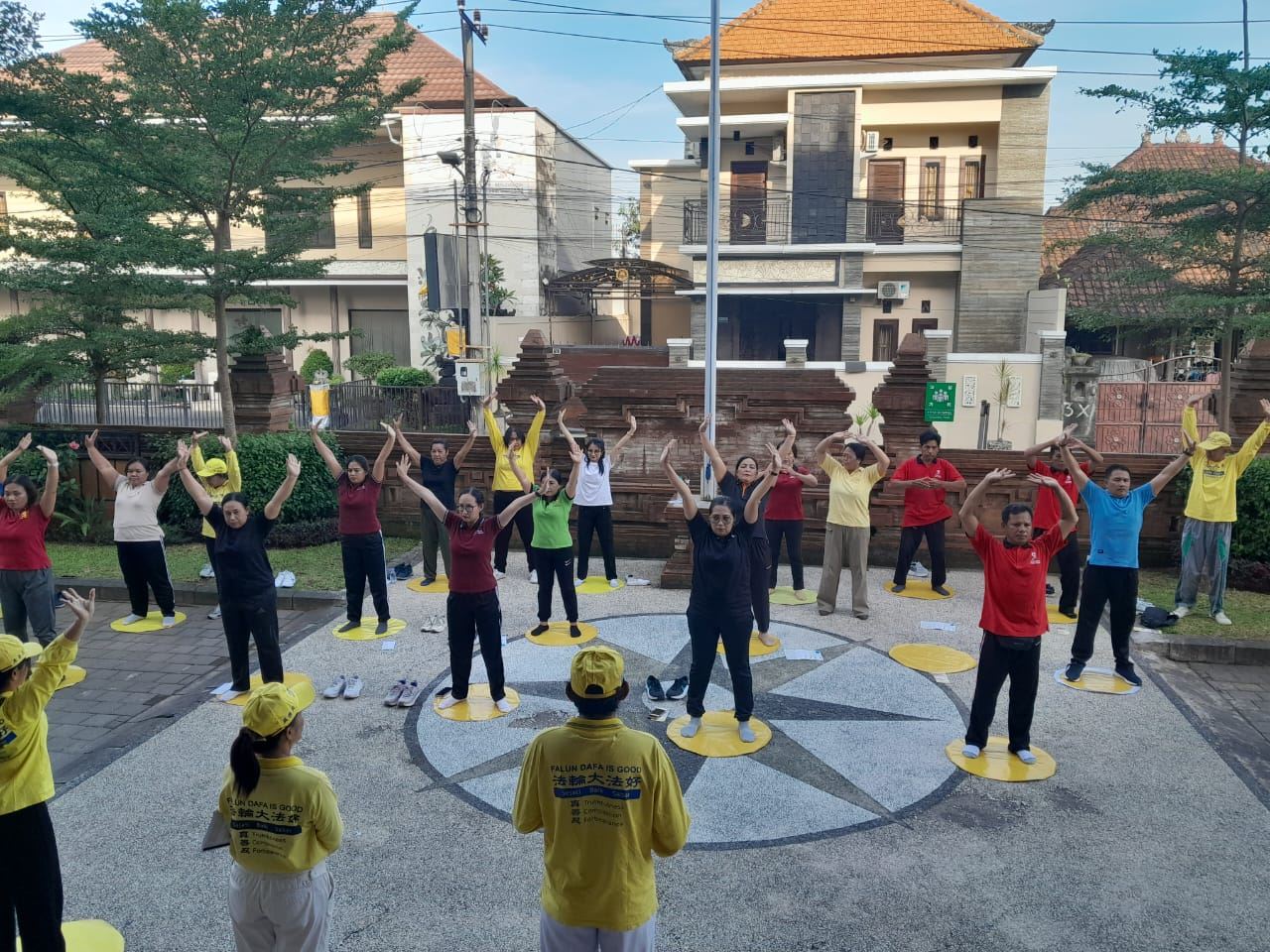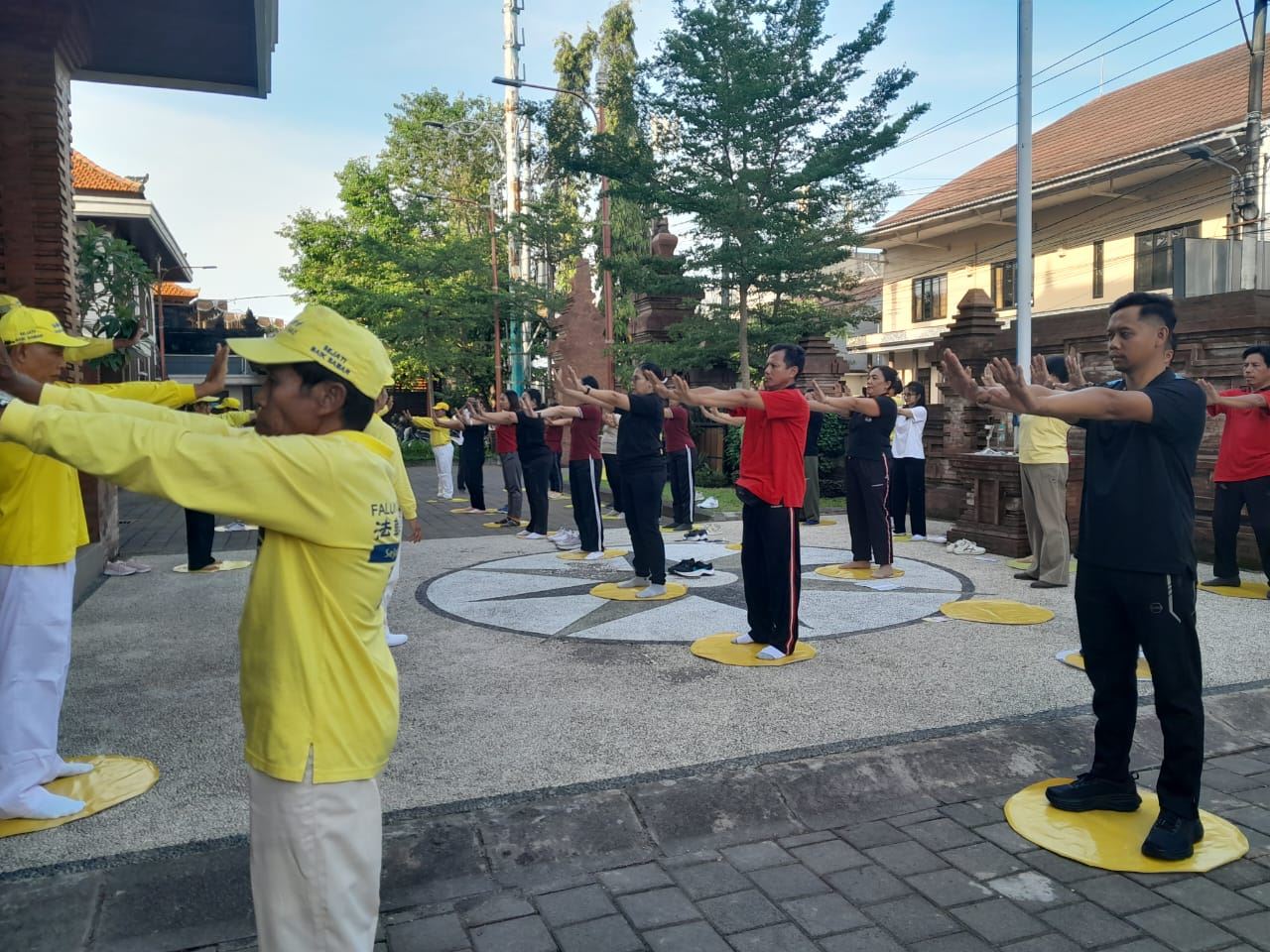 【明慧網二零二五年十月三十日】二零二五年十月二十四日(星期五),印尼法輪大法學員在巴釐省巴東縣北庫塔區(the North Kuta Subdistrict Office in Badung Regency, Bali)政府教功。