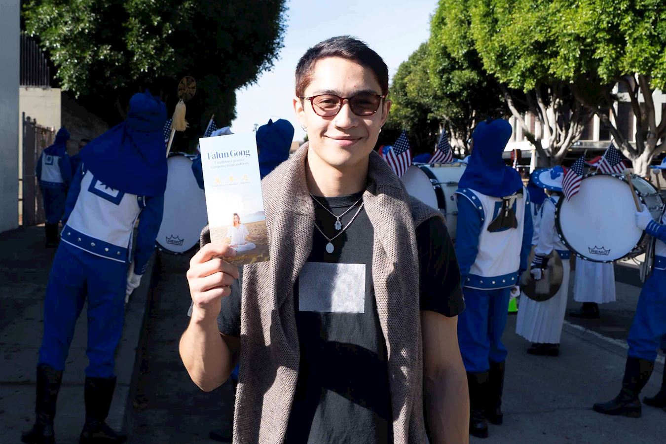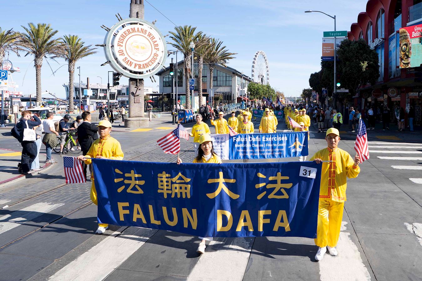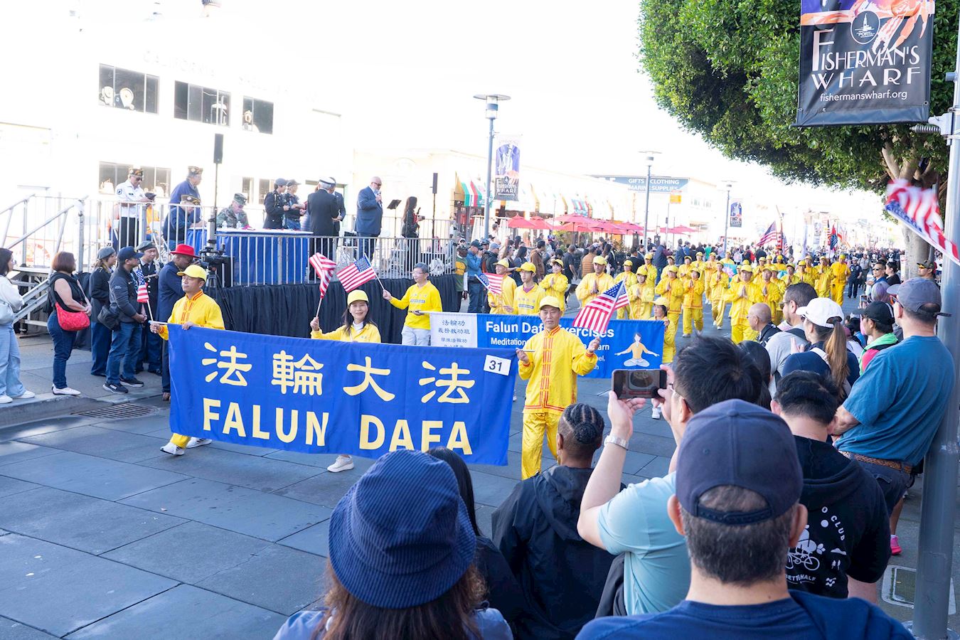 法輪功學員的隊伍由美西天國樂團和煉功隊組成。天國樂團為觀眾帶來了《法輪大法好》和《美國國歌》等樂曲,受到觀眾的歡迎。法輪功學員的功法演示讓觀眾感到放鬆,心情愉悅。
