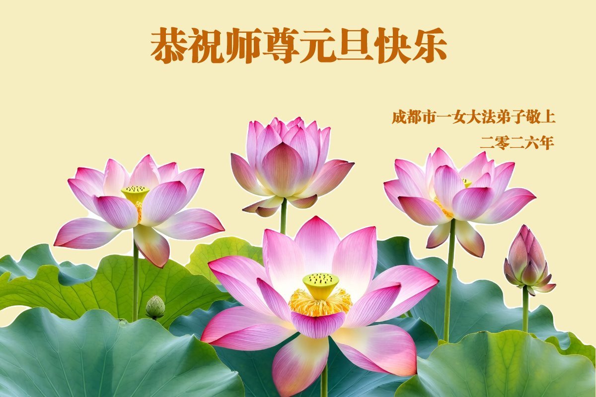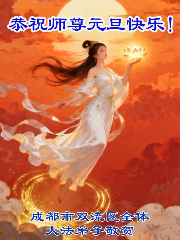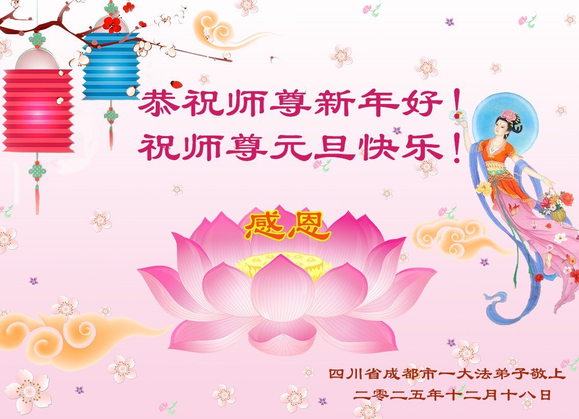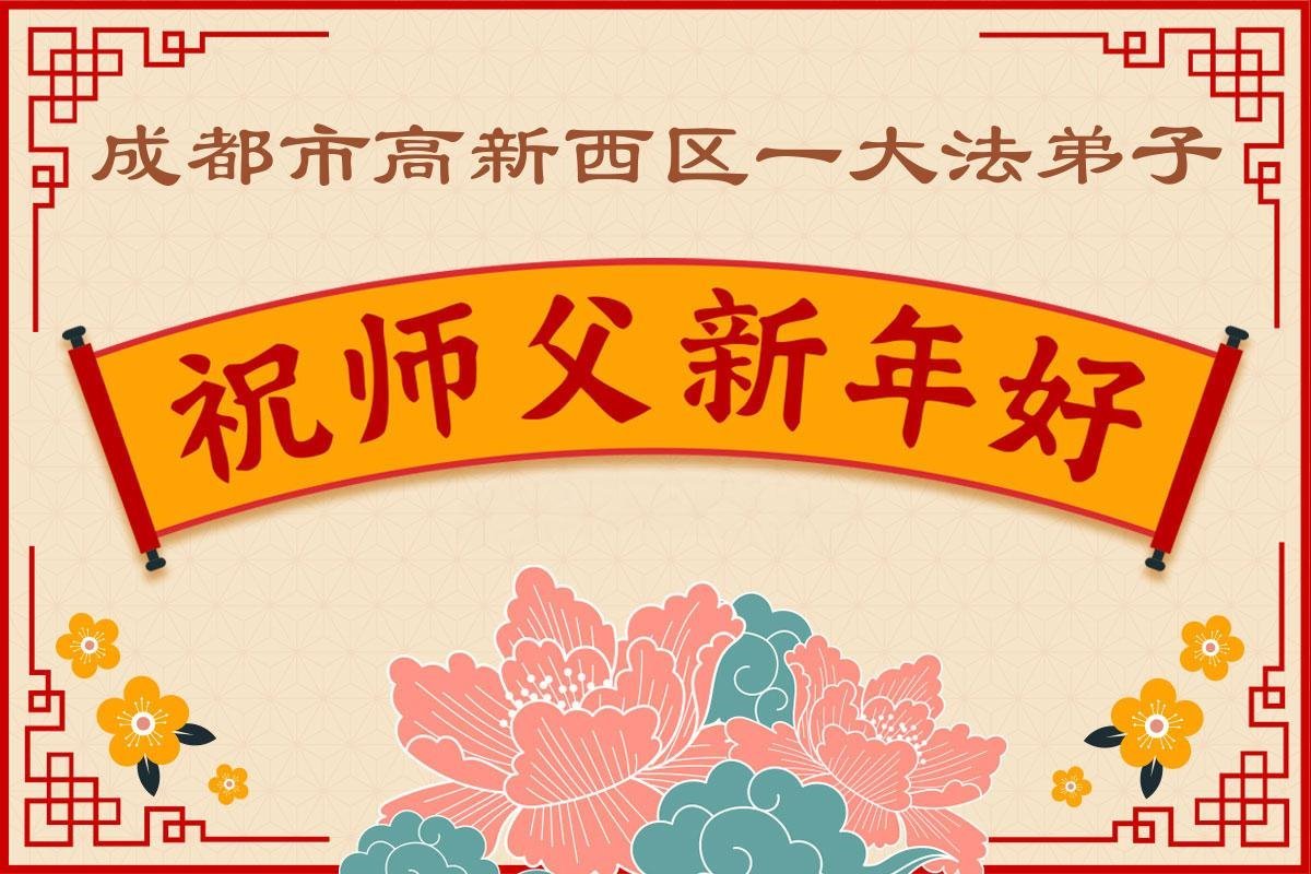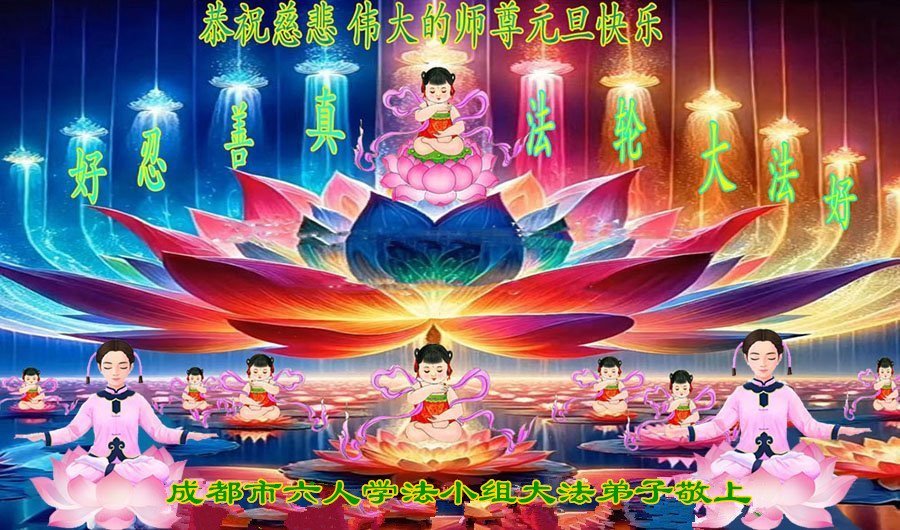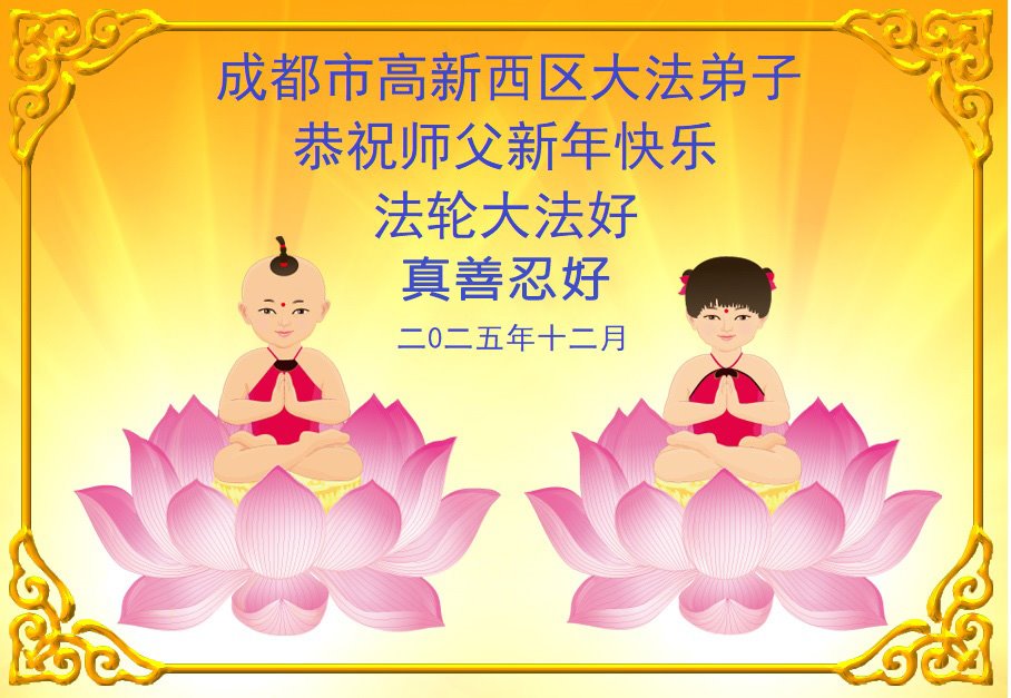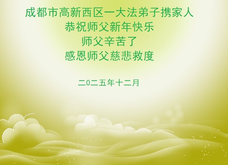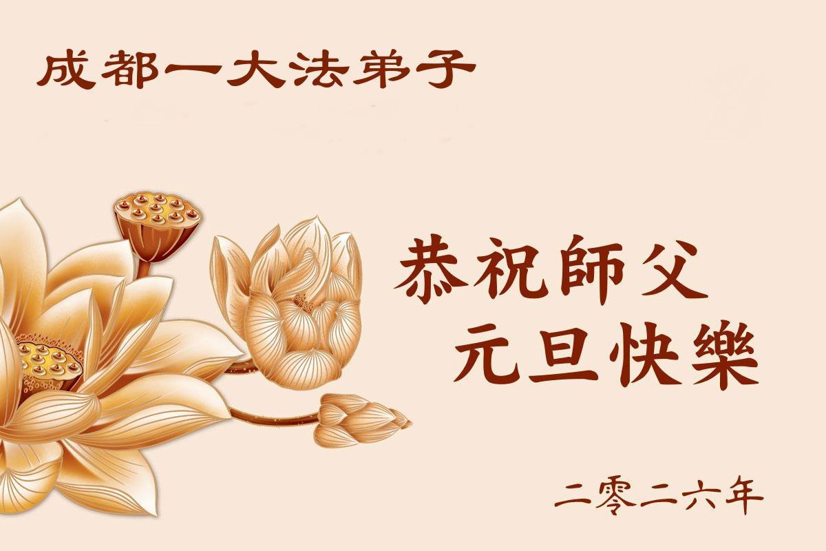 尊敬的師父好,師父您辛苦了!成都工商界大法弟子向師父問好,恭祝師父2026年元旦快樂!每學法深入一點,就更加能體會到師父為救眾生的巨大付出。世間一切皆為法而來,一切幻相皆為人心而設。願我們不為人心所動,走好最後的路,不負師父期望。弟子叩謝師父!