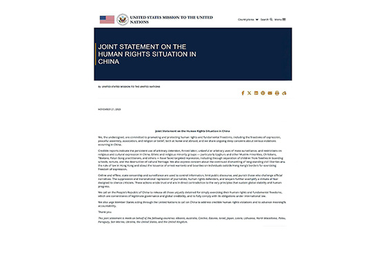 十一月二十一日,美國等十五個聯合國成員國發表關於中國人權狀況的聯合聲明,譴責中共有針對性的迫害維吾爾族和其他穆斯林少數群體、基督徒、藏族、法輪功修煉者等群體,敦促各成員國推進有意義的問責。