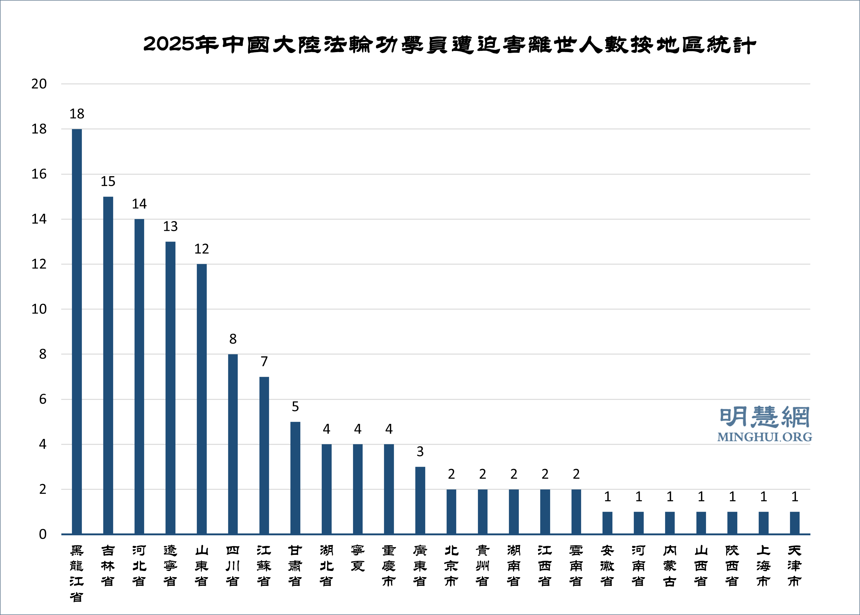 ![]() 圖1:2025年中國大陸法輪功學員遭迫害離世人數按地區統計 |