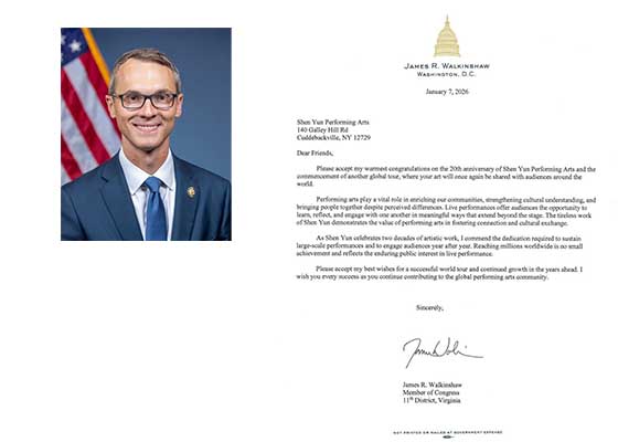 弗吉尼亞州聯邦眾議員詹姆斯﹒沃金肖致信祝賀神韻藝術團成立20週年,並讚揚其再度開啟全球巡演,將神韻藝術之美呈現給世界各地觀眾。