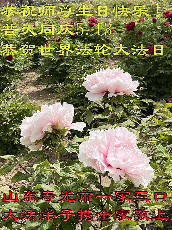 謹以盛開的數朵國色天香之牡丹表達弟子對師尊無限聖恩、無量慈悲的感恩!眾大法弟子仰望師尊,恭祝師尊生日快樂!