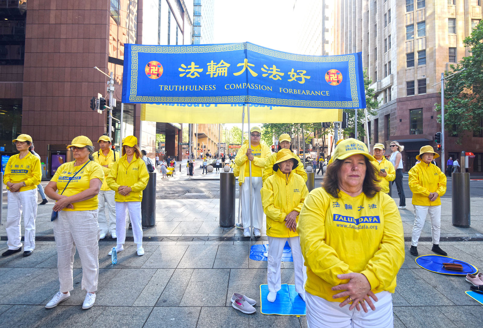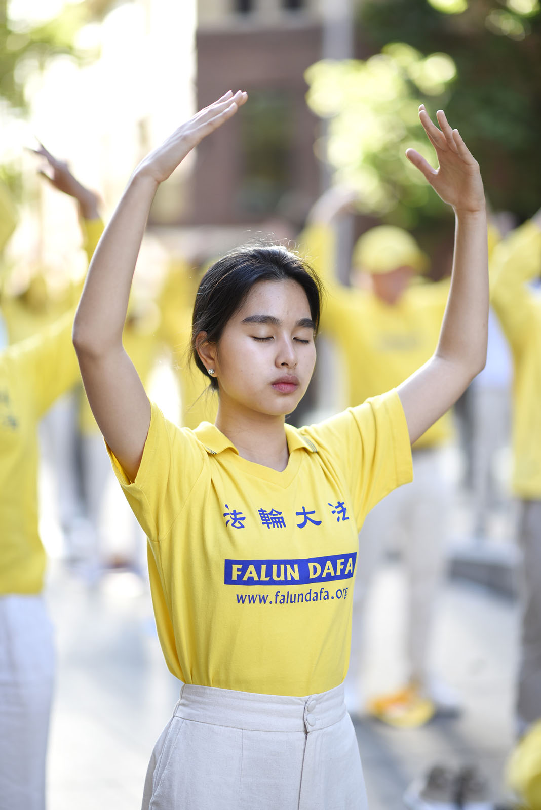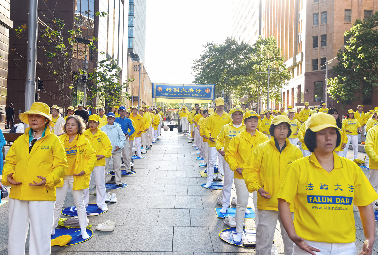 在悠揚的煉功音樂中,法輪功學員展示了舒緩的五套功法,向人們傳遞法輪大法的美好。清晨的燦爛陽光,洒在馬丁廣場,也開啟了連續三天系列活動的序幕──迎接二零二五年度澳洲法輪大法修煉心得交流會的召開。晨煉之後,法輪功學員從馬丁廣場出發舉行了大遊行。