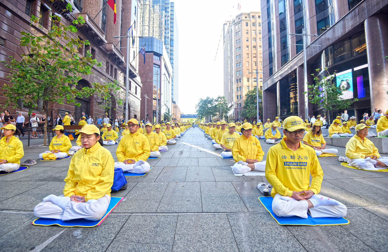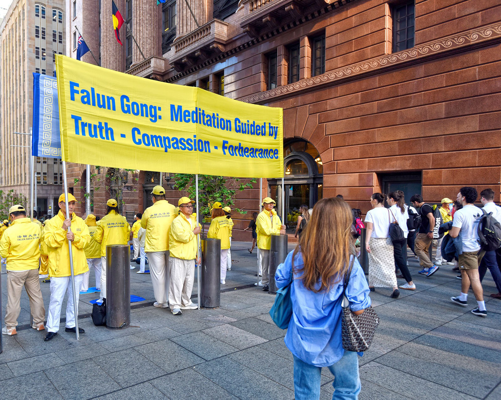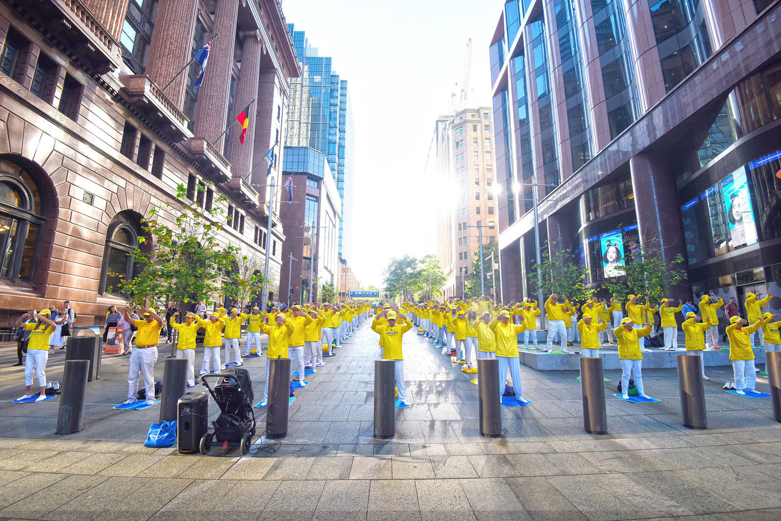 在悠揚的煉功音樂中,法輪功學員展示了舒緩的五套功法,向人們傳遞法輪大法的美好。清晨的燦爛陽光,洒在馬丁廣場,也開啟了連續三天系列活動的序幕──迎接二零二五年度澳洲法輪大法修煉心得交流會的召開。晨煉之後,法輪功學員從馬丁廣場出發舉行了大遊行。