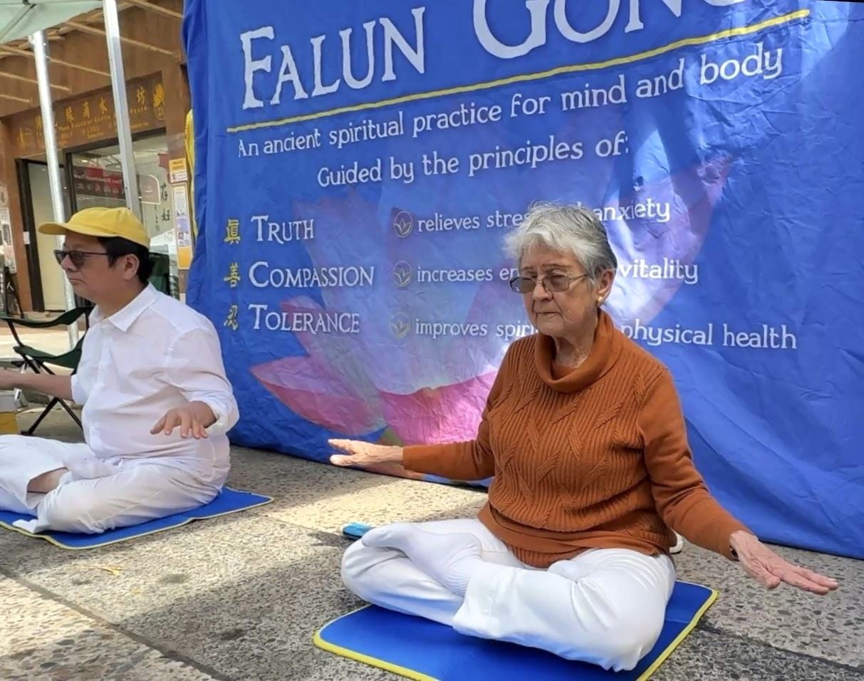 當天下午,伴隨著舒緩、祥和的煉功音樂,法輪功學員演示了法輪功五套功法。純正的能量,緩、慢、圓的功法,使不少人想學煉法輪功。
