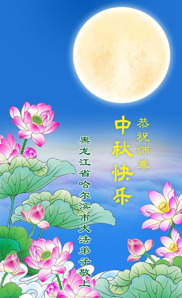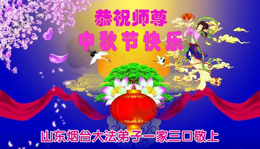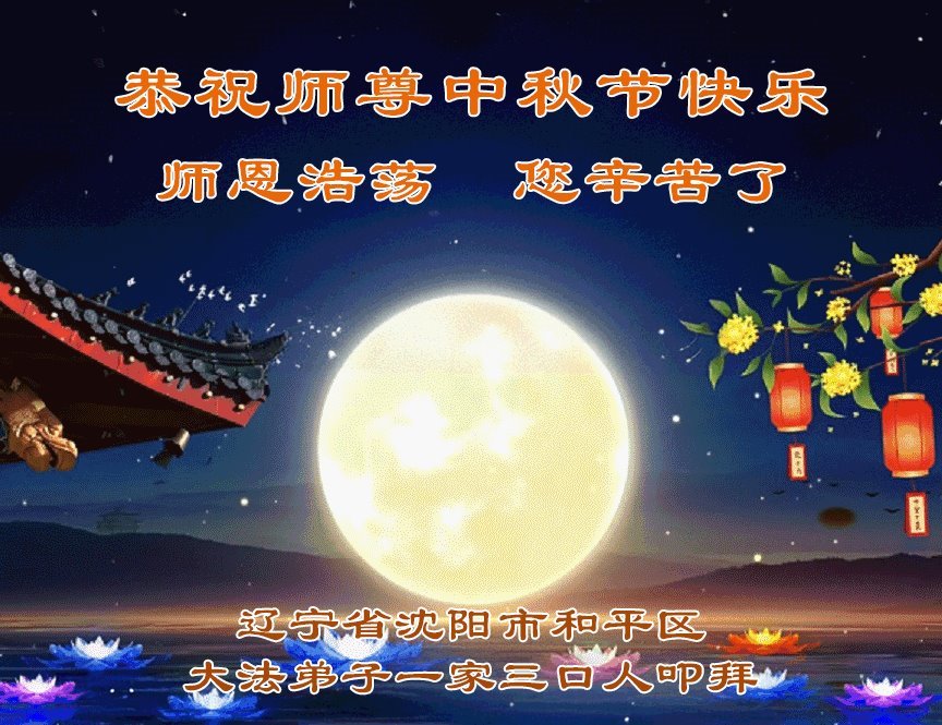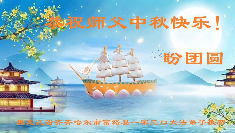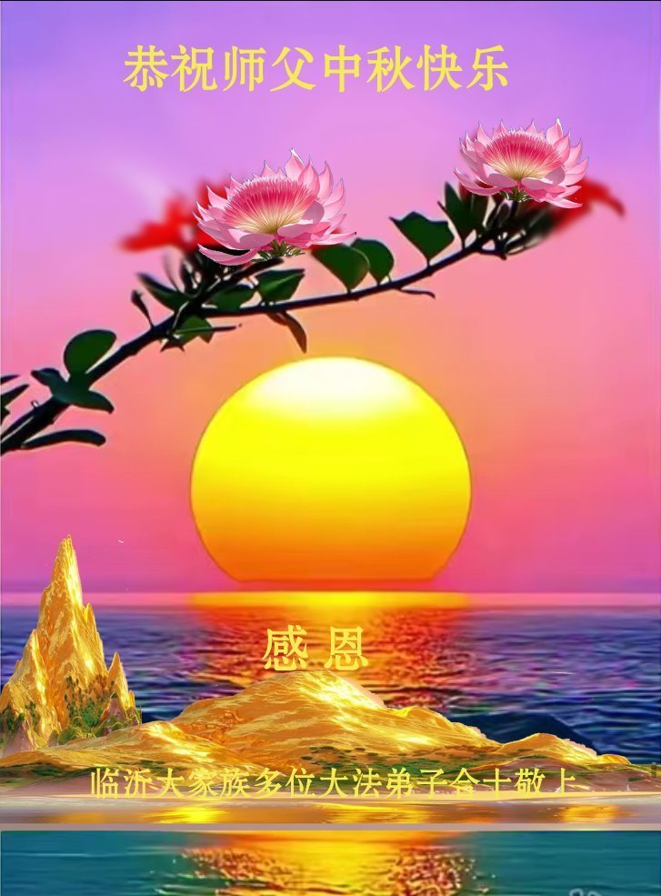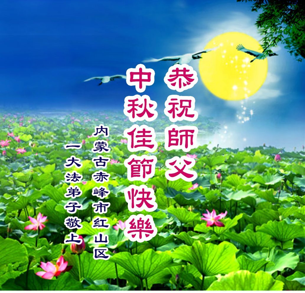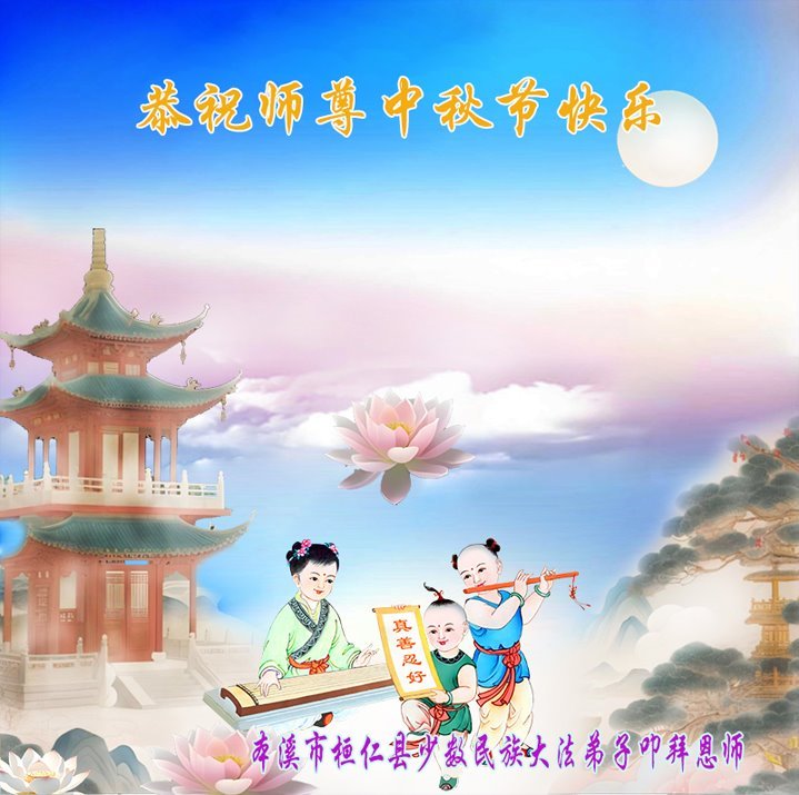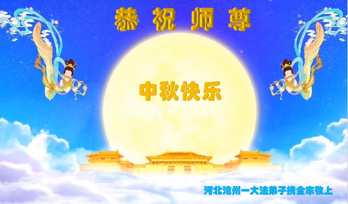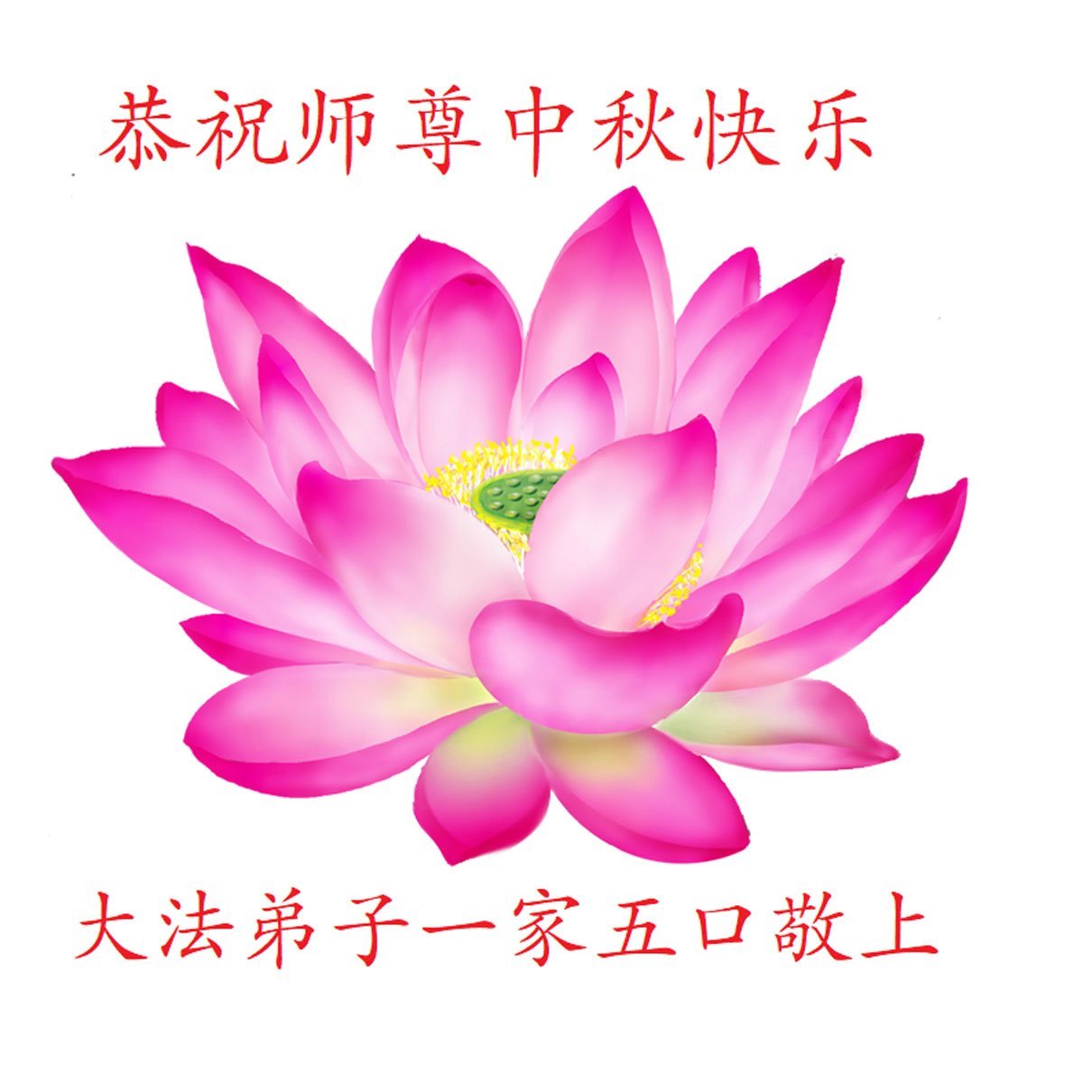 我們大法弟子攜家人和明真相的世人恭祝師尊中秋節快樂!師尊辛苦了!謝謝師尊的慈悲苦度!弟子一定破除舊勢力的安排,消除間隔,形成強大的整體,反迫害,救度眾生。弟子們要多學法,學好法,發好正念,向內找,兌現自己的誓約,跟師父回家。