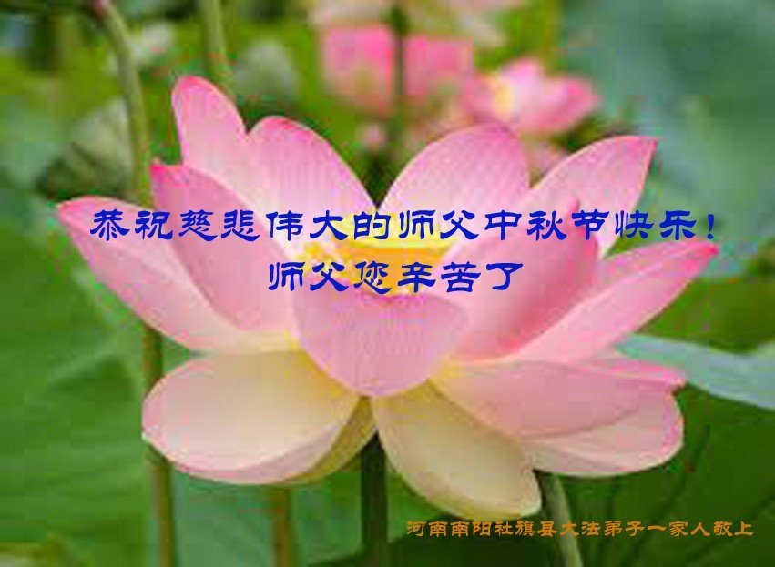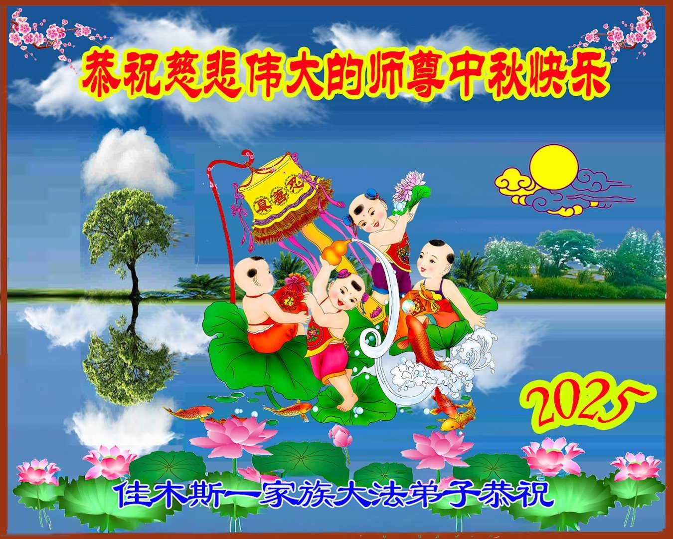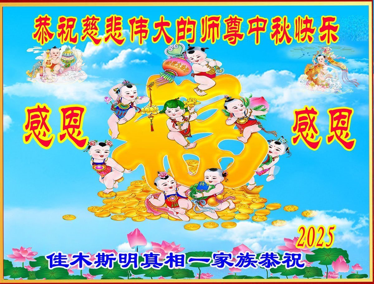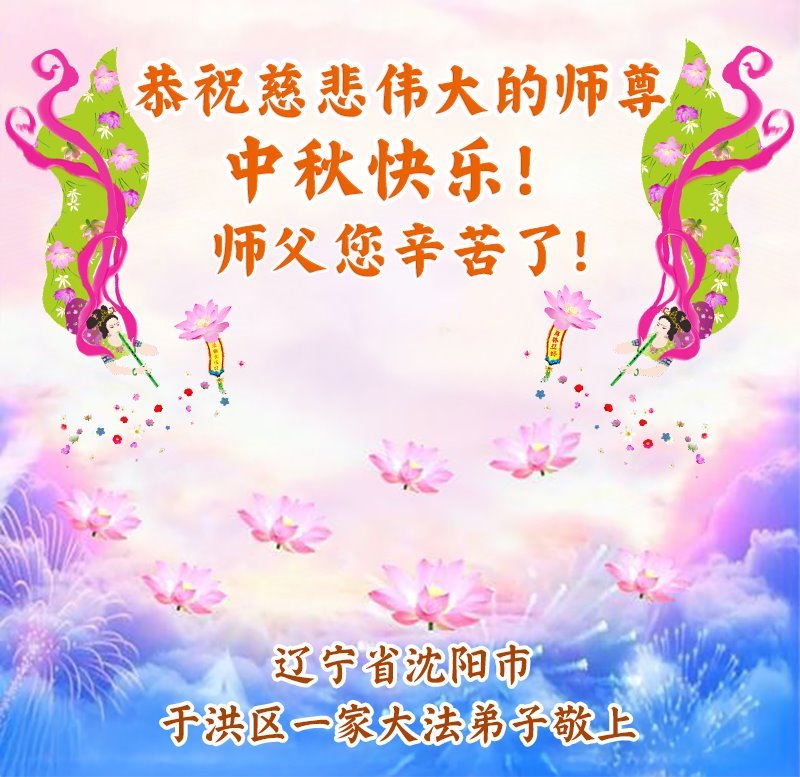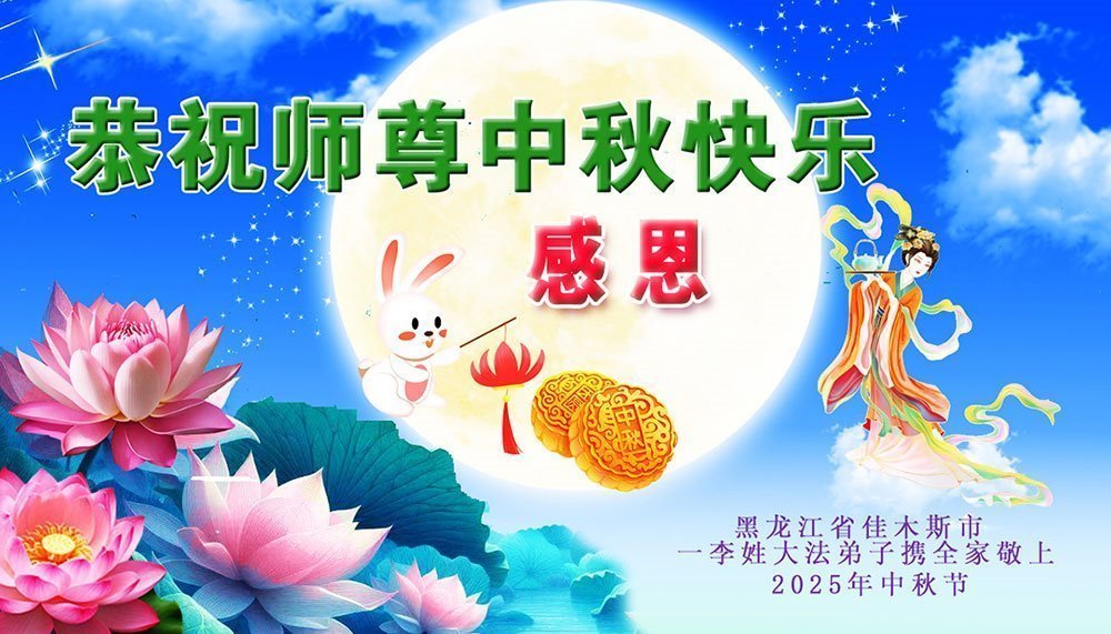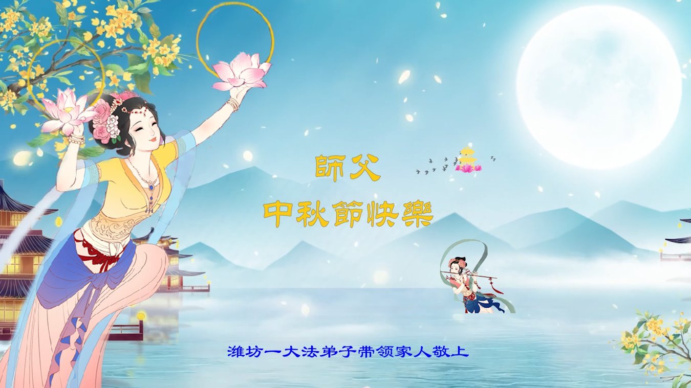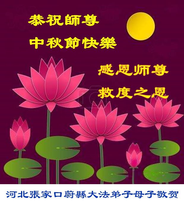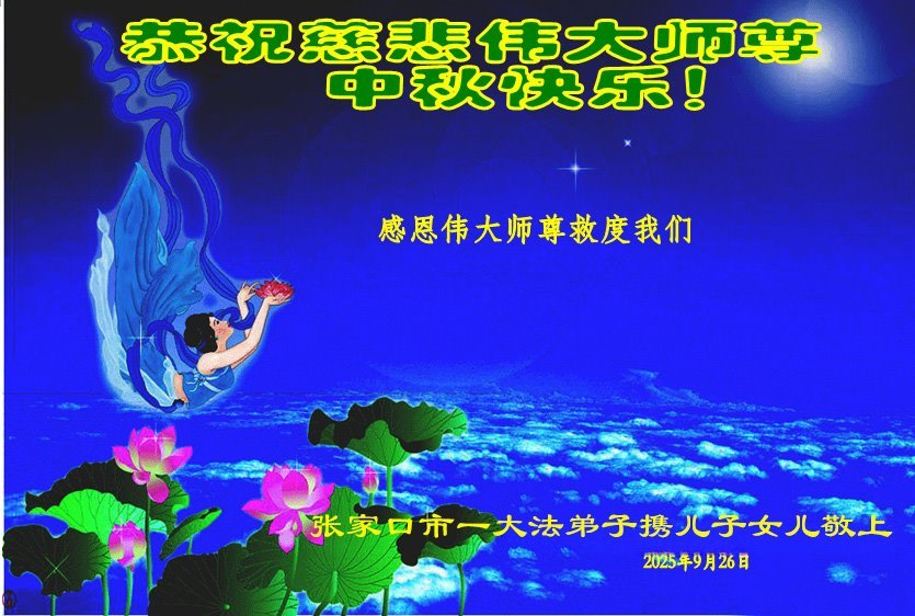 我們大法弟子攜家人和明真相的世人恭祝師尊中秋節快樂!師尊辛苦了!謝謝師尊的慈悲苦度!弟子一定破除舊勢力的安排,消除間隔,形成強大的整體,反迫害,救度眾生。弟子們要多學法,學好法,發好正念,向內找,兌現自己的誓約,跟師父回家。