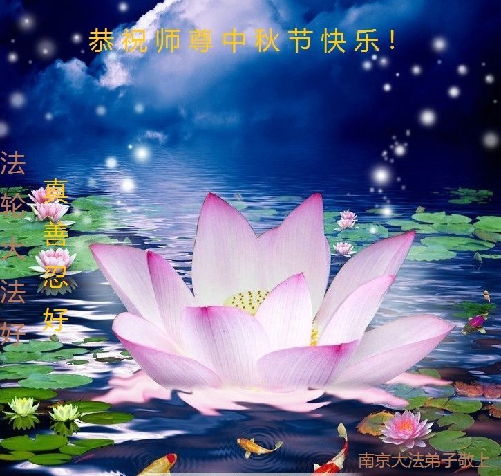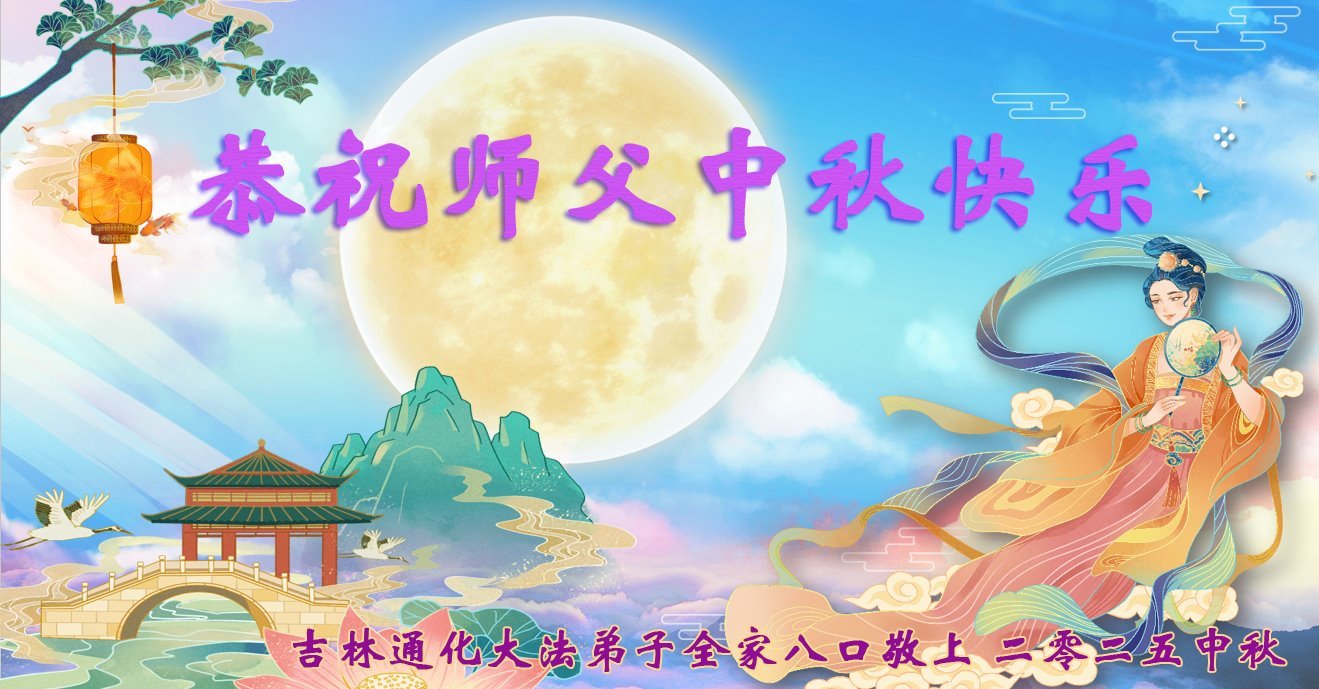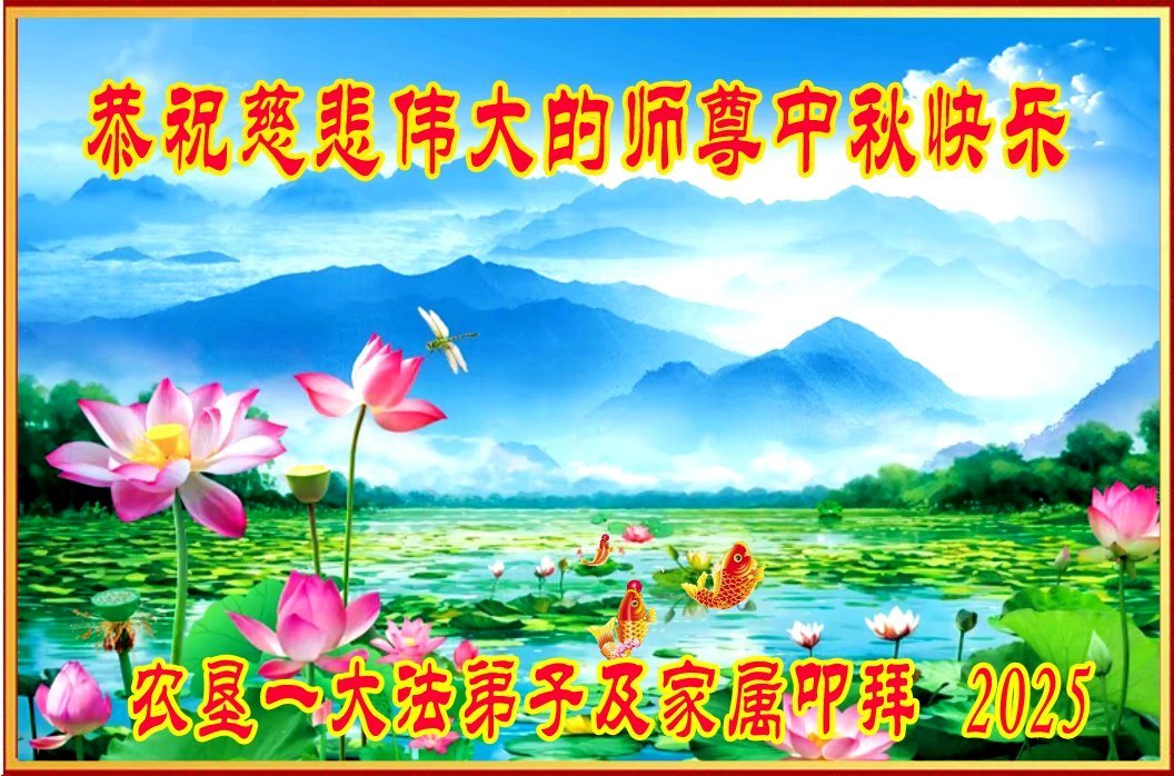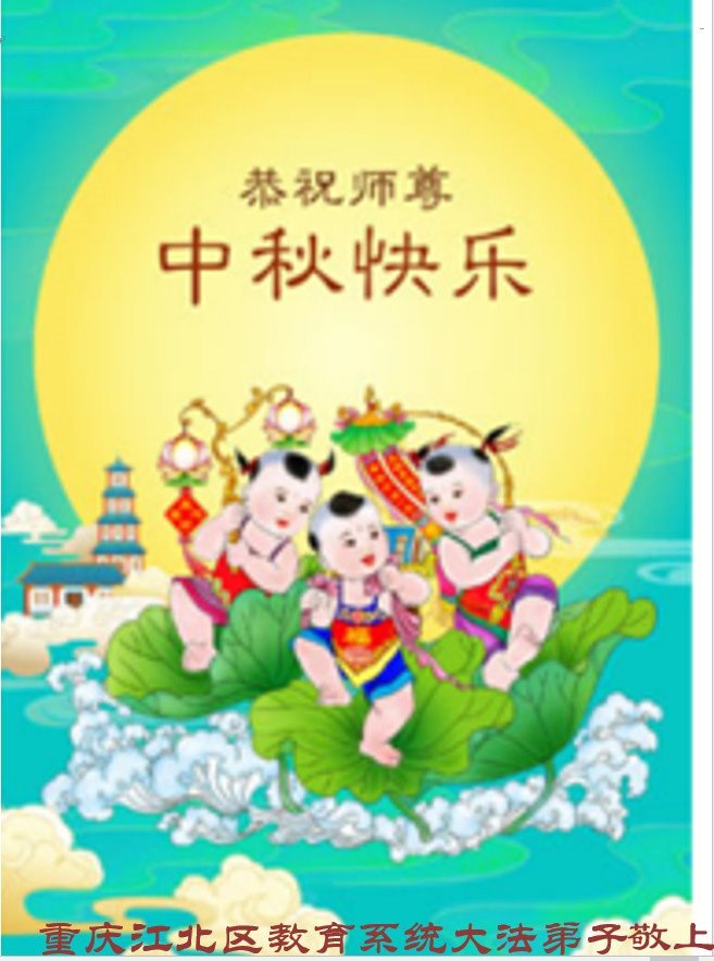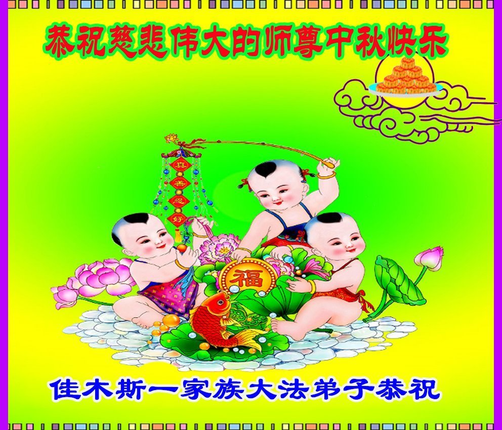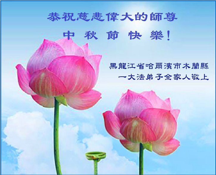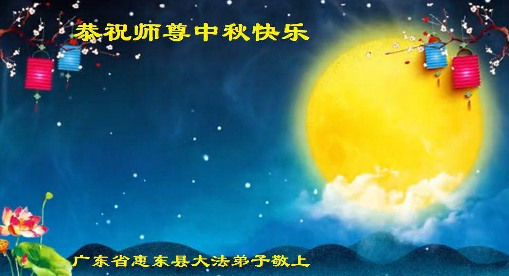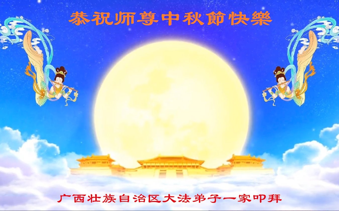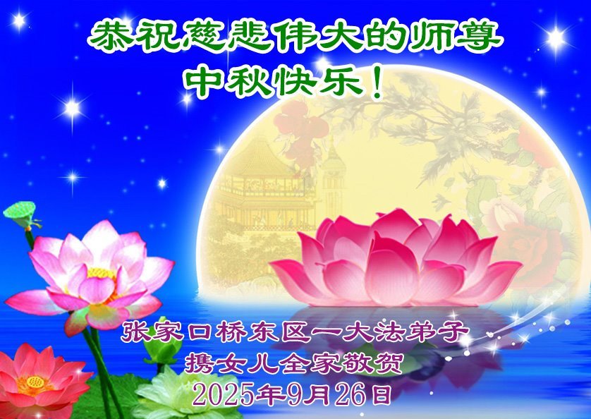 我們大法弟子攜家人和明真相的世人恭祝師尊中秋節快樂!師尊辛苦了!謝謝師尊的慈悲苦度!弟子一定破除舊勢力的安排,消除間隔,形成強大的整體,反迫害,救度眾生。弟子們要多學法,學好法,發好正念,向內找,兌現自己的誓約,跟師父回家。