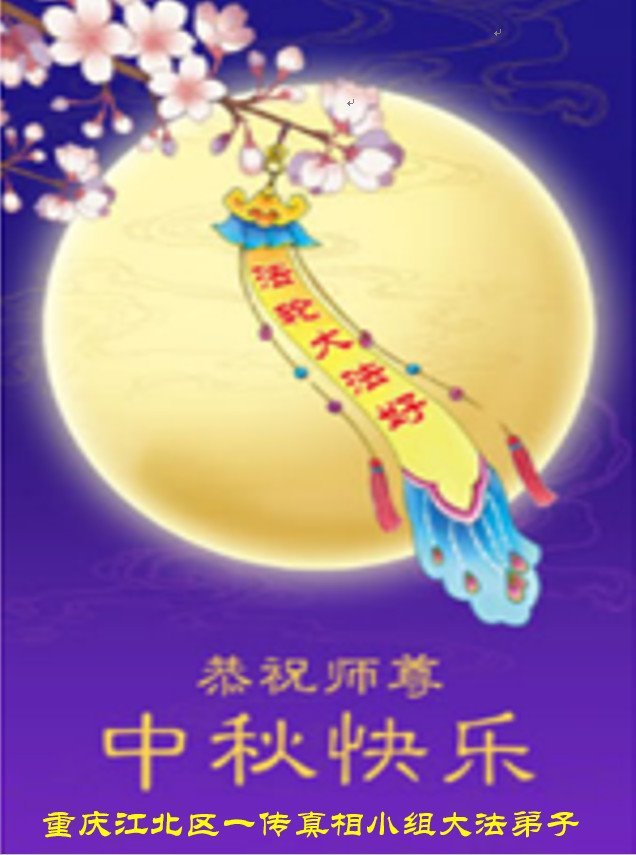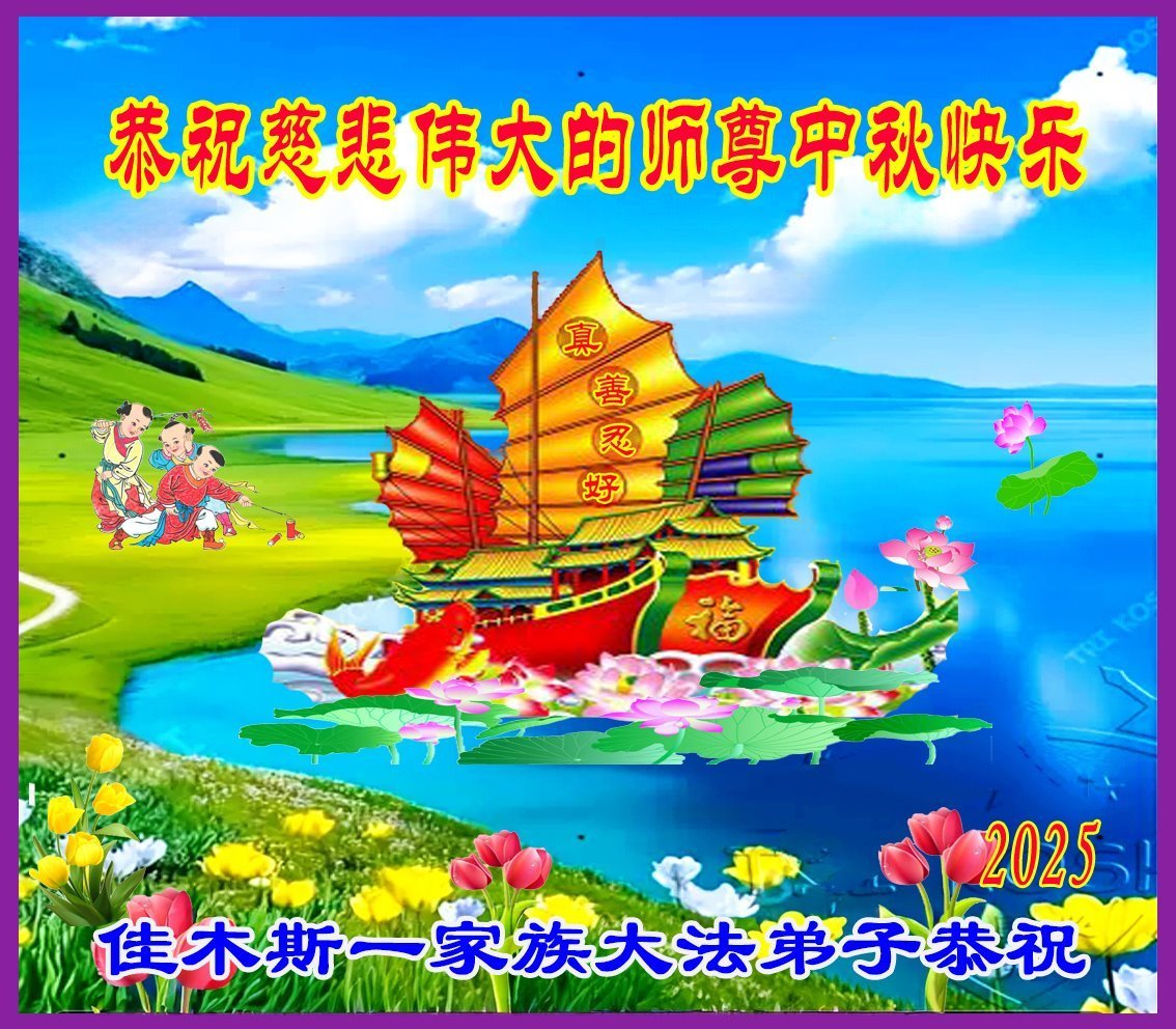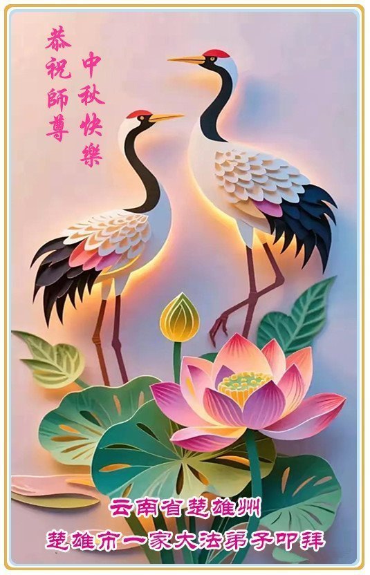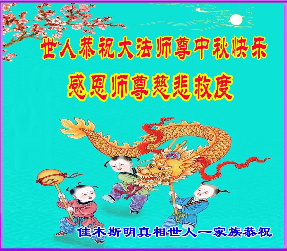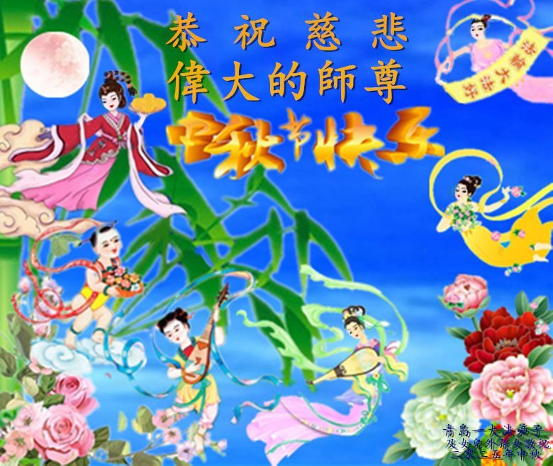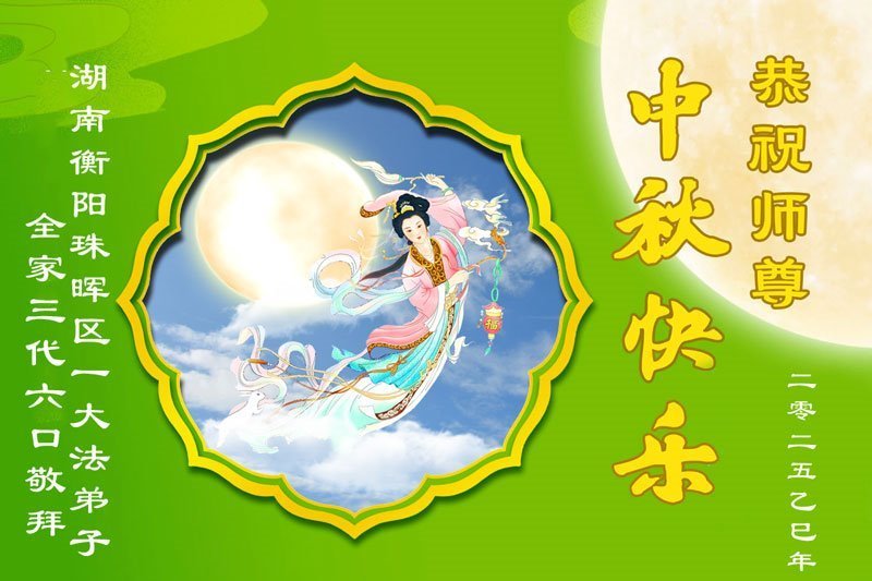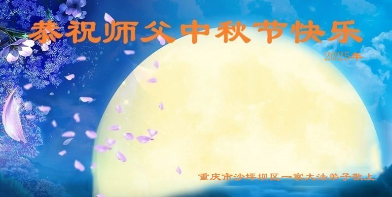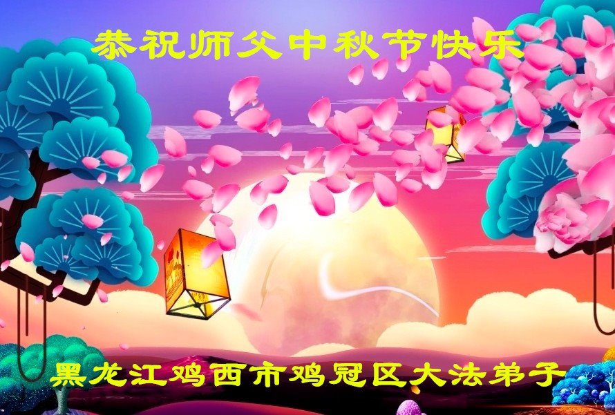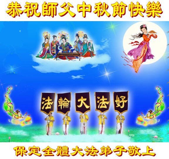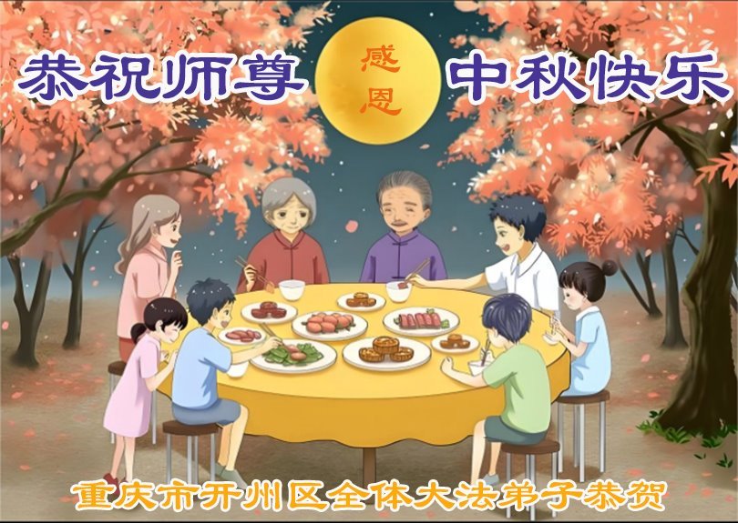 我們大法弟子攜家人和明真相的世人恭祝師尊中秋節快樂!師尊辛苦了!謝謝師尊的慈悲苦度!弟子一定破除舊勢力的安排,消除間隔,形成強大的整體,反迫害,救度眾生。弟子們要多學法,學好法,發好正念,向內找,兌現自己的誓約,跟師父回家。