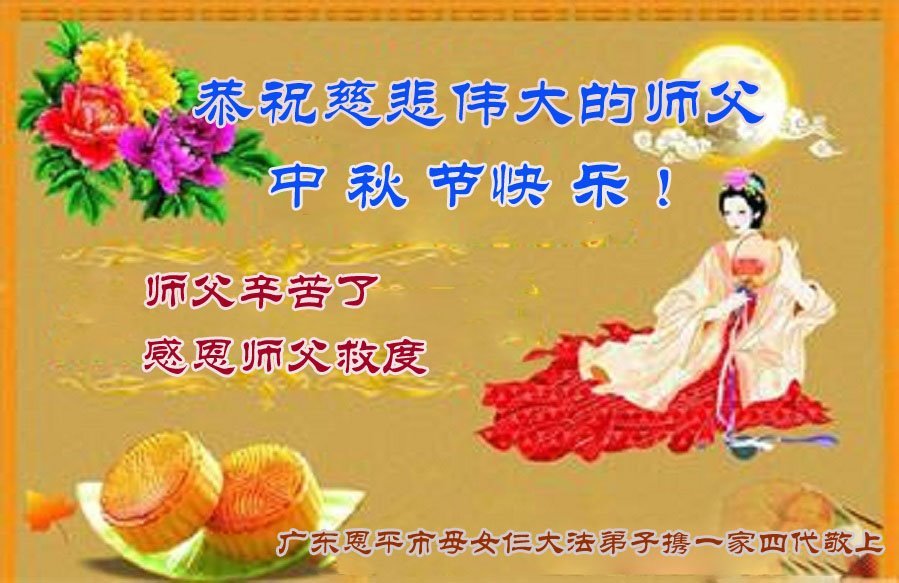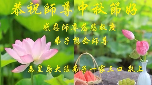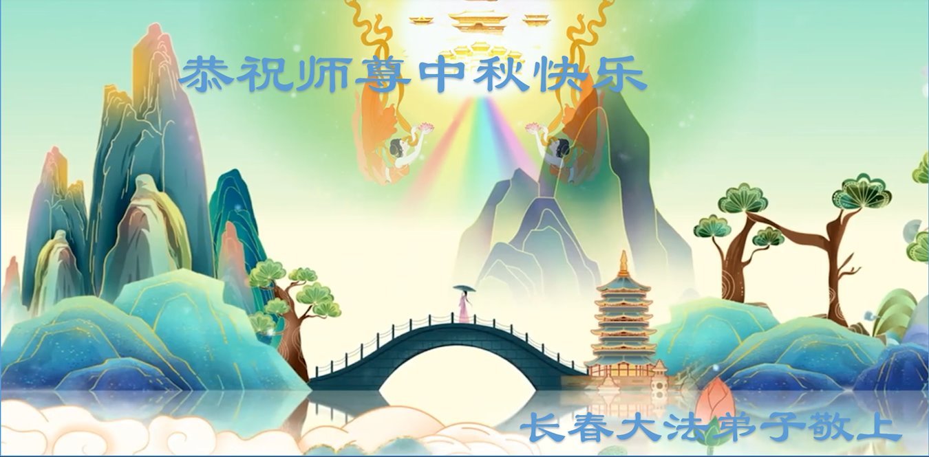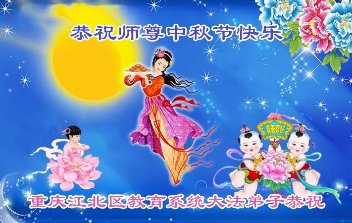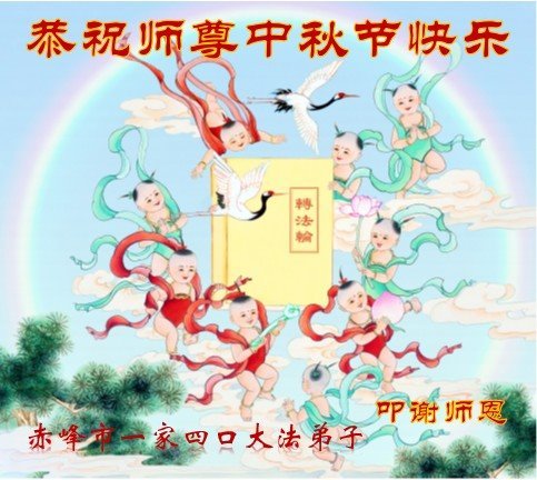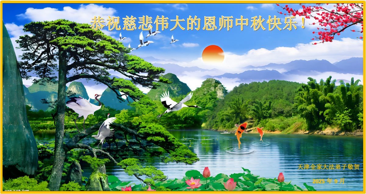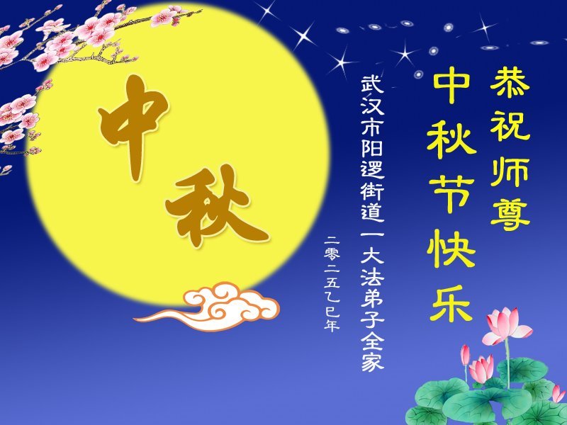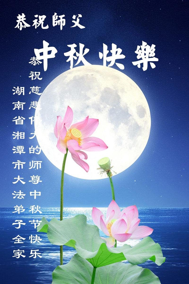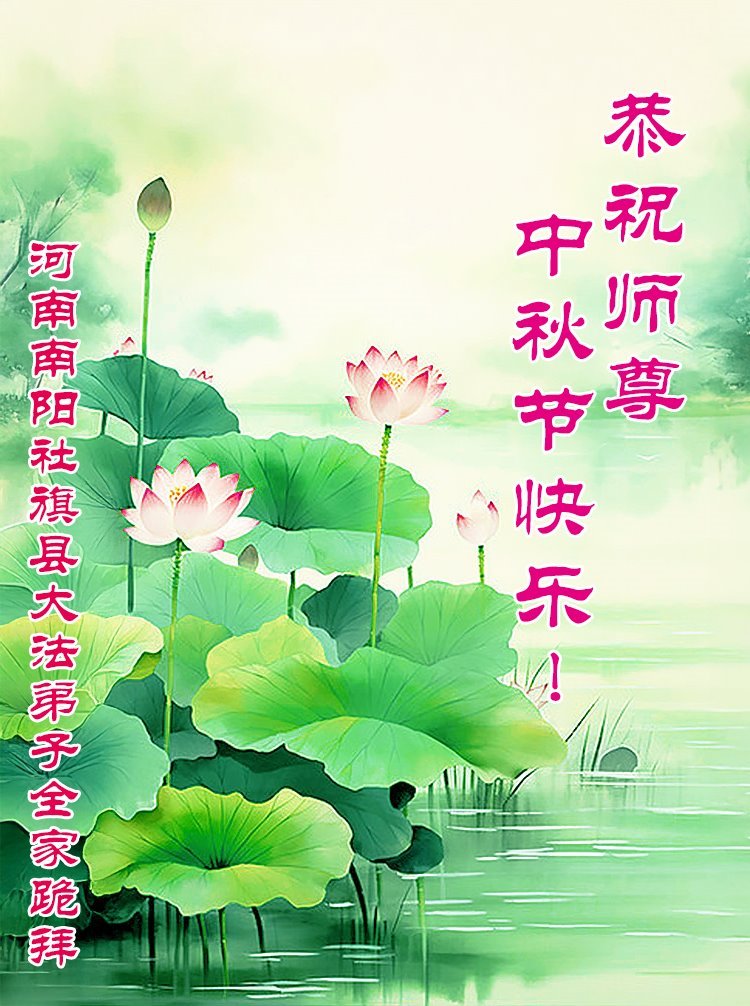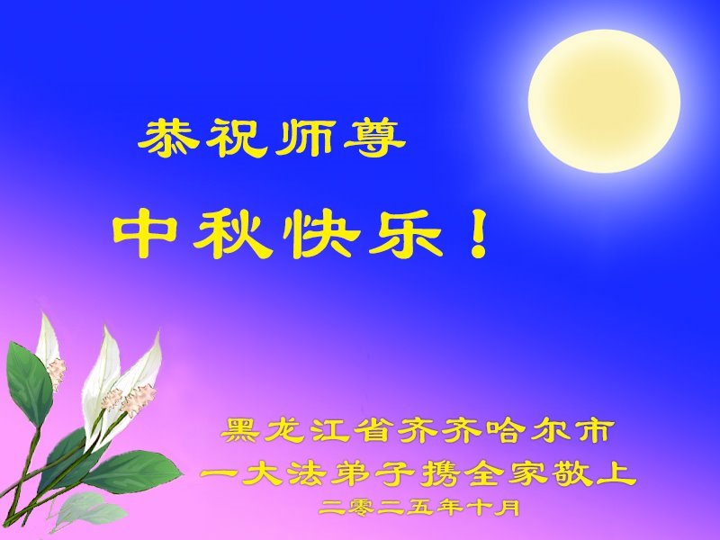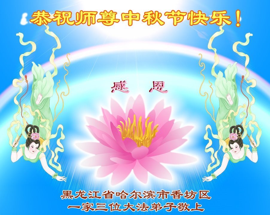 我們大法弟子攜家人和明真相的世人恭祝師尊中秋節快樂!師尊辛苦了!謝謝師尊的慈悲苦度!弟子一定破除舊勢力的安排,消除間隔,形成強大的整體,反迫害,救度眾生。弟子們要多學法,學好法,發好正念,向內找,兌現自己的誓約,跟師父回家。
