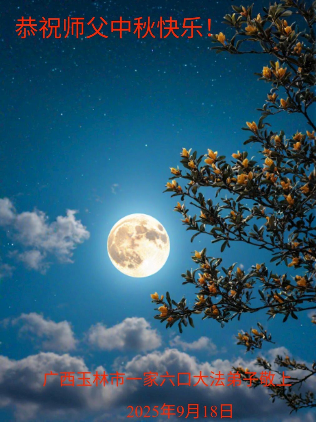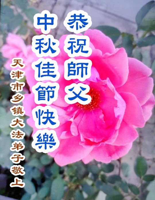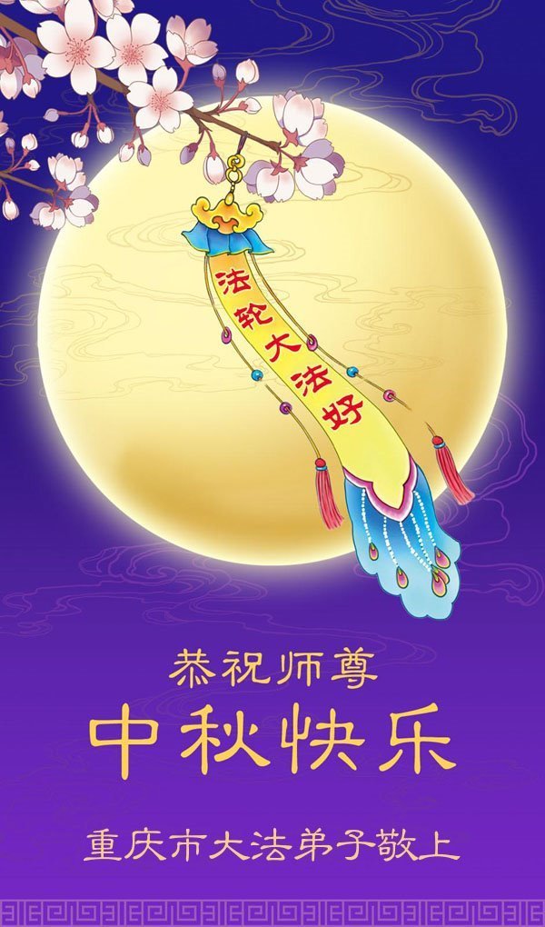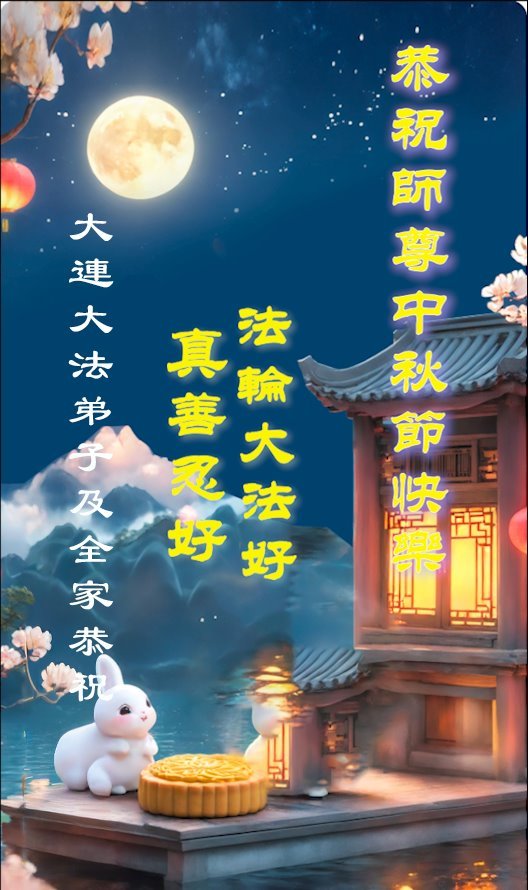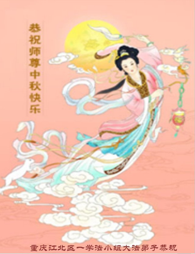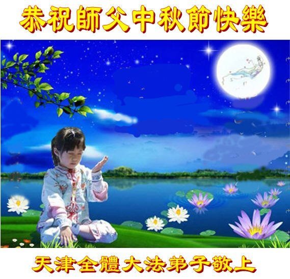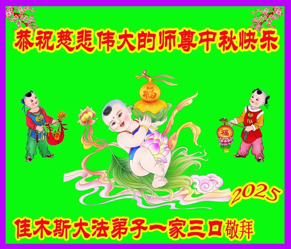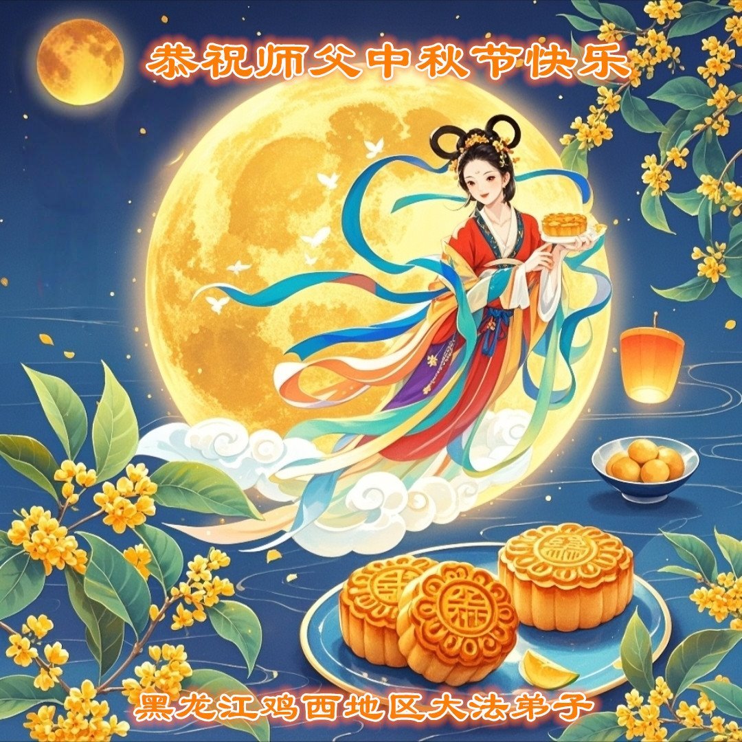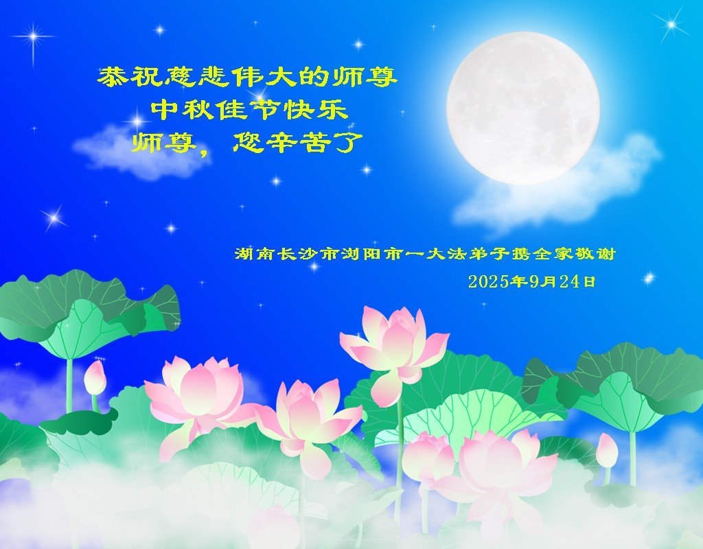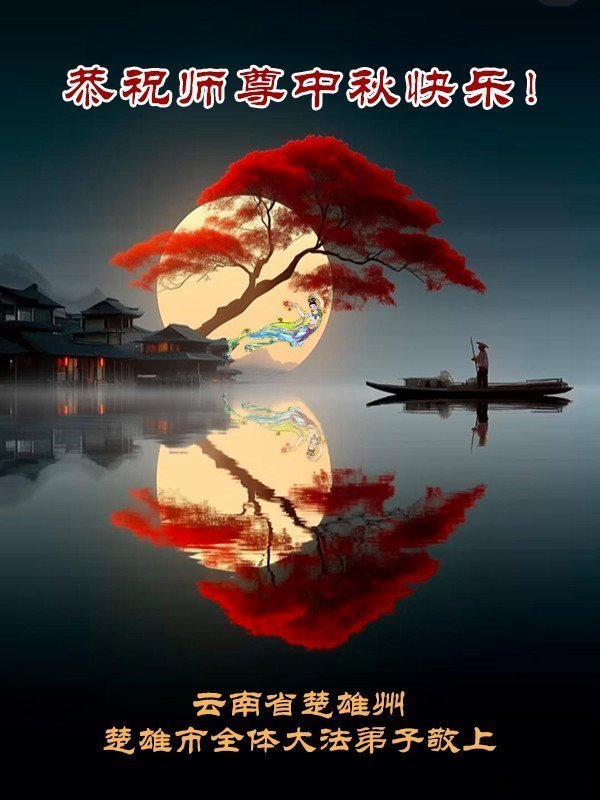 我們大法弟子攜家人和明真相的世人恭祝師尊中秋節快樂!師尊辛苦了!謝謝師尊的慈悲苦度!弟子一定破除舊勢力的安排,消除間隔,形成強大的整體,反迫害,救度眾生。弟子們要多學法,學好法,發好正念,向內找,兌現自己的誓約,跟師父回家。