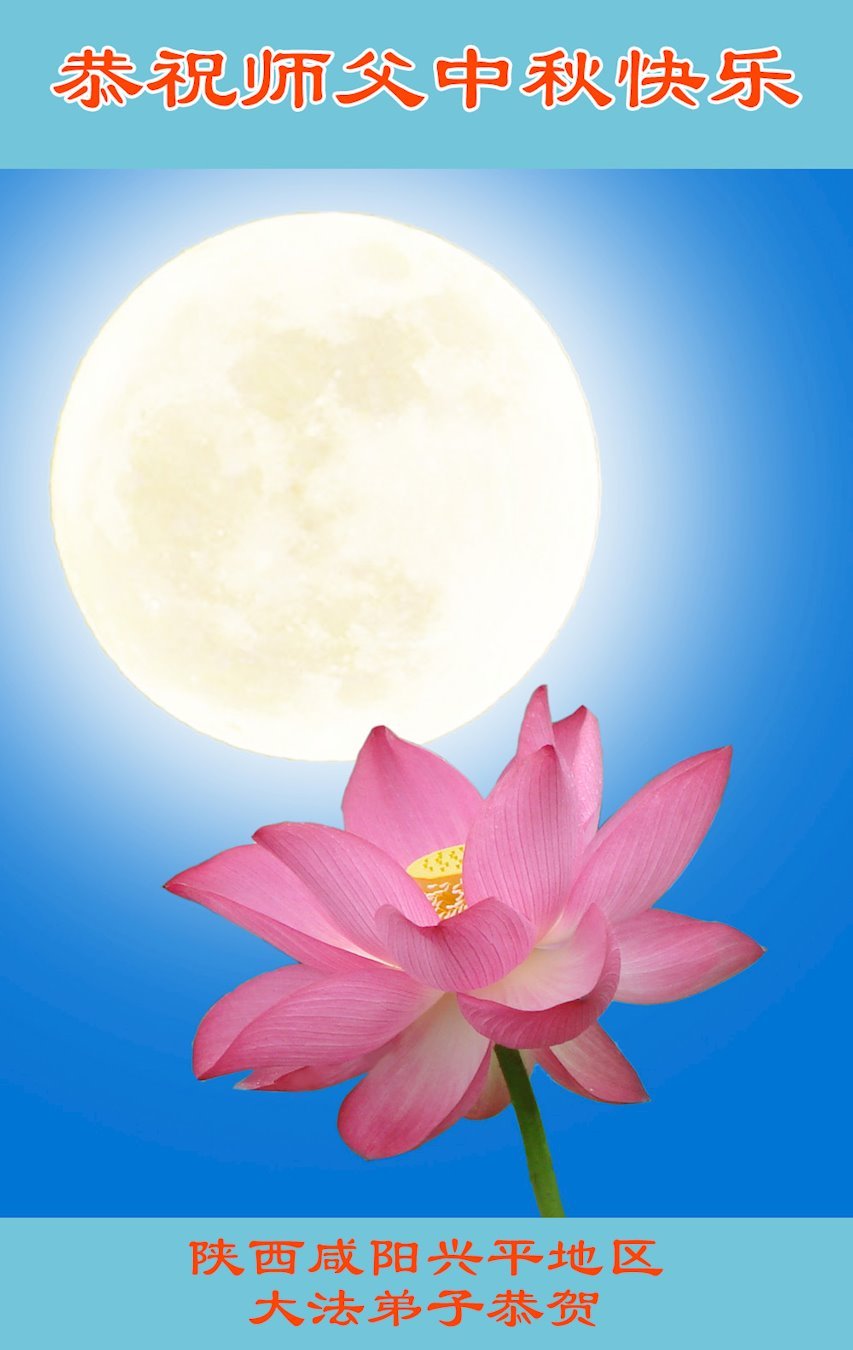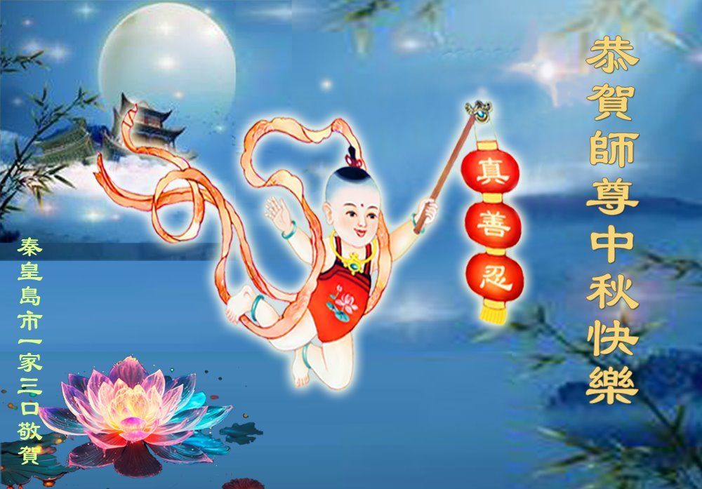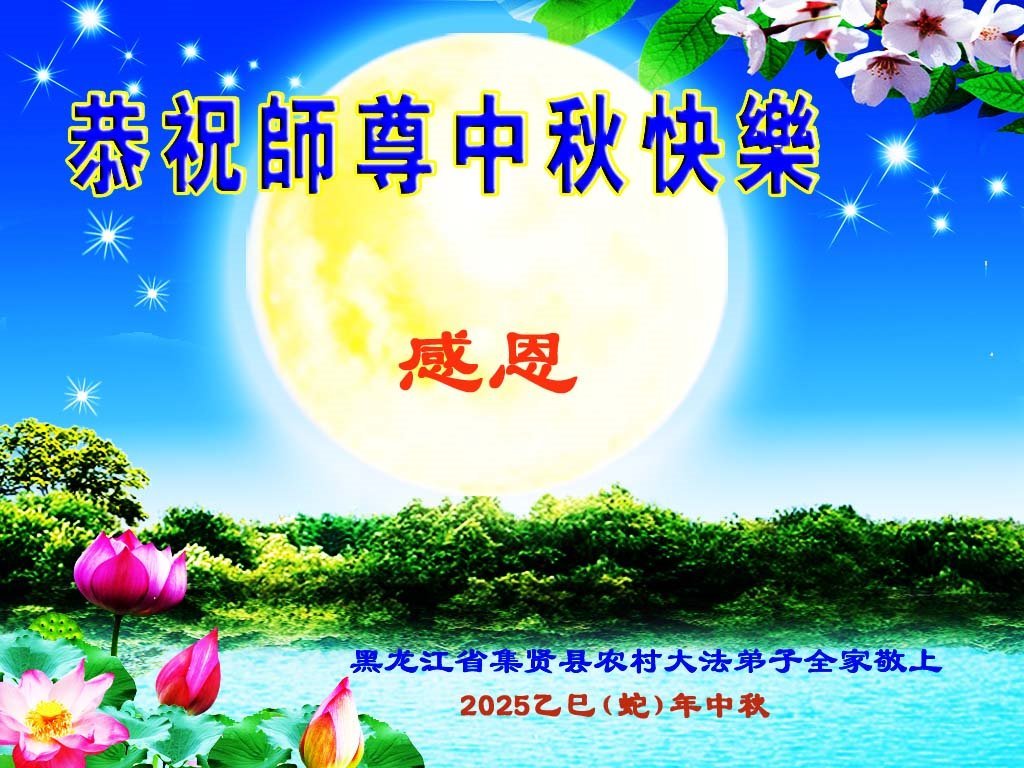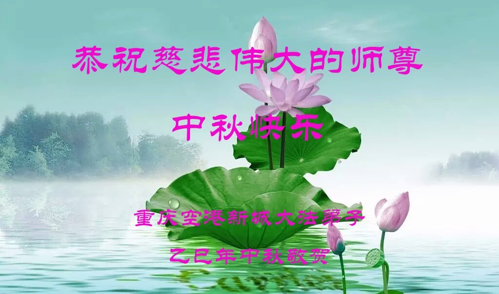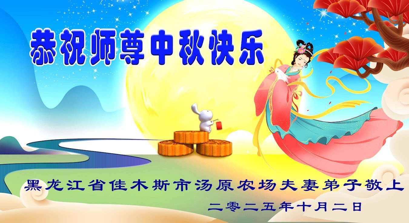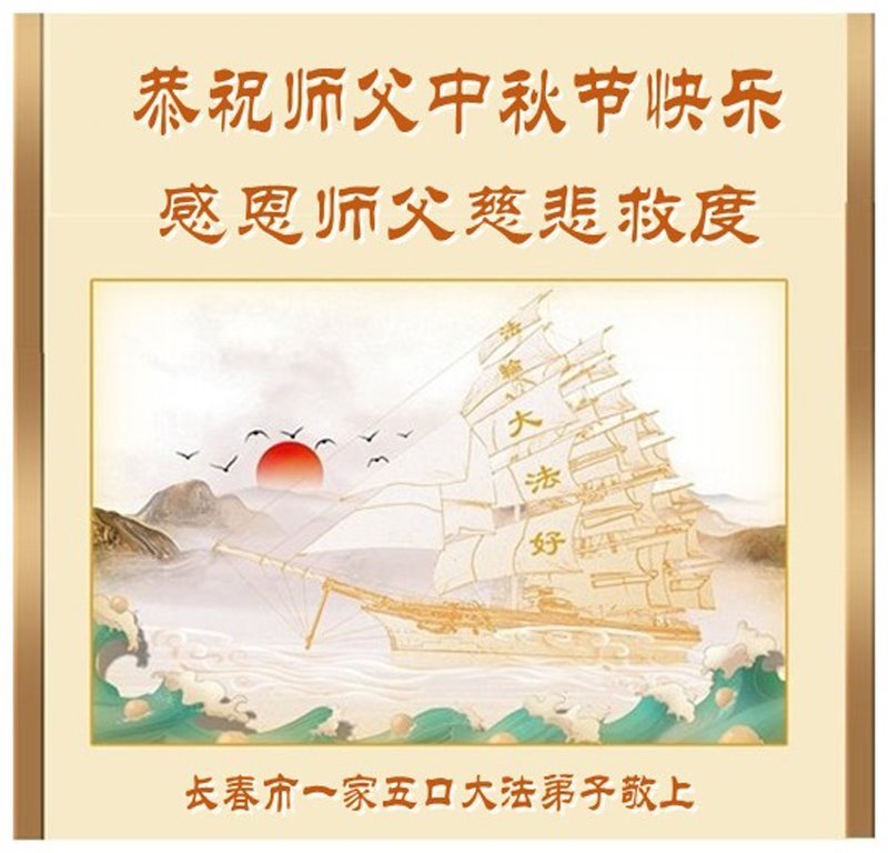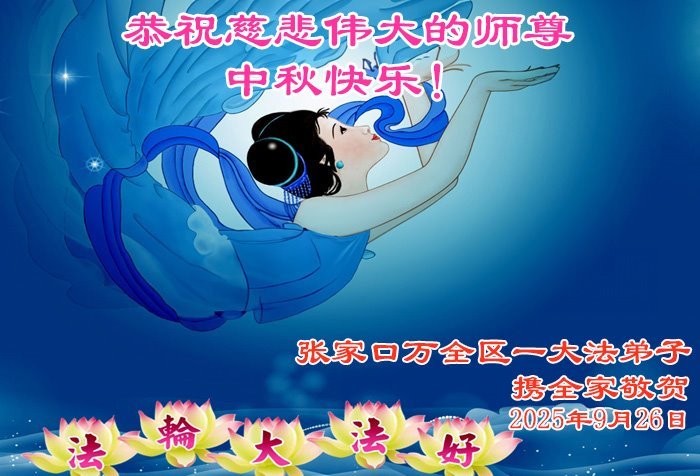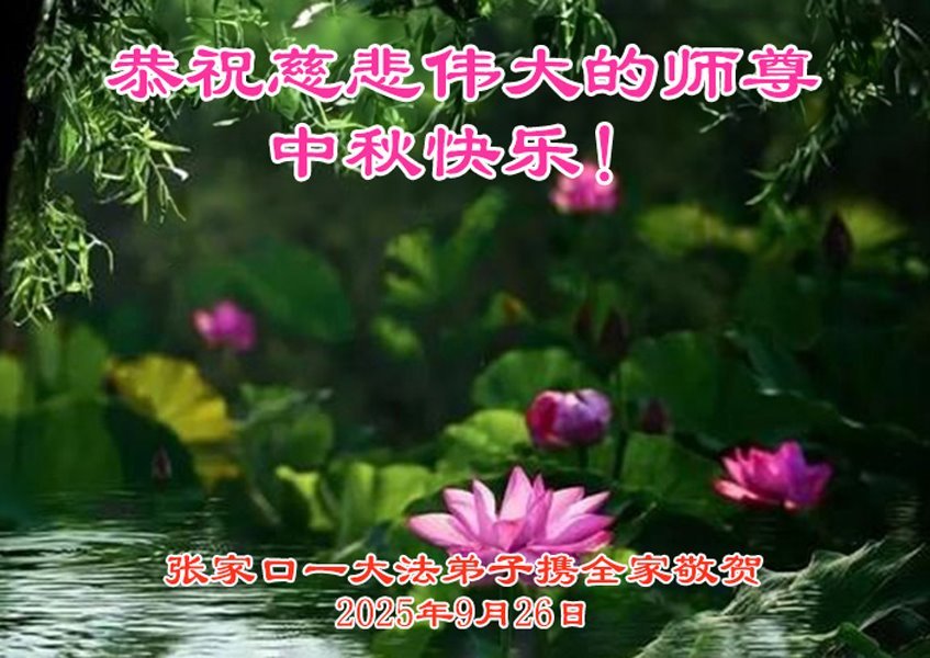 我們大法弟子攜家人和明真相的世人恭祝師尊中秋節快樂!師尊辛苦了!謝謝師尊的慈悲苦度!弟子一定破除舊勢力的安排,消除間隔,形成強大的整體,反迫害,救度眾生。弟子們要多學法,學好法,發好正念,向內找,兌現自己的誓約,跟師父回家。