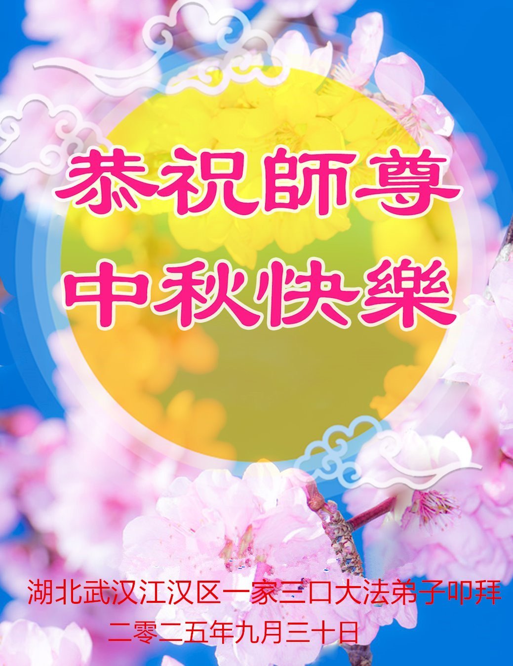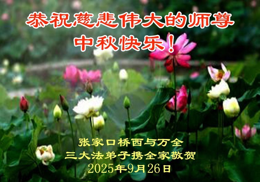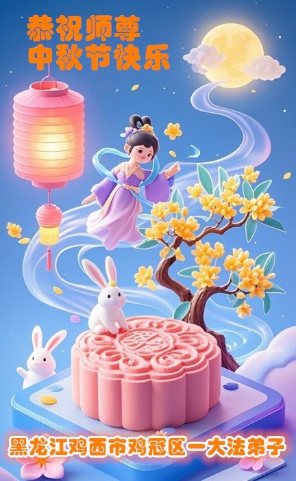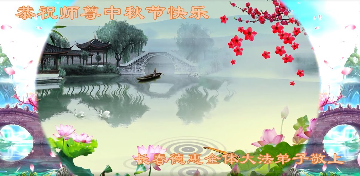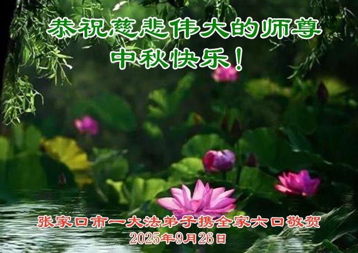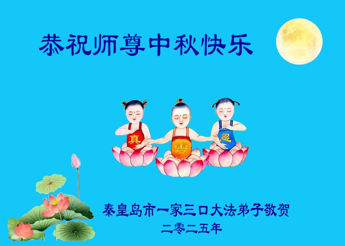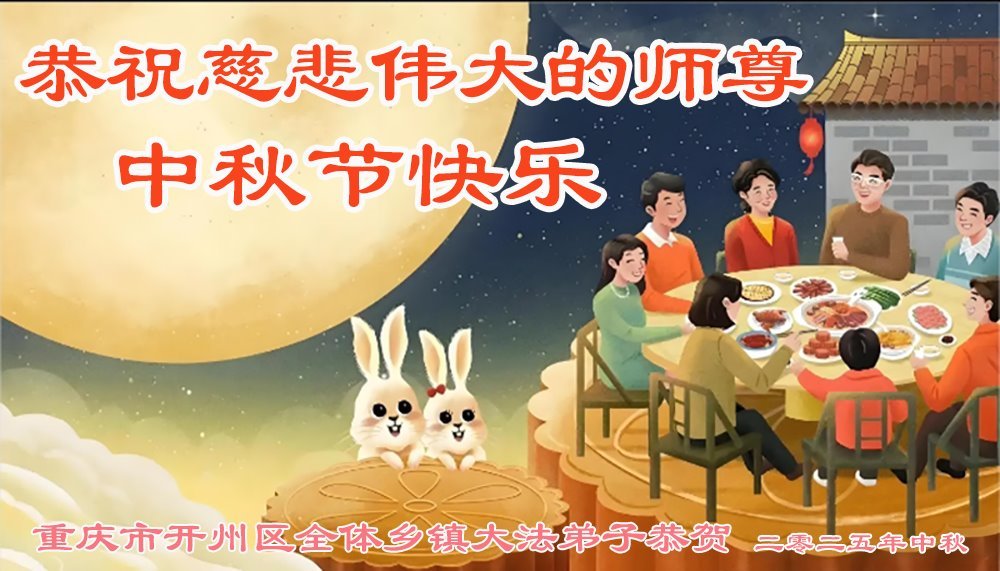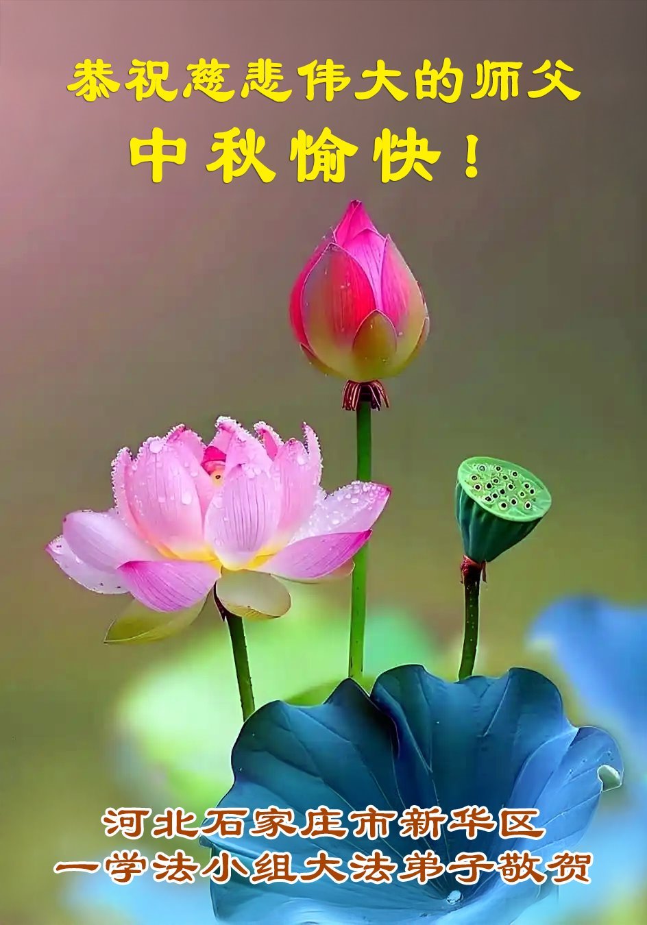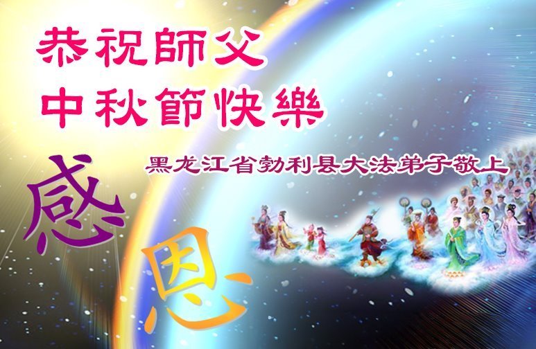 我們大法弟子攜家人和明真相的世人恭祝師尊中秋節快樂!師尊辛苦了!謝謝師尊的慈悲苦度!弟子一定破除舊勢力的安排,消除間隔,形成強大的整體,反迫害,救度眾生。弟子們要多學法,學好法,發好正念,向內找,兌現自己的誓約,跟師父回家。