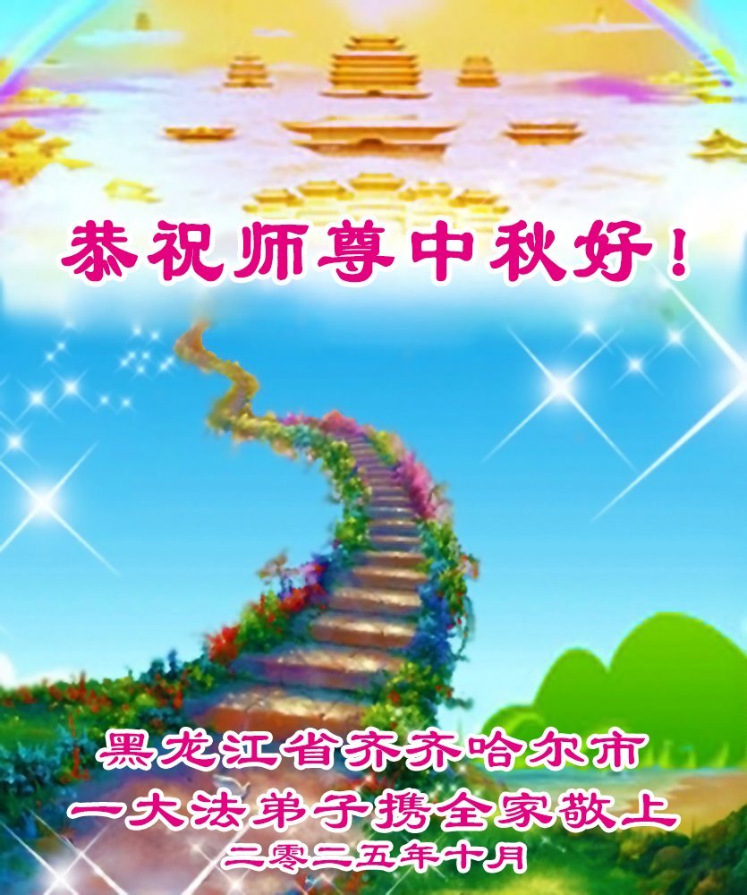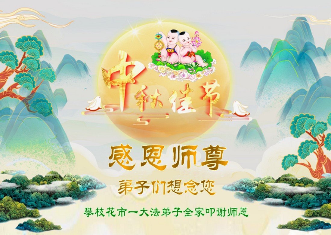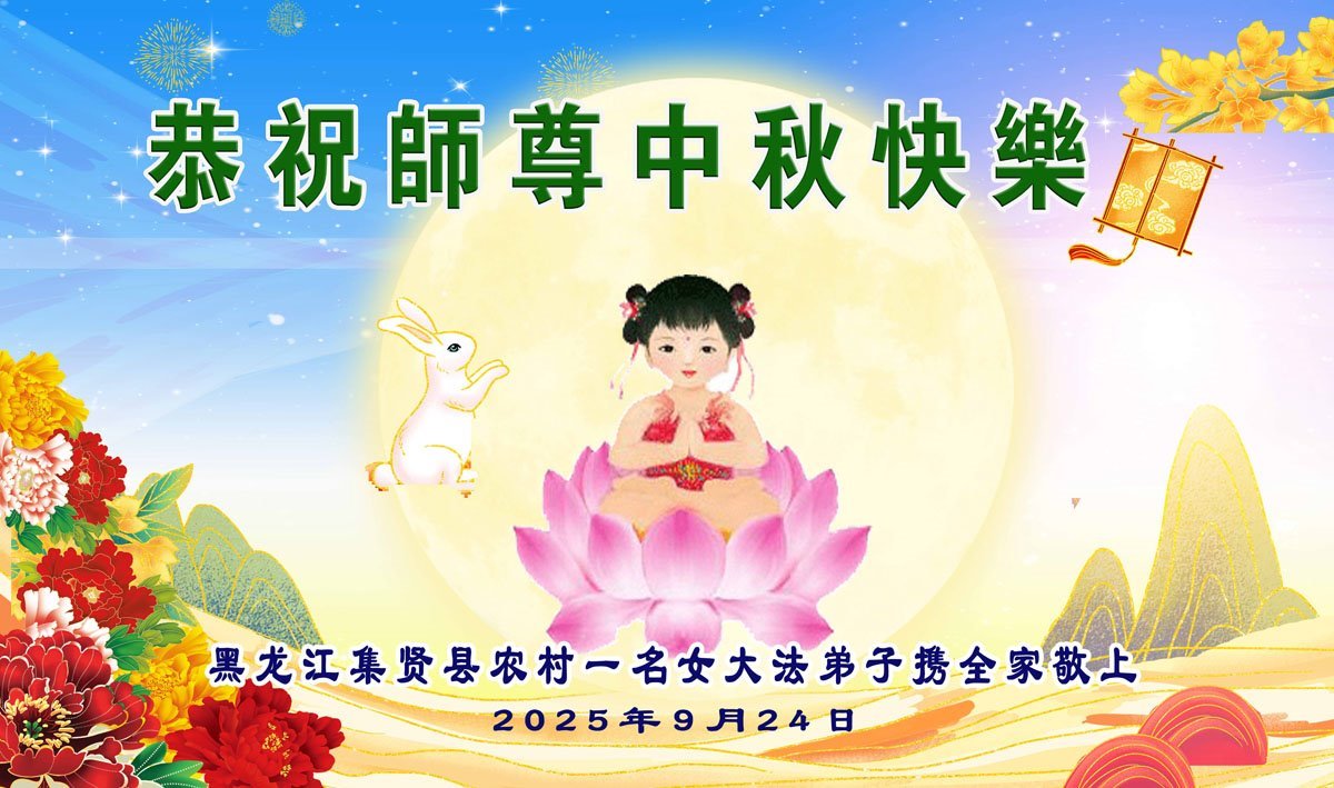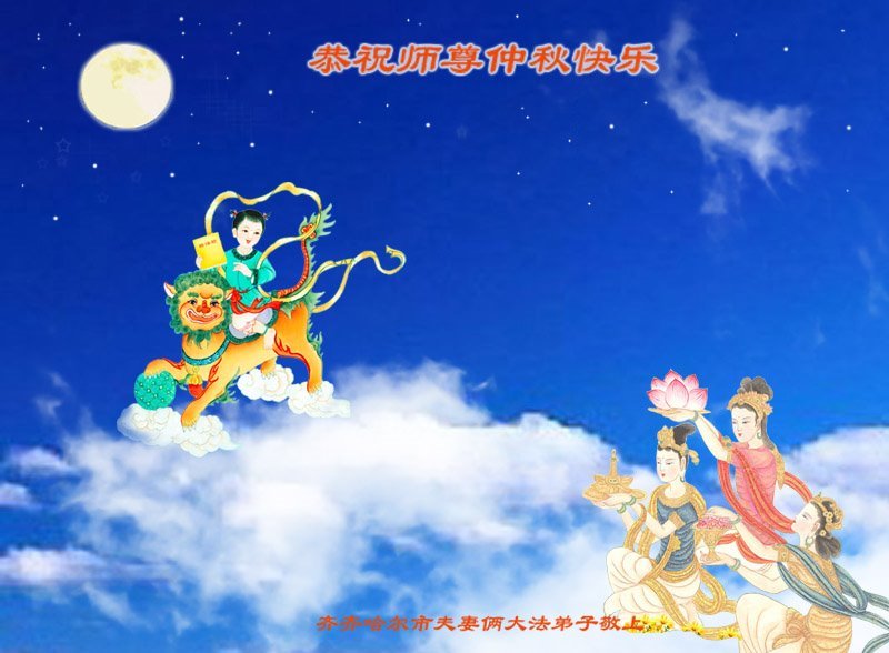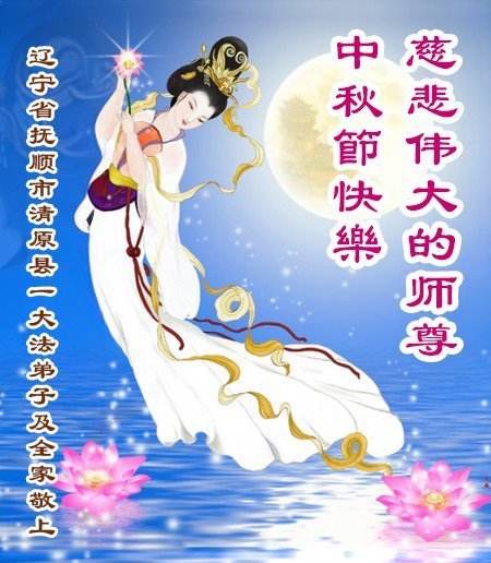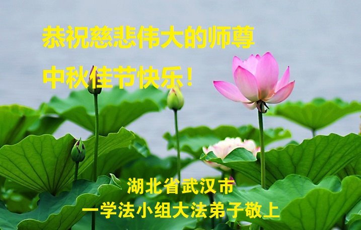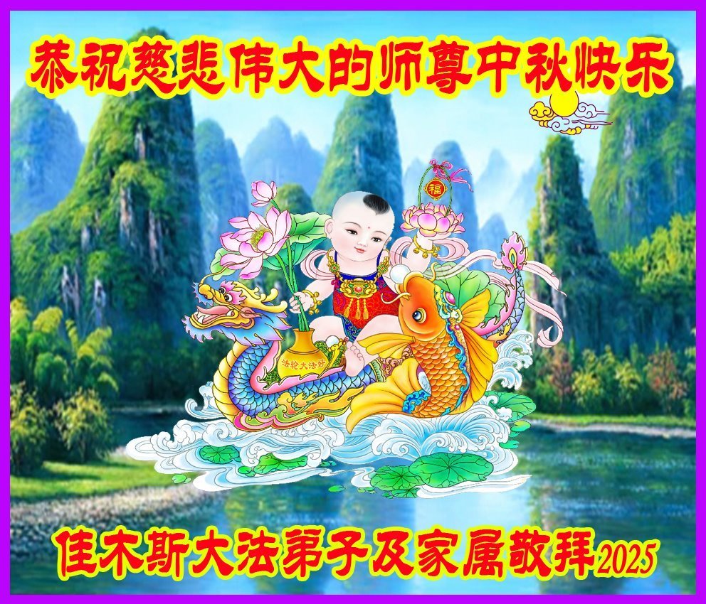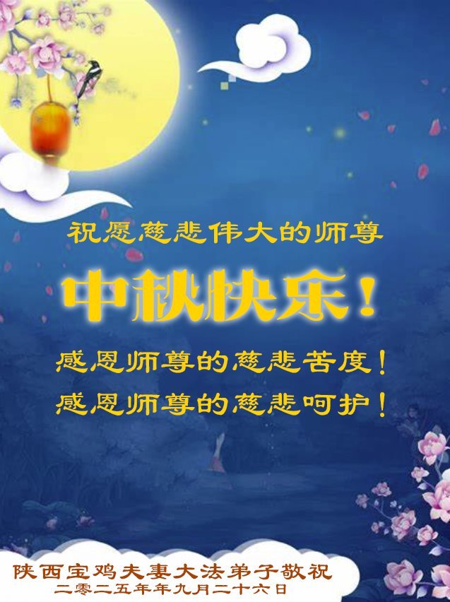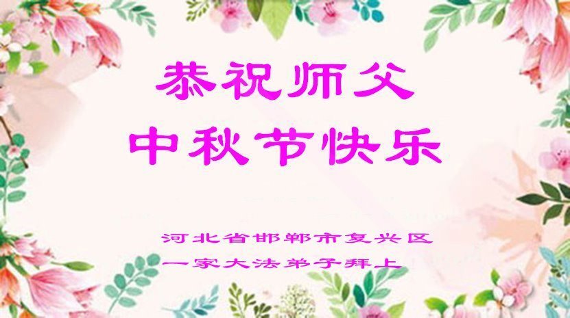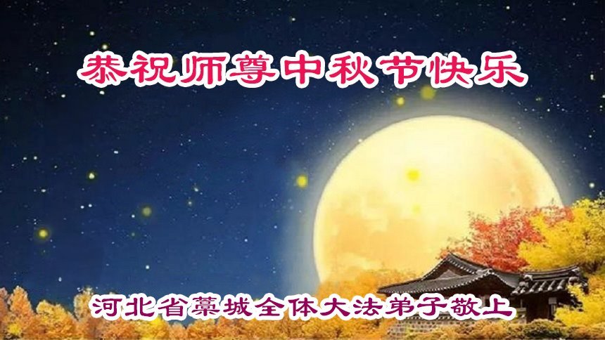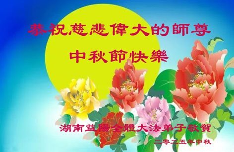 我們大法弟子攜家人和明真相的世人恭祝師尊中秋節快樂!師尊辛苦了!謝謝師尊的慈悲苦度!弟子一定破除舊勢力的安排,消除間隔,形成強大的整體,反迫害,救度眾生。弟子們要多學法,學好法,發好正念,向內找,兌現自己的誓約,跟師父回家。