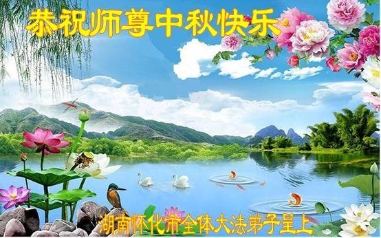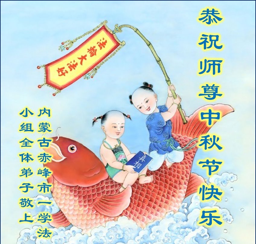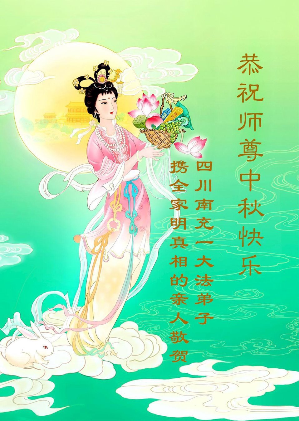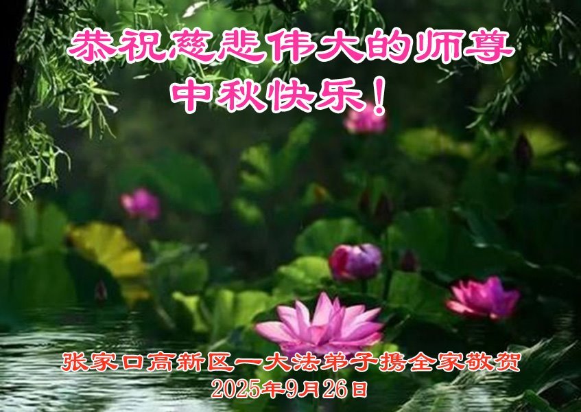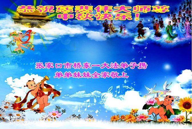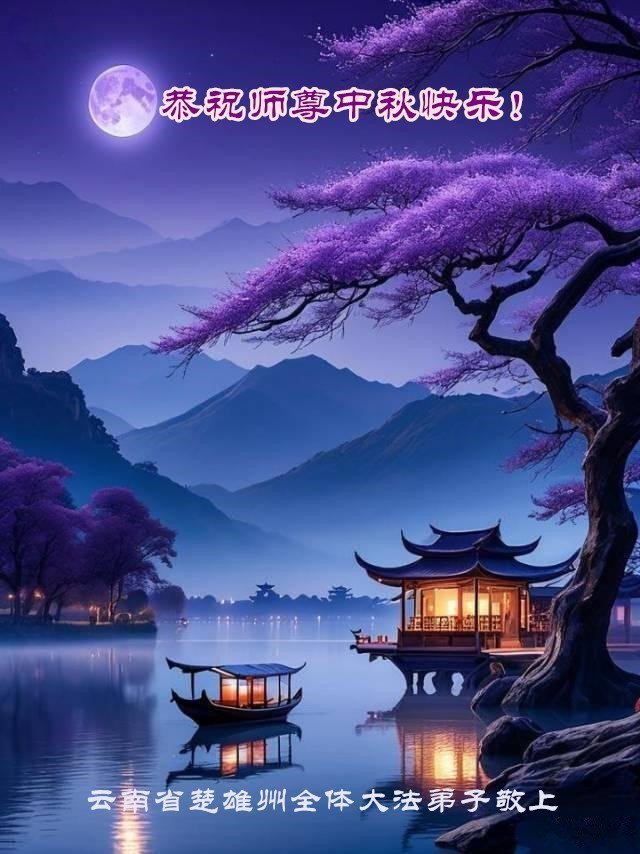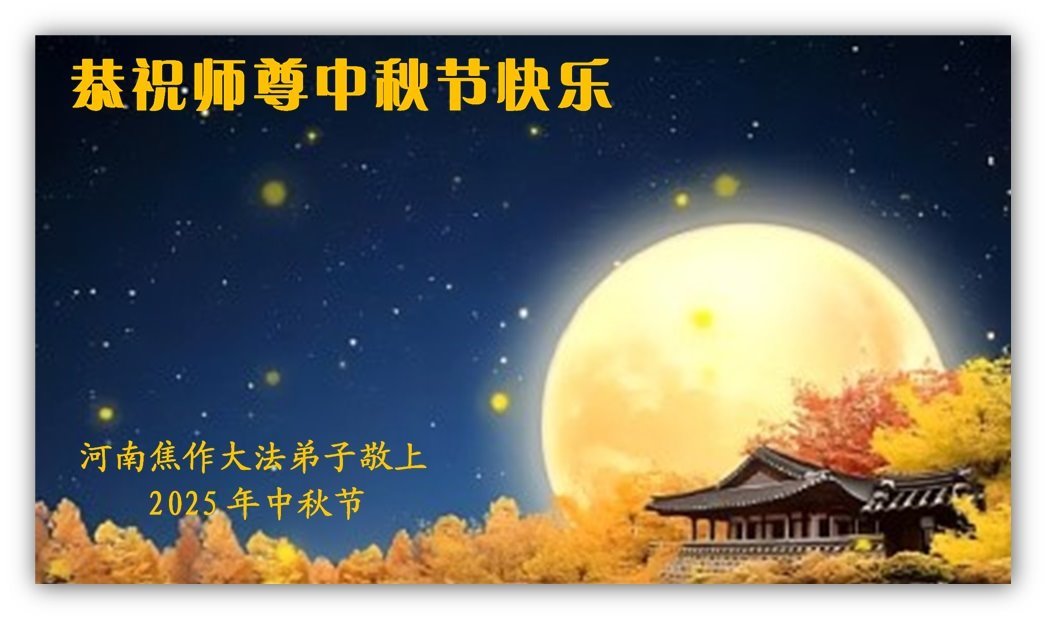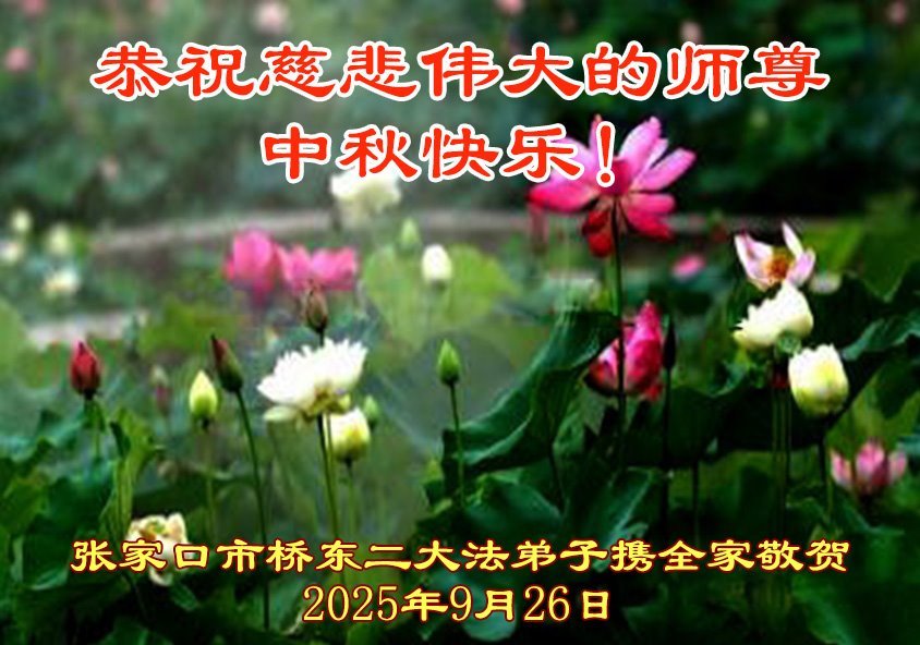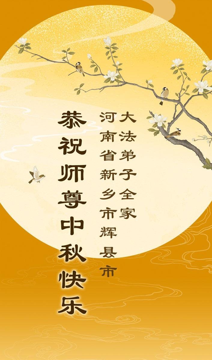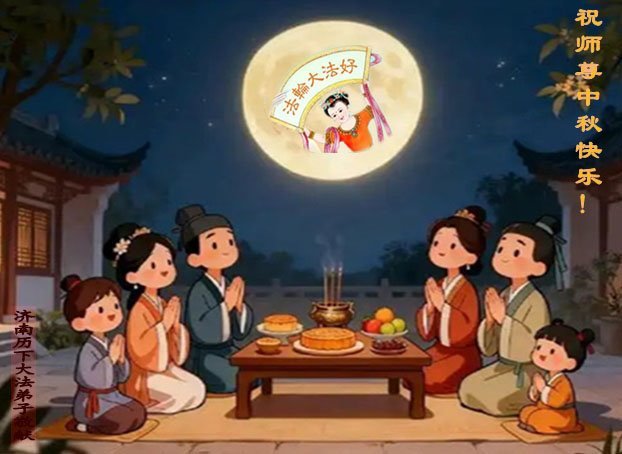 我們大法弟子攜家人和明真相的世人恭祝師尊中秋節快樂!師尊辛苦了!謝謝師尊的慈悲苦度!弟子一定破除舊勢力的安排,消除間隔,形成強大的整體,反迫害,救度眾生。弟子們要多學法,學好法,發好正念,向內找,兌現自己的誓約,跟師父回家。