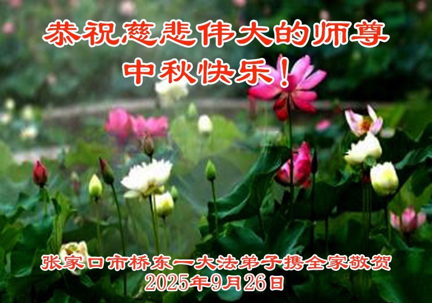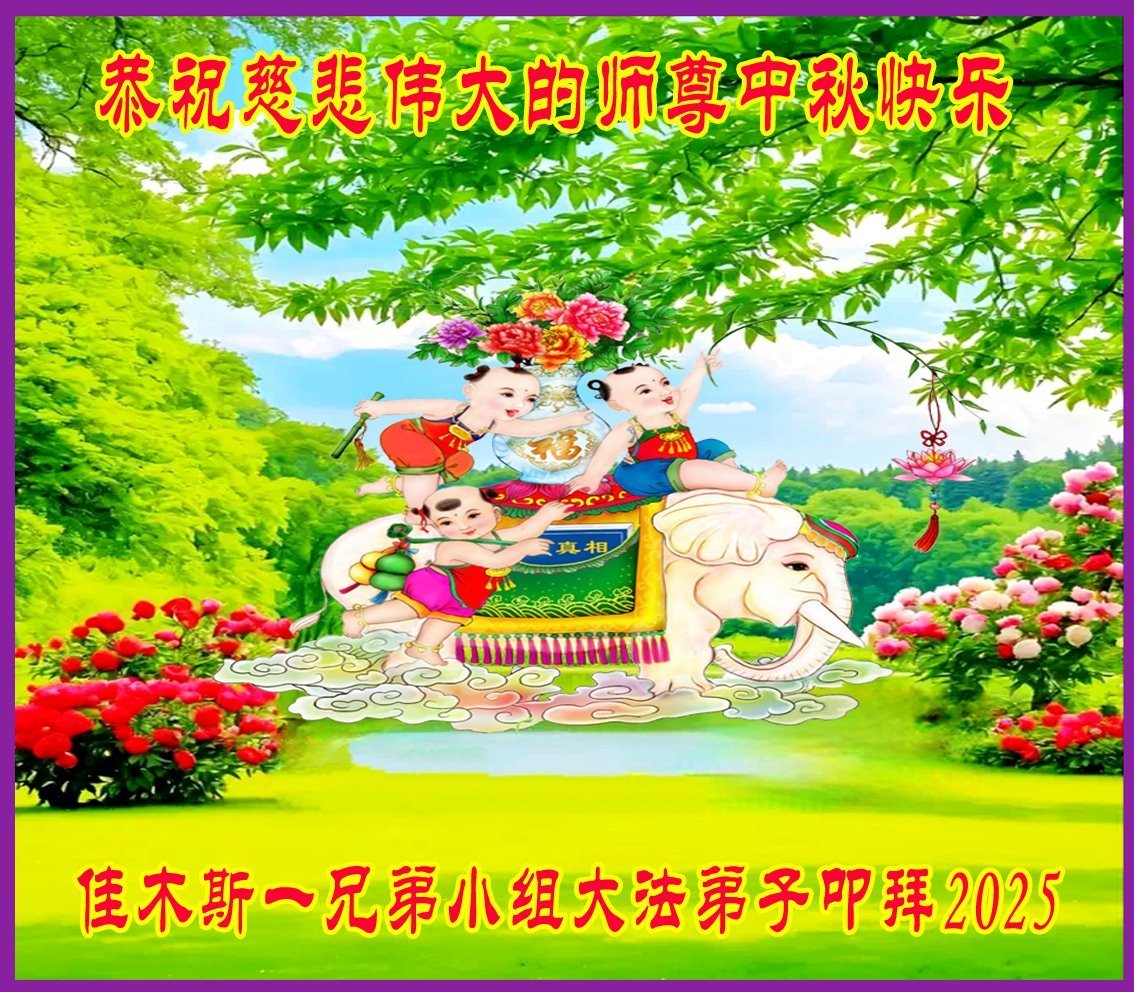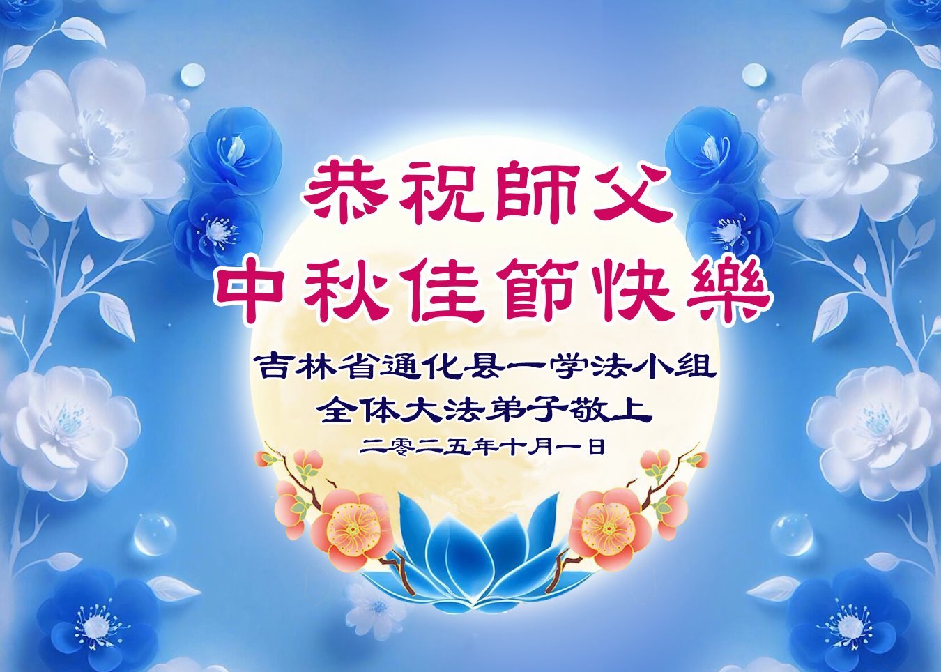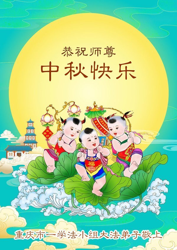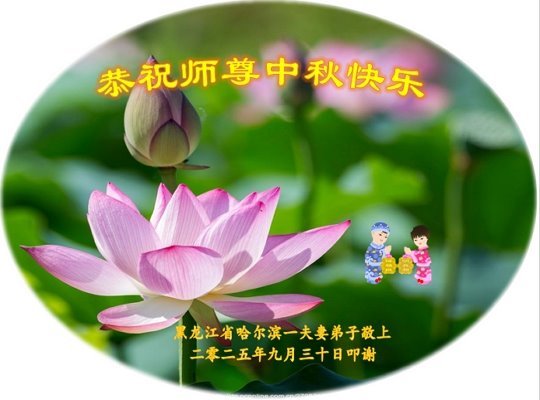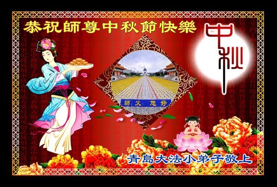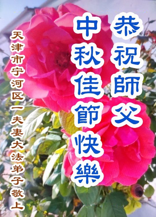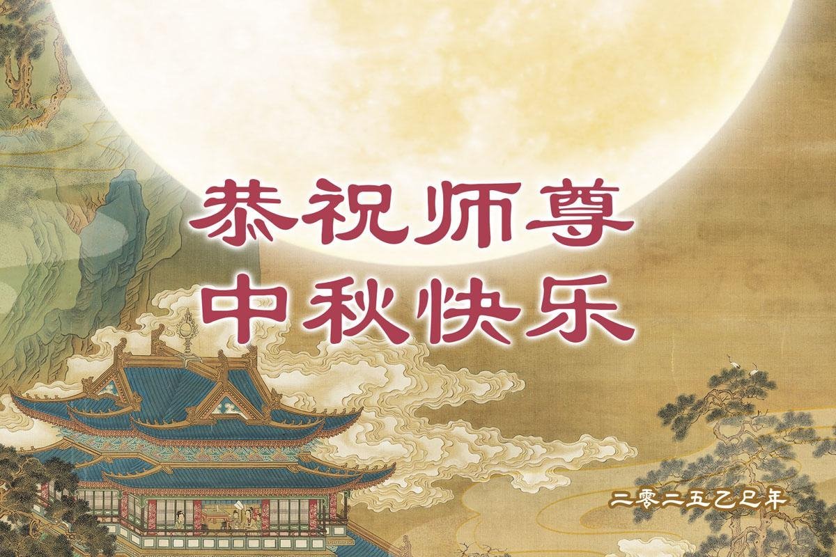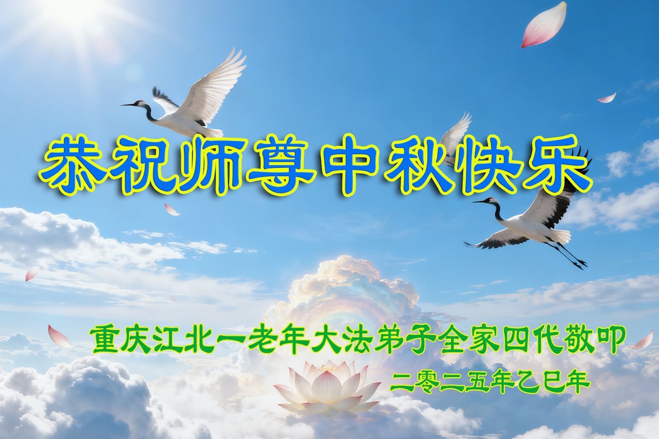 我們大法弟子攜家人和明真相的世人恭祝師尊中秋節快樂!師尊辛苦了!謝謝師尊的慈悲苦度!弟子一定破除舊勢力的安排,消除間隔,形成強大的整體,反迫害,救度眾生。弟子們要多學法,學好法,發好正念,向內找,兌現自己的誓約,跟師父回家。