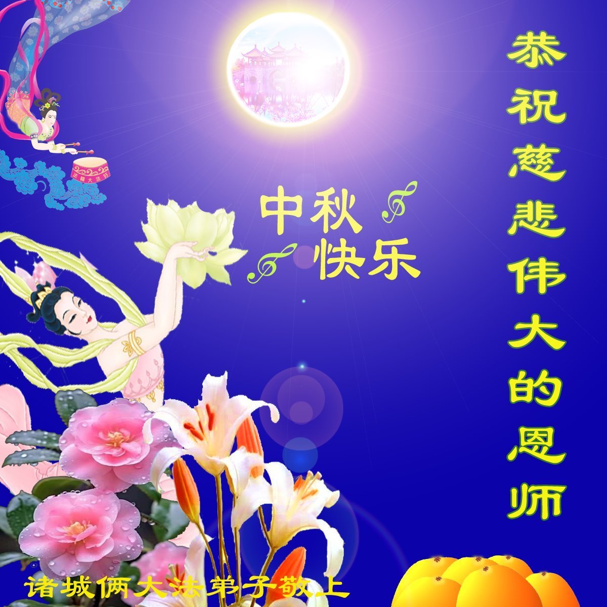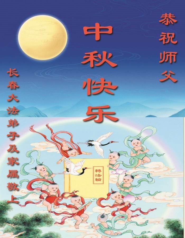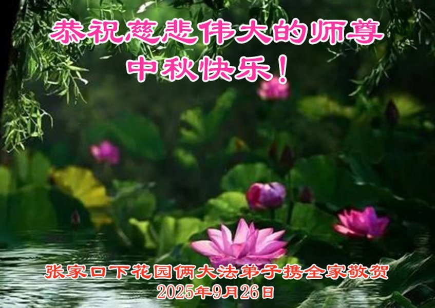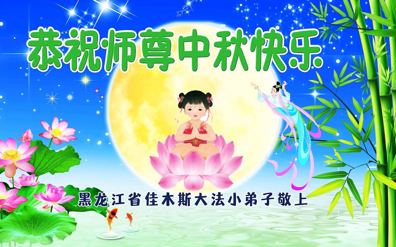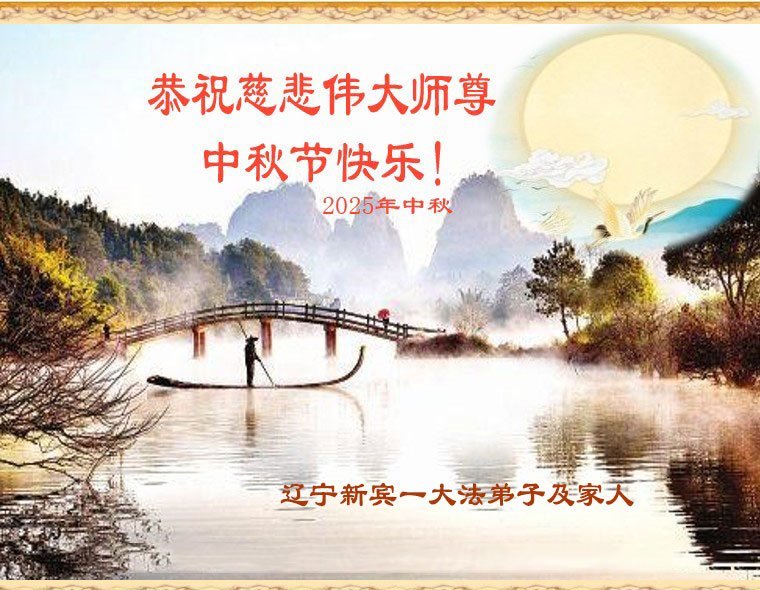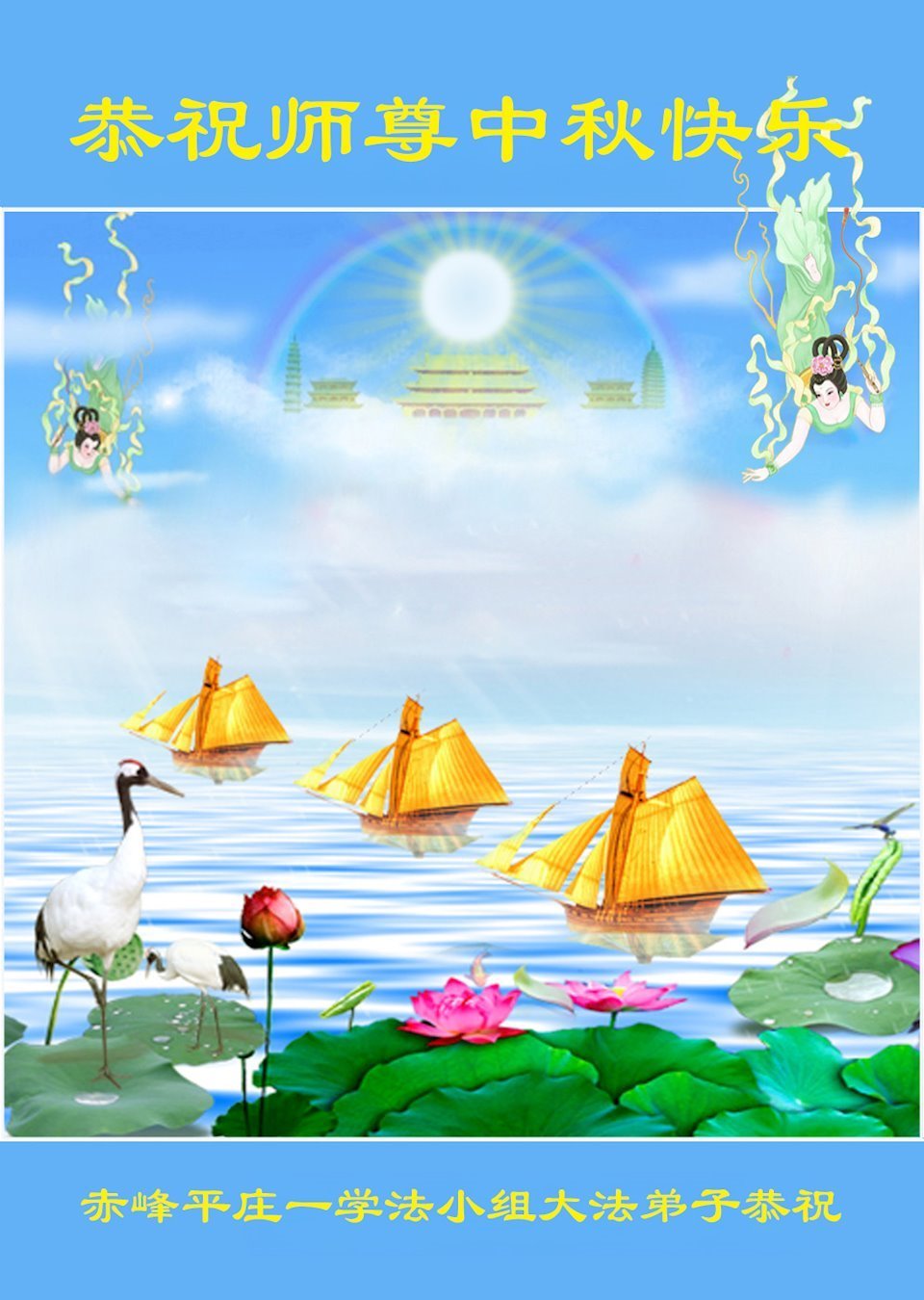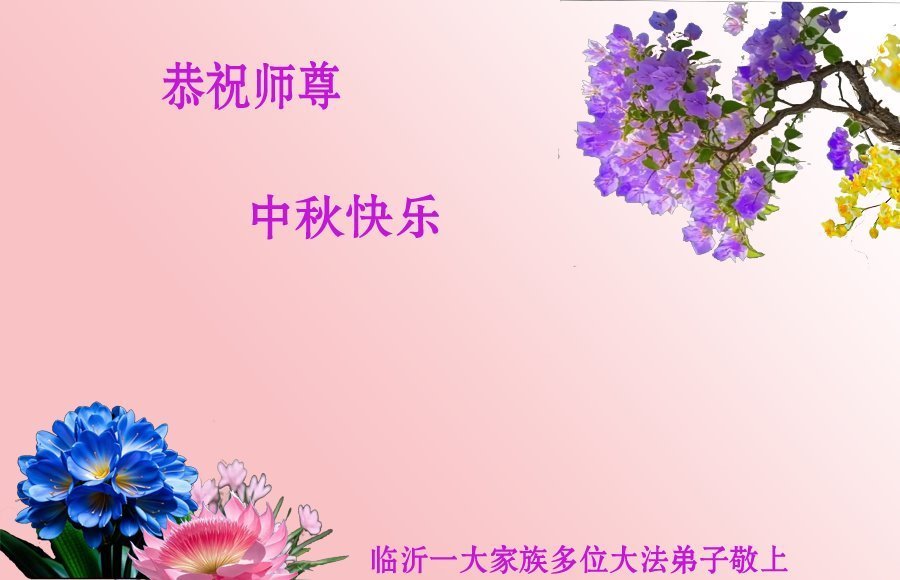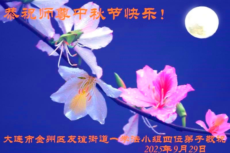 我們大法弟子攜家人和明真相的世人恭祝師尊中秋節快樂!師尊辛苦了!謝謝師尊的慈悲苦度!弟子一定破除舊勢力的安排,消除間隔,形成強大的整體,反迫害,救度眾生。弟子們要多學法,學好法,發好正念,向內找,兌現自己的誓約,跟師父回家。