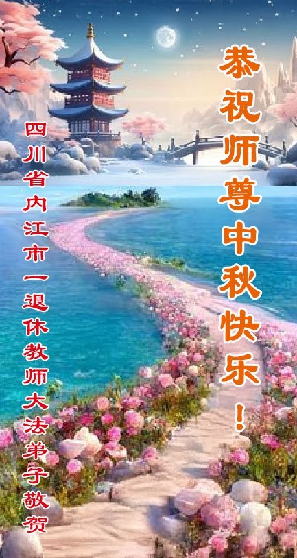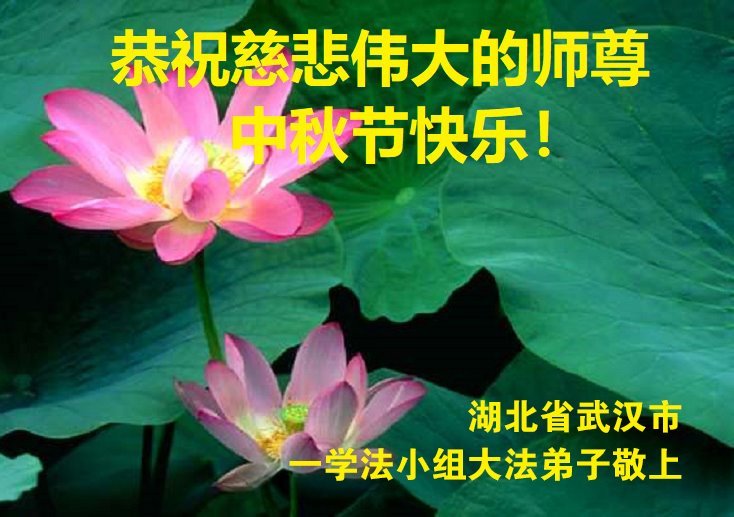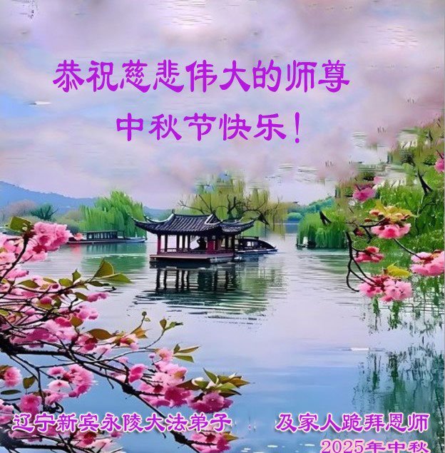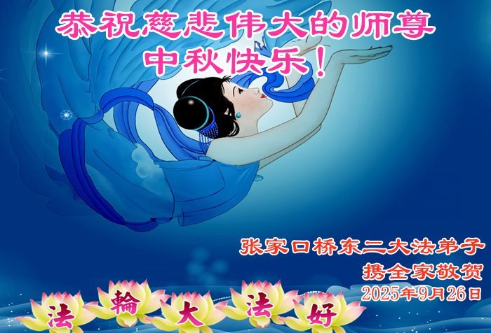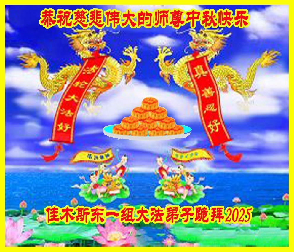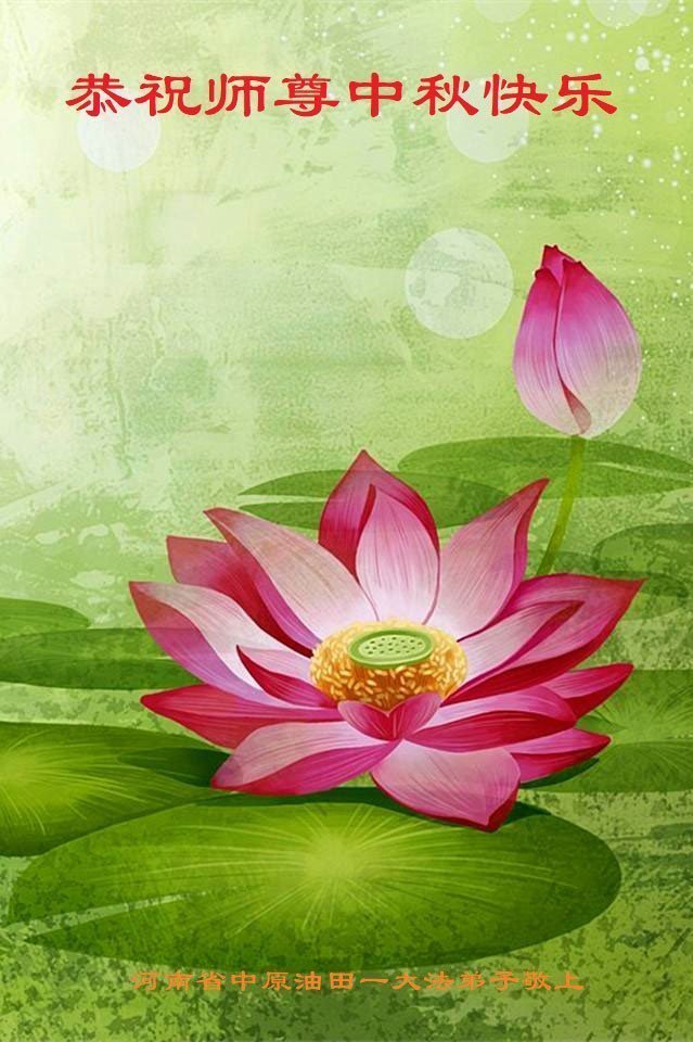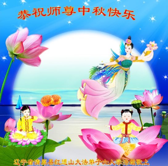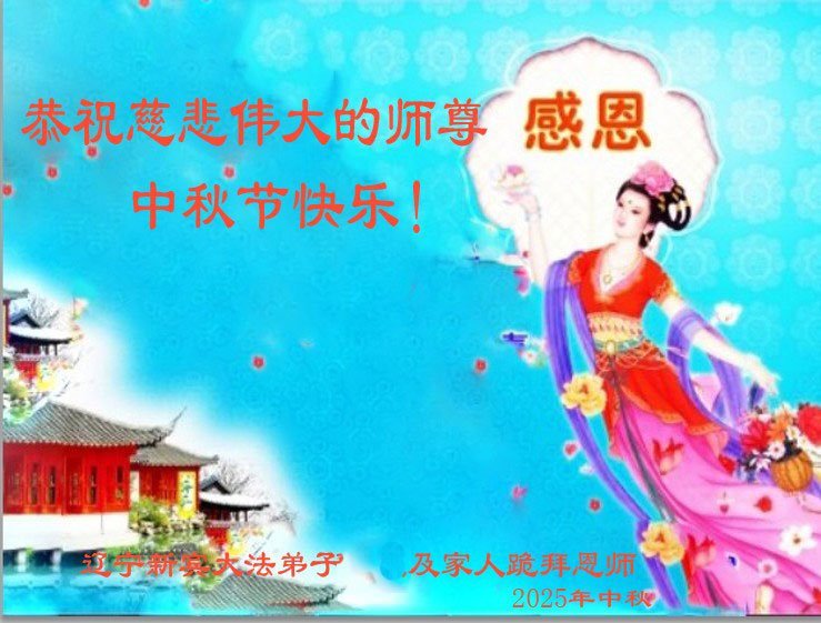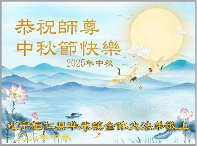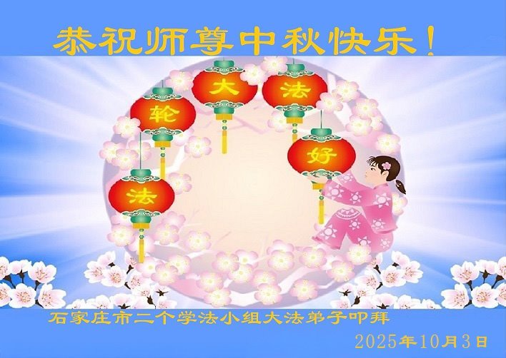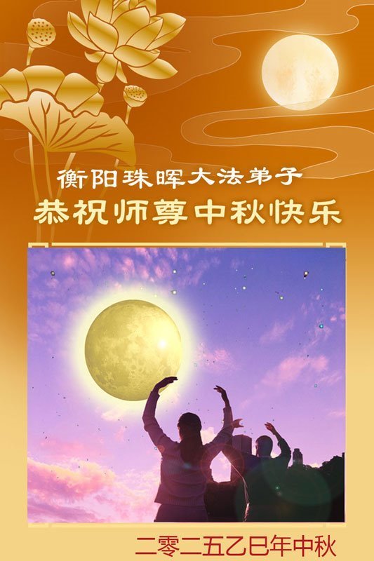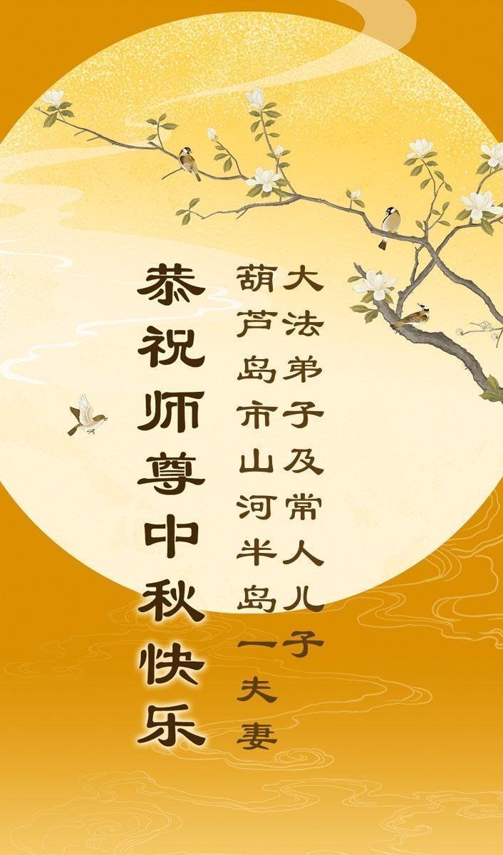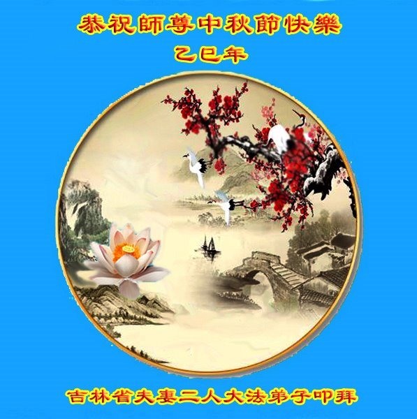 我們大法弟子攜家人和明真相的世人恭祝師尊中秋節快樂!師尊辛苦了!謝謝師尊的慈悲苦度!弟子一定破除舊勢力的安排,消除間隔,形成強大的整體,反迫害,救度眾生。弟子們要多學法,學好法,發好正念,向內找,兌現自己的誓約,跟師父回家。