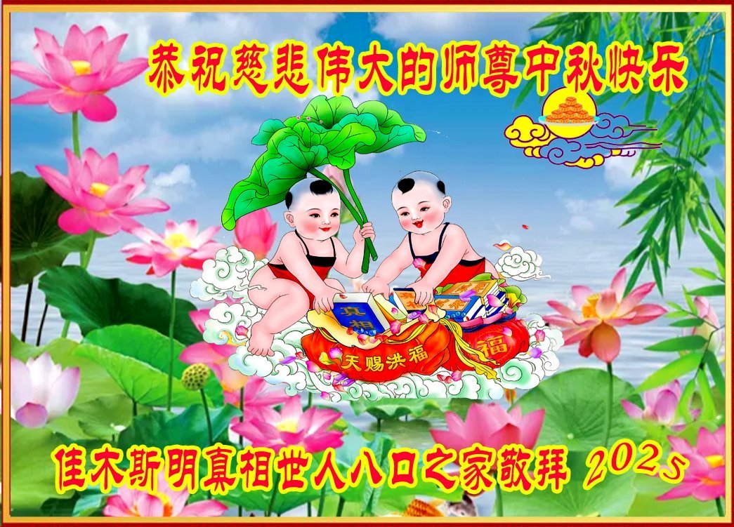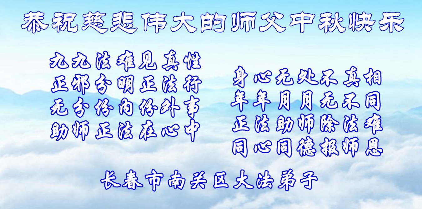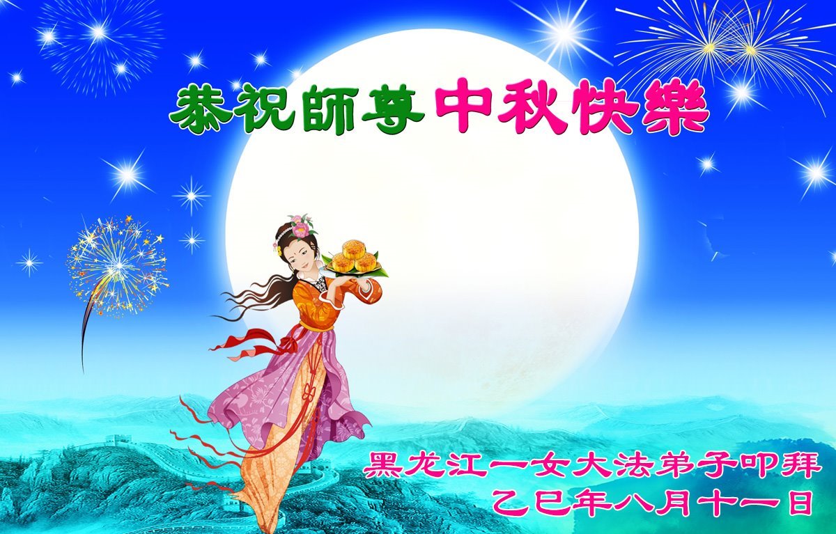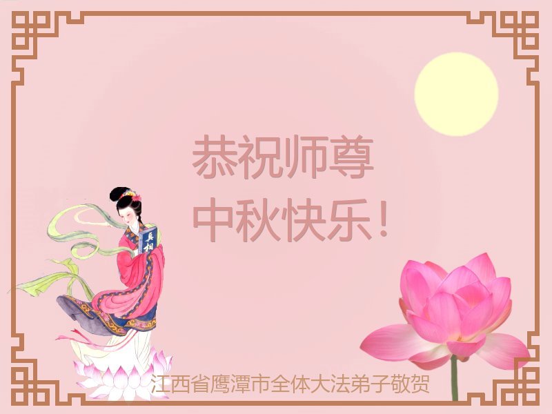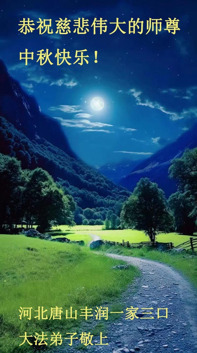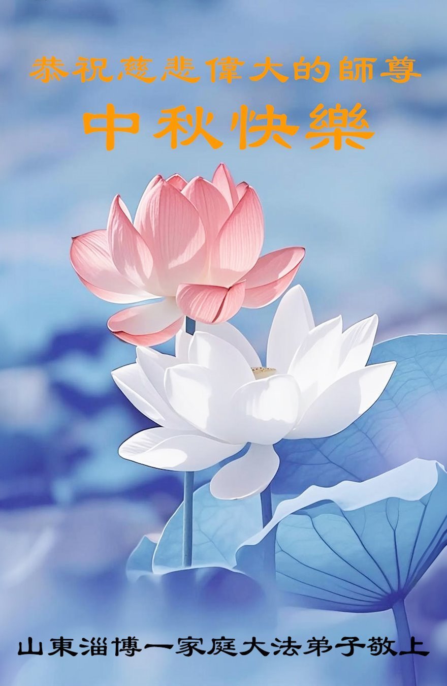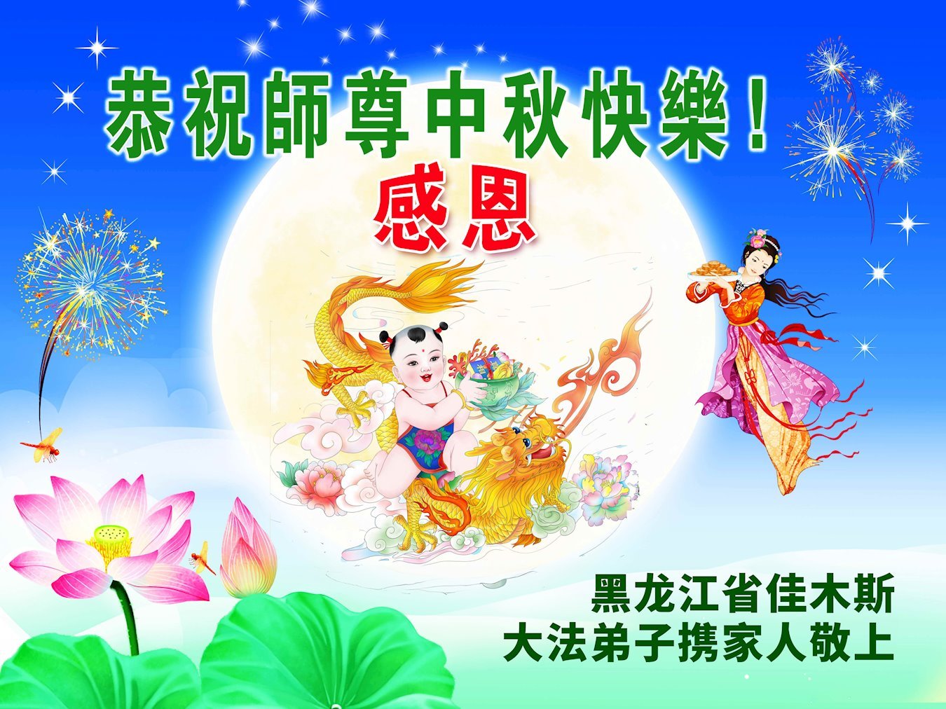 我們大法弟子攜家人和明真相的世人恭祝師尊中秋節快樂!師尊辛苦了!謝謝師尊的慈悲苦度!弟子一定破除舊勢力的安排,消除間隔,形成強大的整體,反迫害,救度眾生。弟子們要多學法,學好法,發好正念,向內找,兌現自己的誓約,跟師父回家。