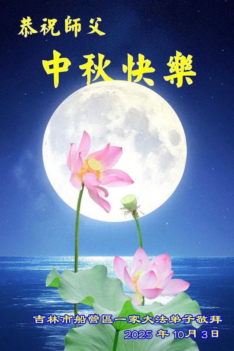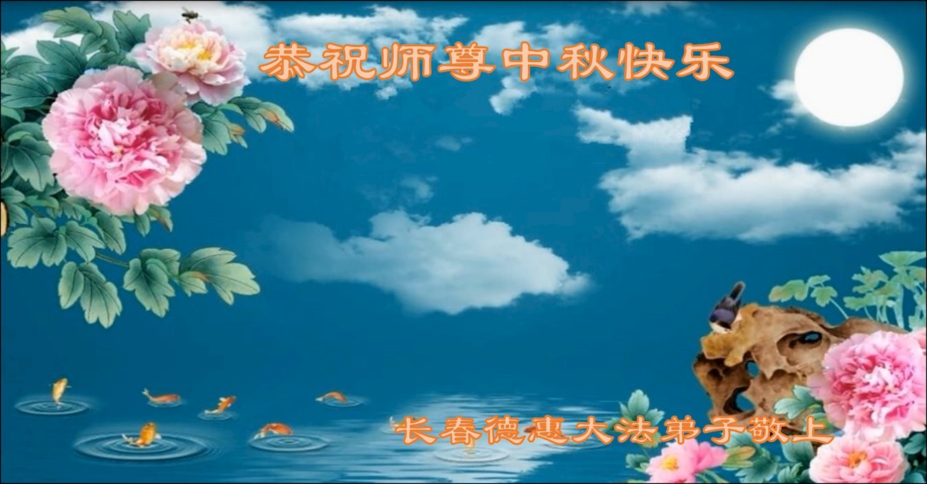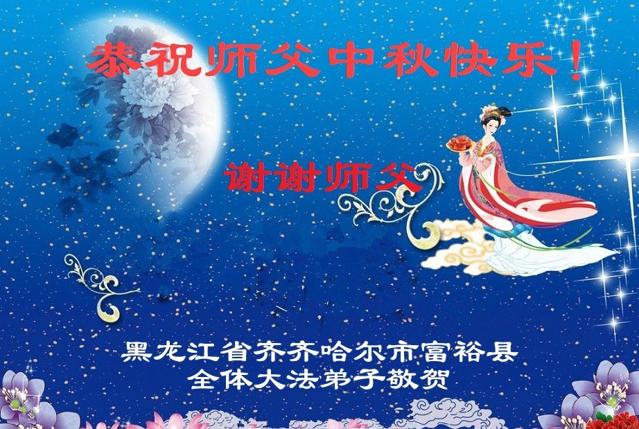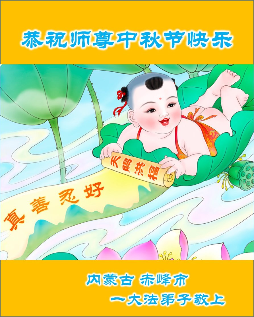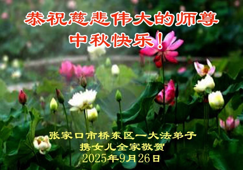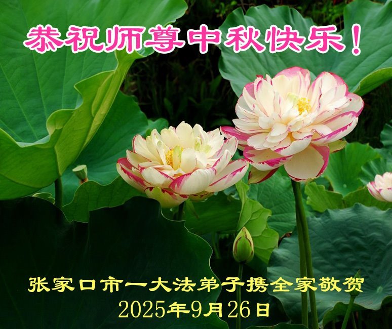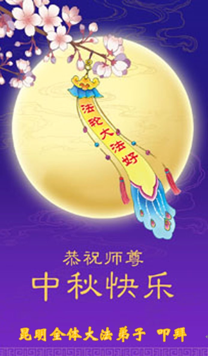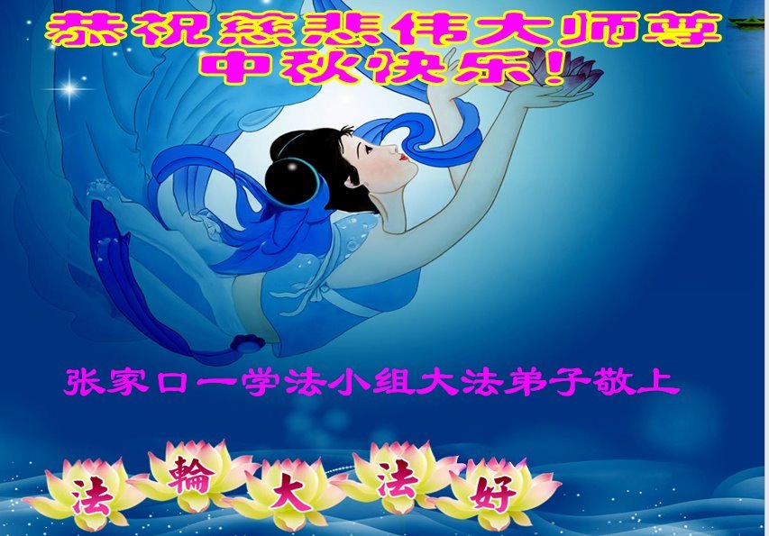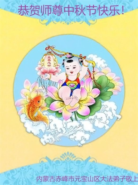 我們大法弟子攜家人和明真相的世人恭祝師尊中秋節快樂!師尊辛苦了!謝謝師尊的慈悲苦度!弟子一定破除舊勢力的安排,消除間隔,形成強大的整體,反迫害,救度眾生。弟子們要多學法,學好法,發好正念,向內找,兌現自己的誓約,跟師父回家。