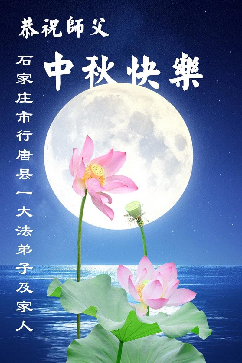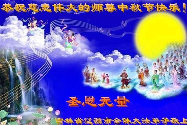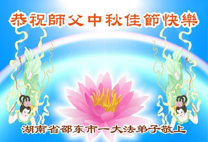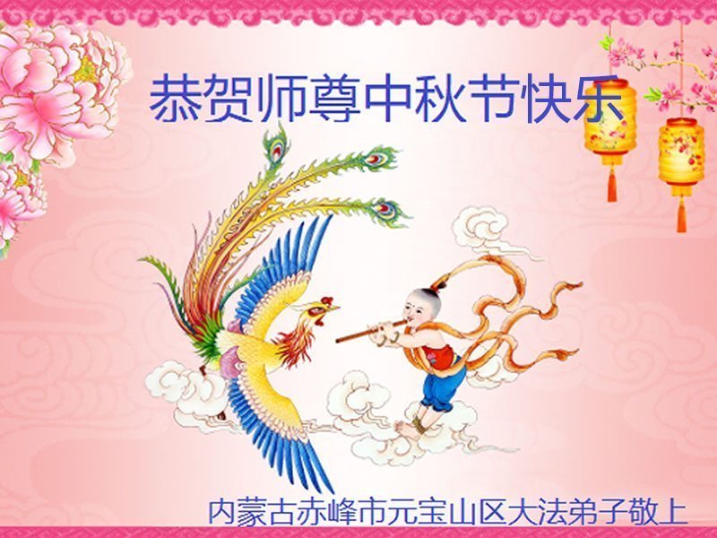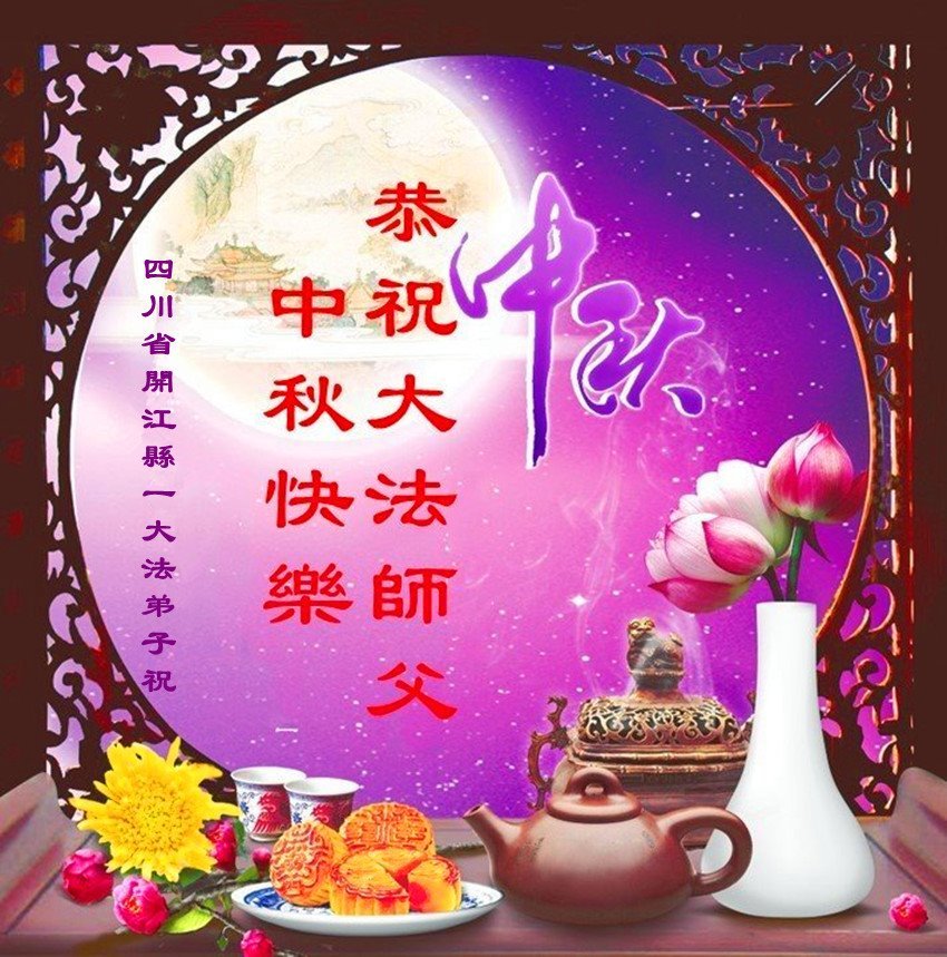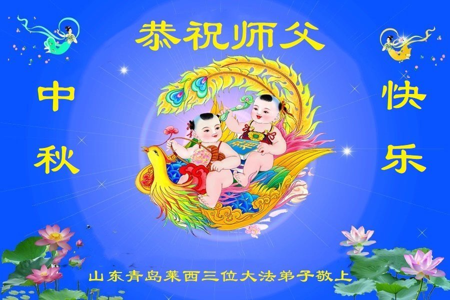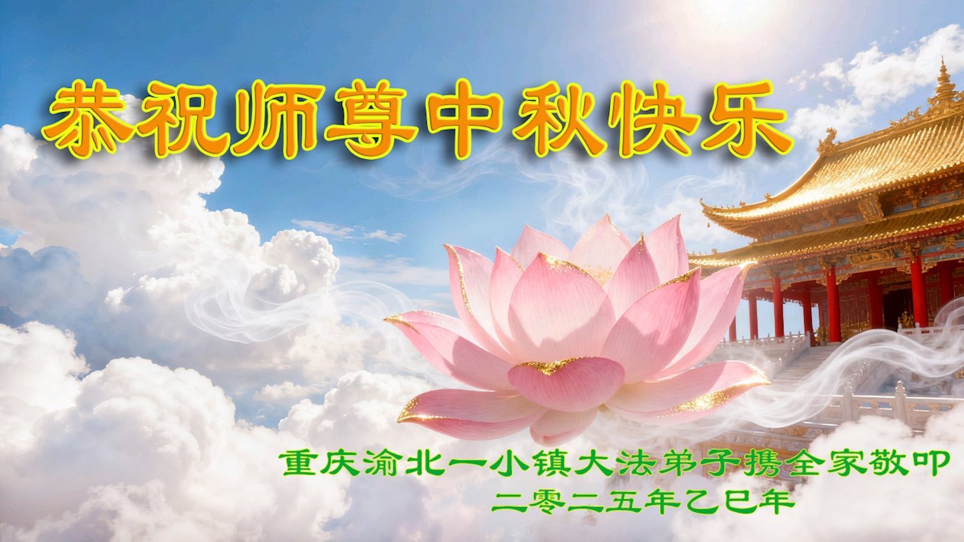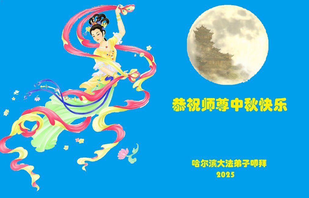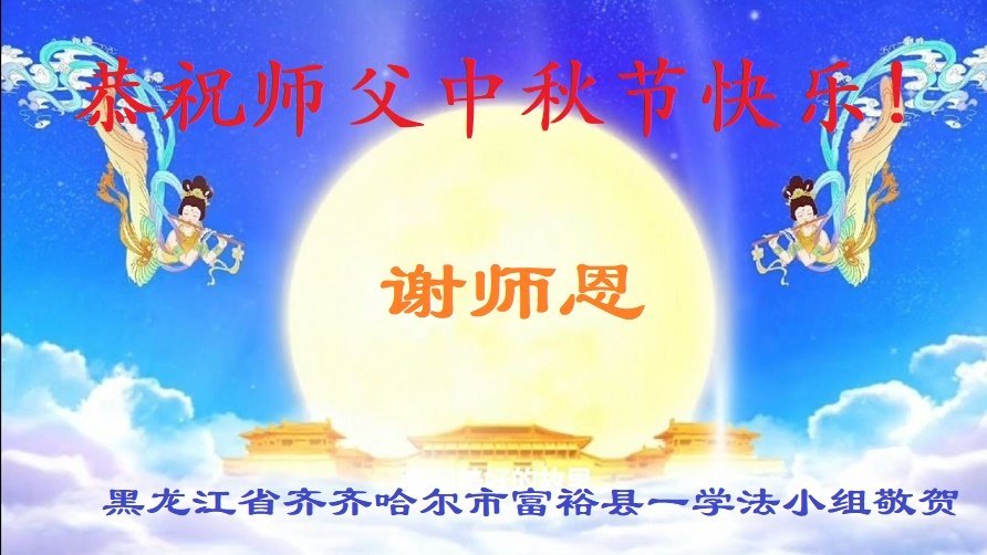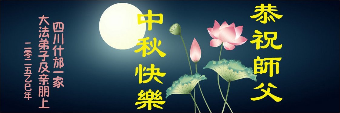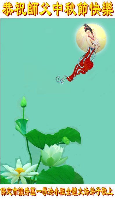 我們大法弟子攜家人和明真相的世人恭祝師尊中秋節快樂!師尊辛苦了!謝謝師尊的慈悲苦度!弟子一定破除舊勢力的安排,消除間隔,形成強大的整體,反迫害,救度眾生。弟子們要多學法,學好法,發好正念,向內找,兌現自己的誓約,跟師父回家。