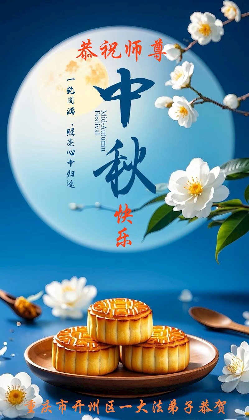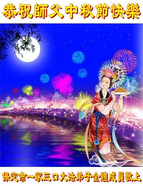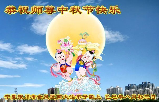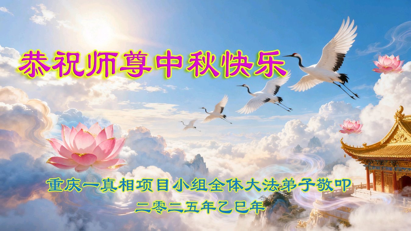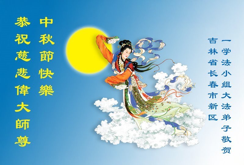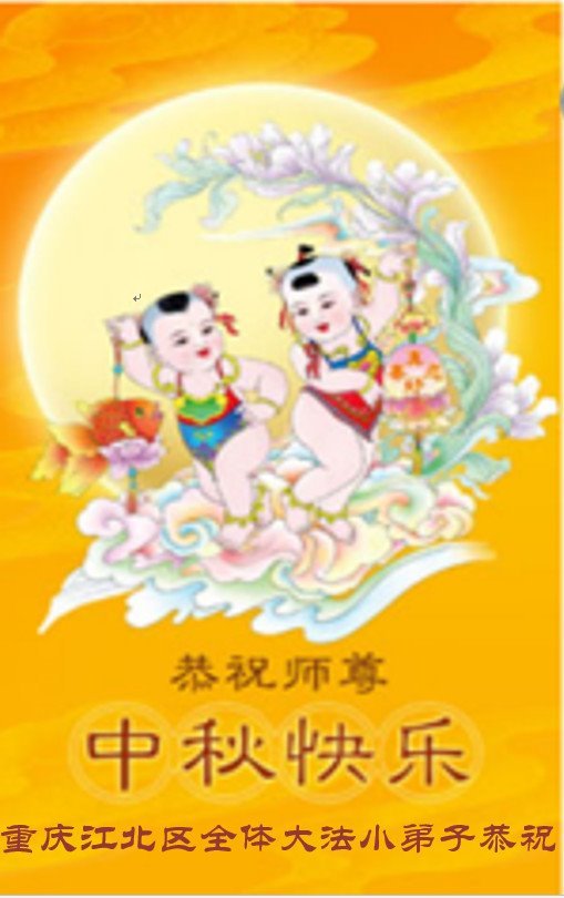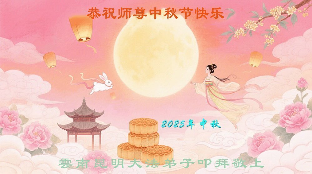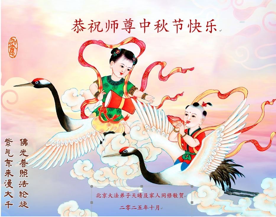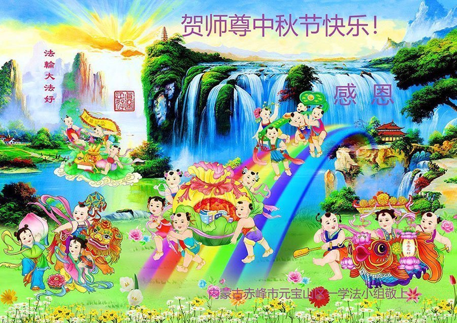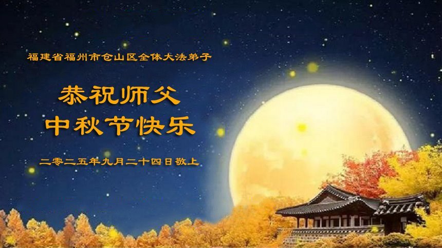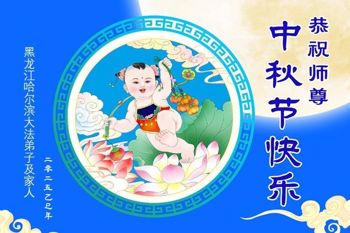 我們大法弟子攜家人和明真相的世人恭祝師尊中秋節快樂!師尊辛苦了!謝謝師尊的慈悲苦度!弟子一定破除舊勢力的安排,消除間隔,形成強大的整體,反迫害,救度眾生。弟子們要多學法,學好法,發好正念,向內找,兌現自己的誓約,跟師父回家。
