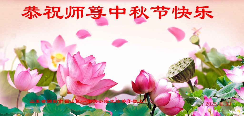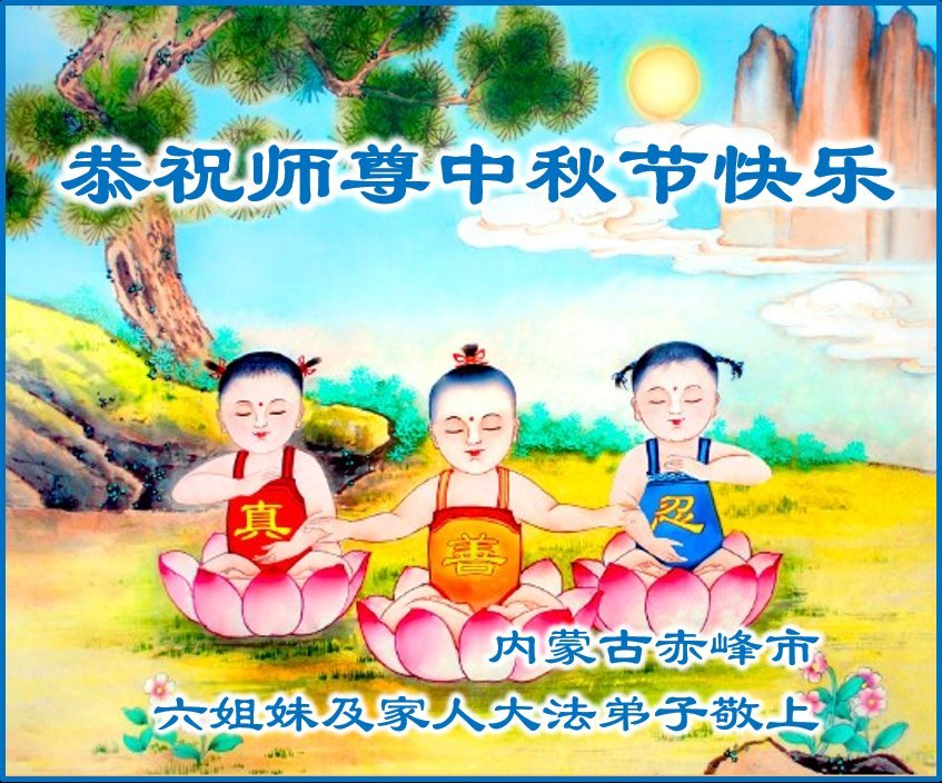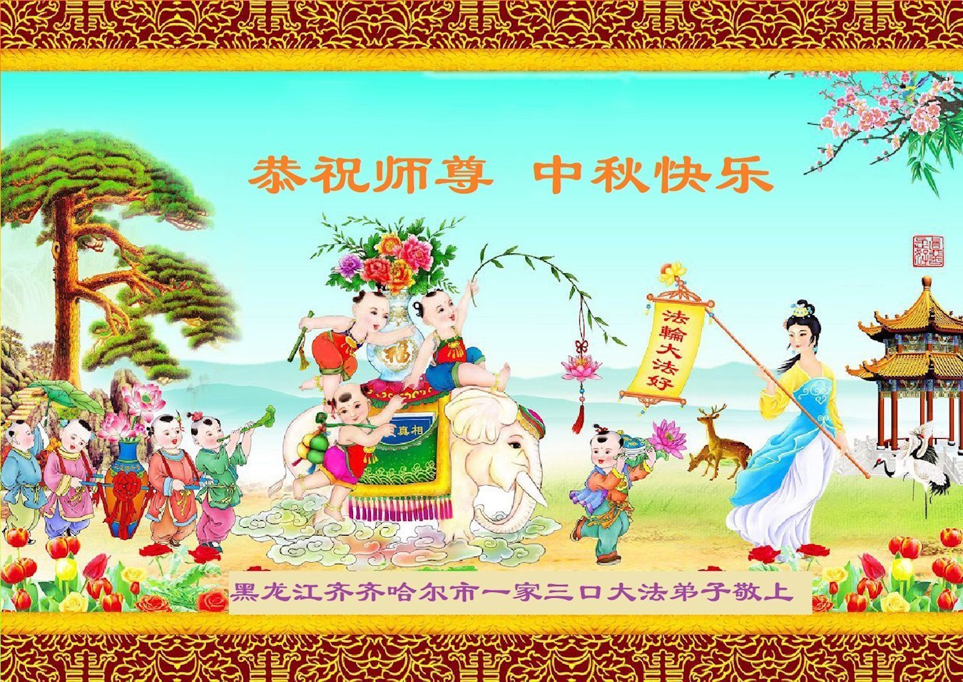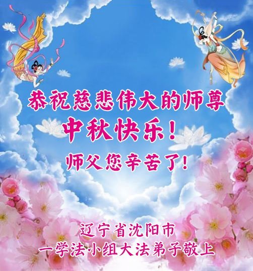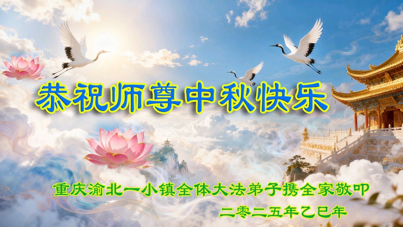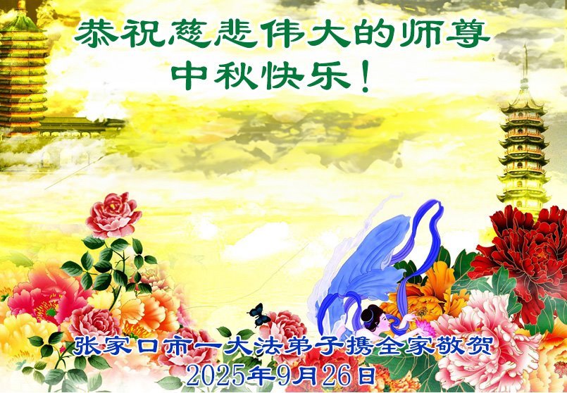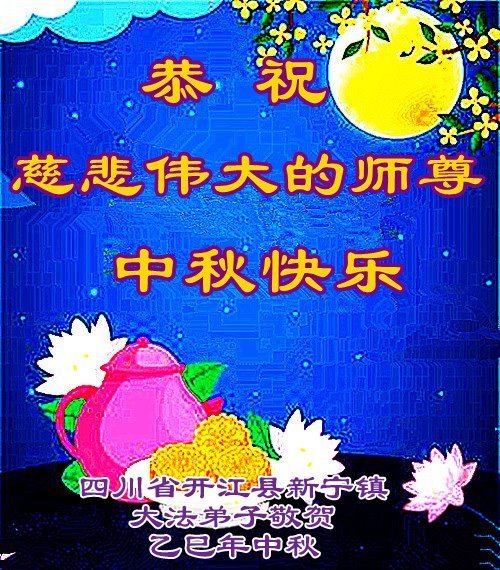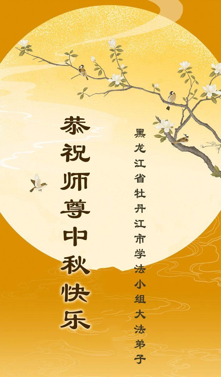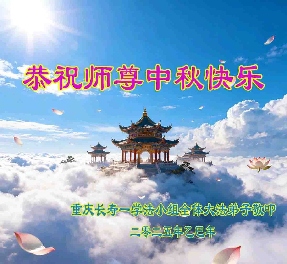 我們大法弟子攜家人和明真相的世人恭祝師尊中秋節快樂!師尊辛苦了!謝謝師尊的慈悲苦度!弟子一定破除舊勢力的安排,消除間隔,形成強大的整體,反迫害,救度眾生。弟子們要多學法,學好法,發好正念,向內找,兌現自己的誓約,跟師父回家。