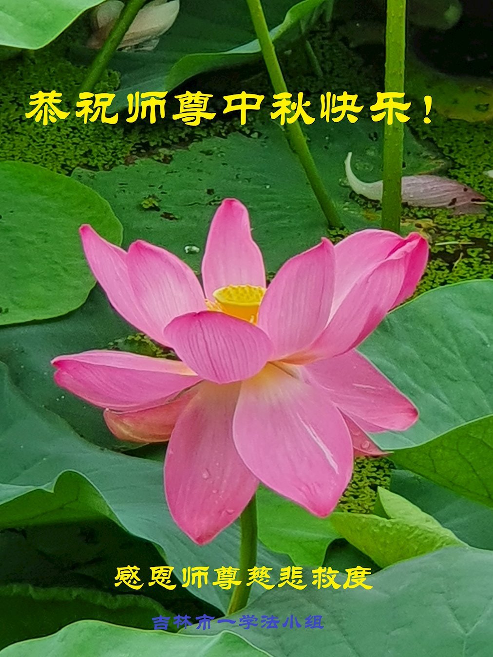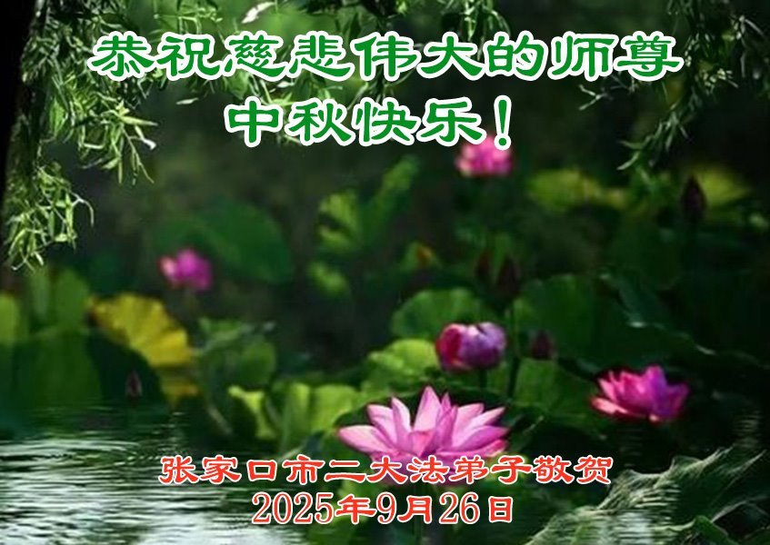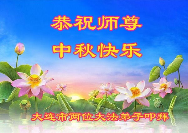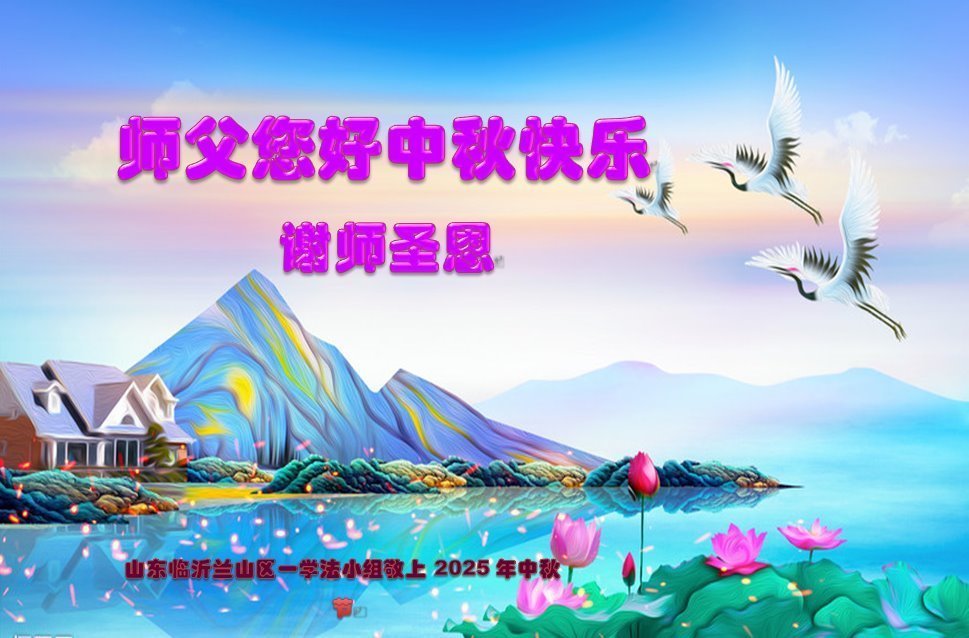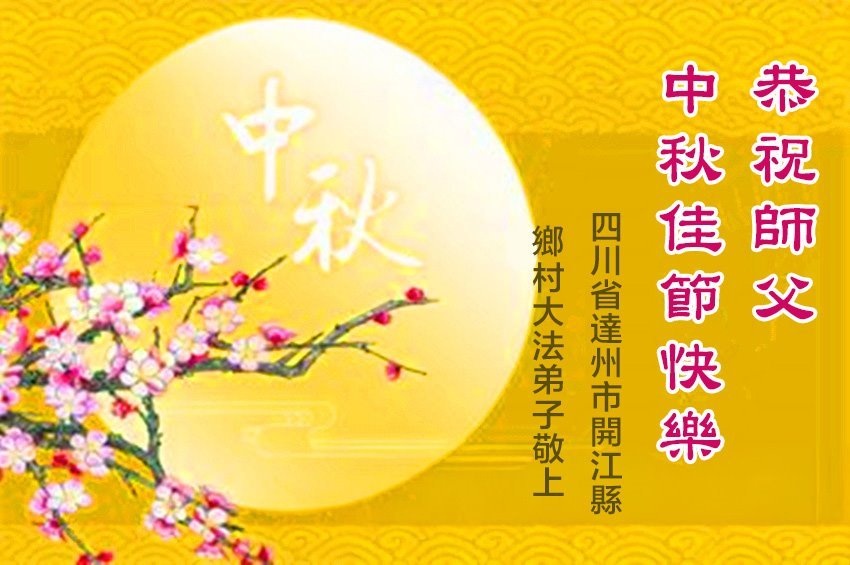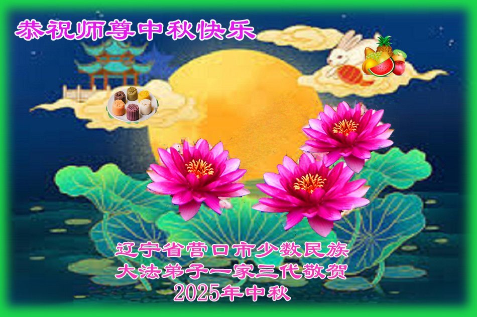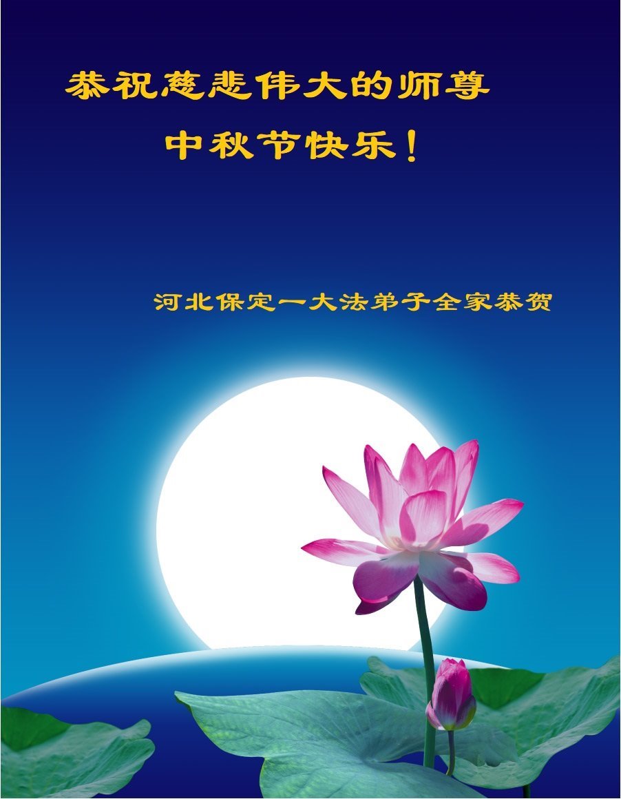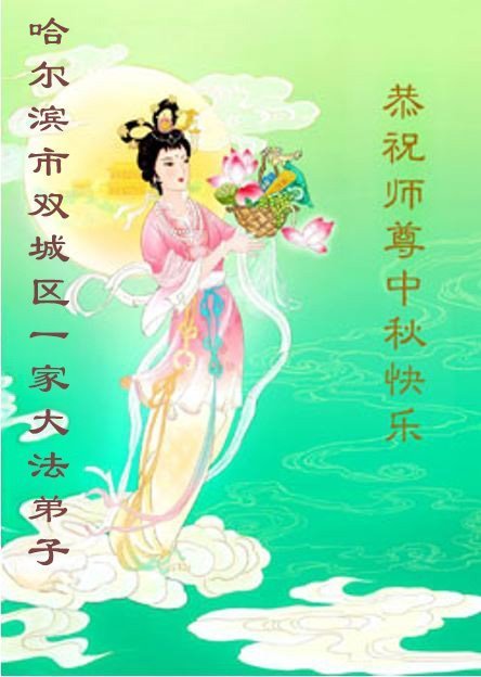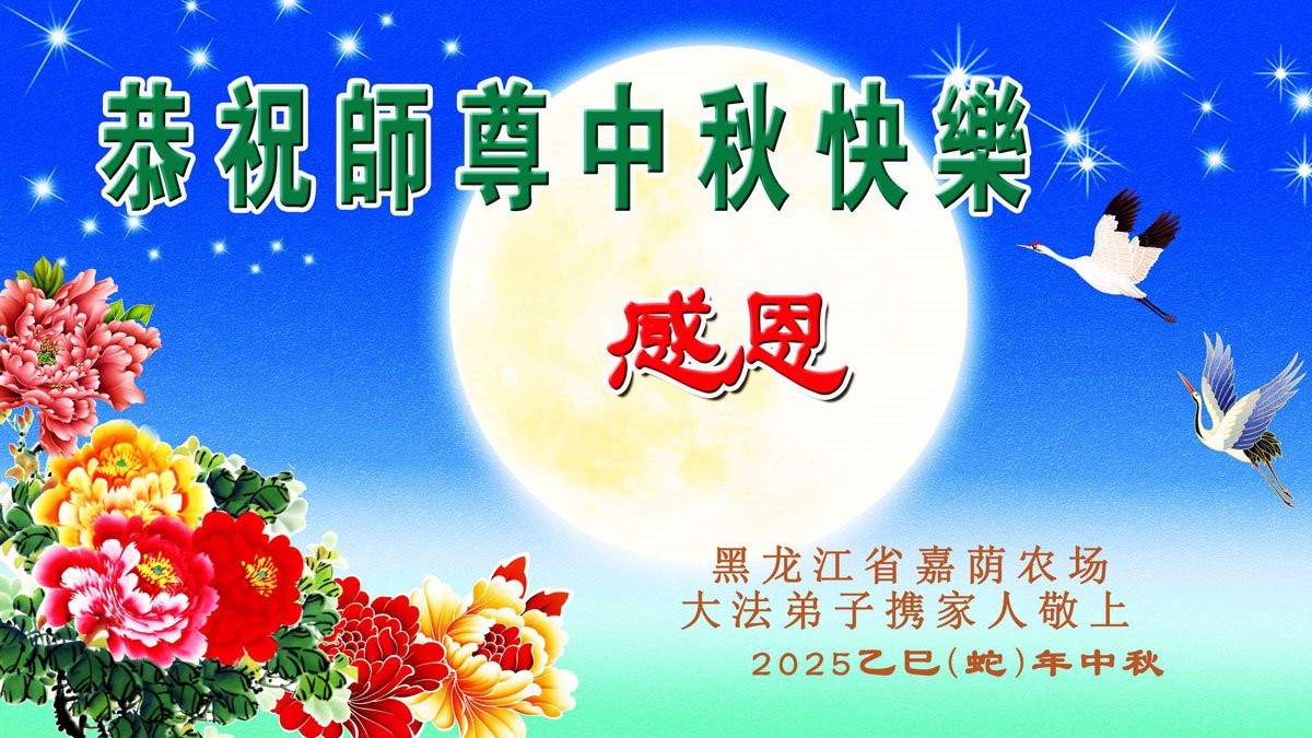 我們大法弟子攜家人和明真相的世人恭祝師尊中秋節快樂!師尊辛苦了!謝謝師尊的慈悲苦度!弟子一定破除舊勢力的安排,消除間隔,形成強大的整體,反迫害,救度眾生。弟子們要多學法,學好法,發好正念,向內找,兌現自己的誓約,跟師父回家。
