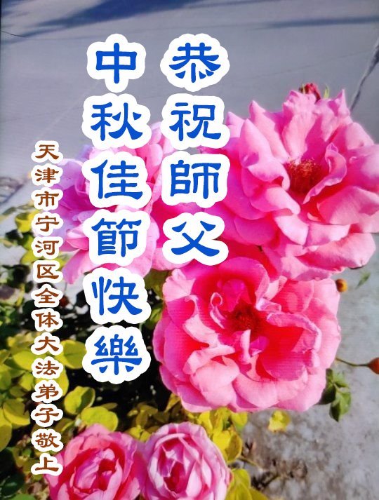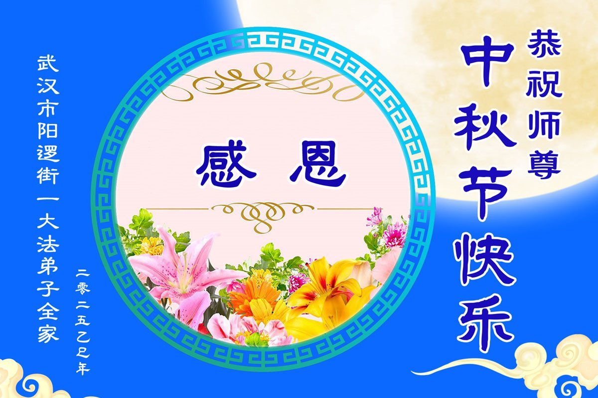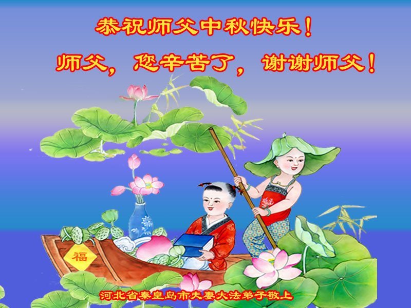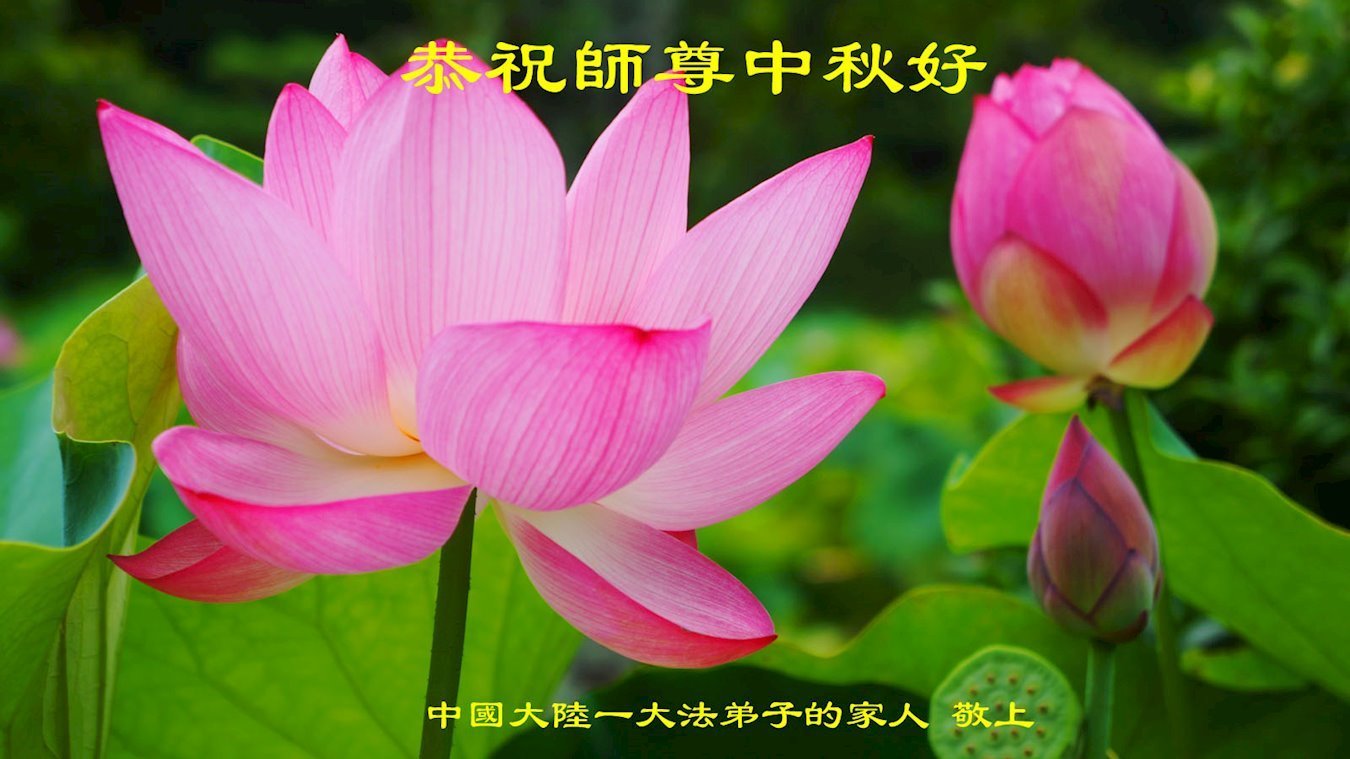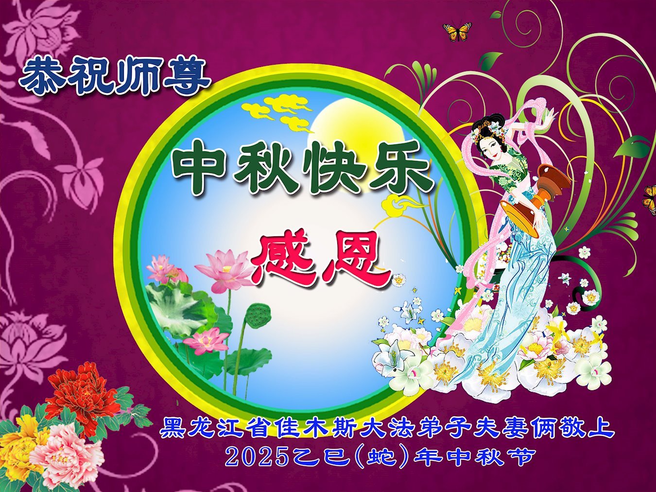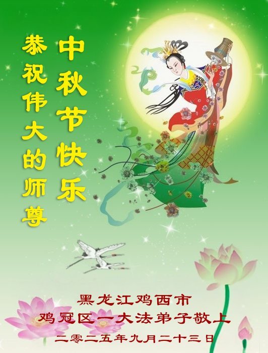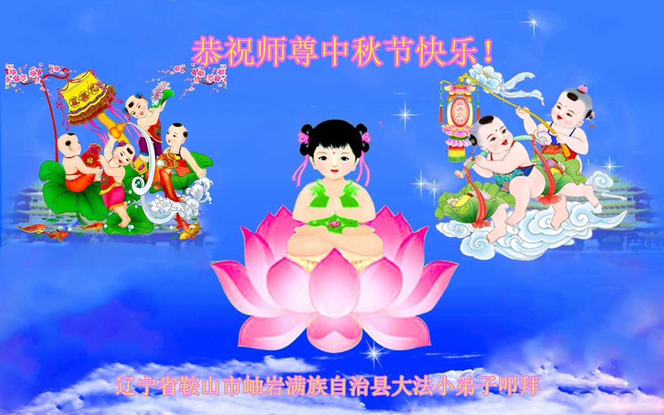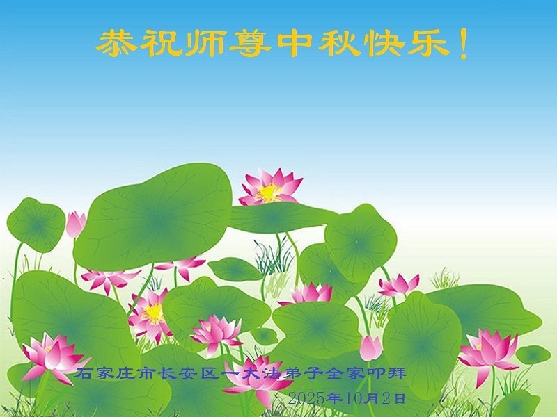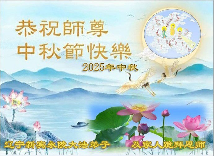 我們大法弟子攜家人和明真相的世人恭祝師尊中秋節快樂!師尊辛苦了!謝謝師尊的慈悲苦度!弟子一定破除舊勢力的安排,消除間隔,形成強大的整體,反迫害,救度眾生。弟子們要多學法,學好法,發好正念,向內找,兌現自己的誓約,跟師父回家。