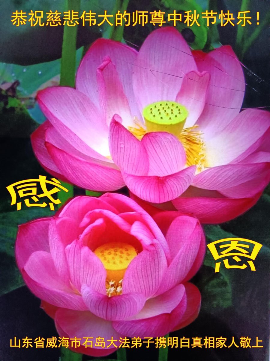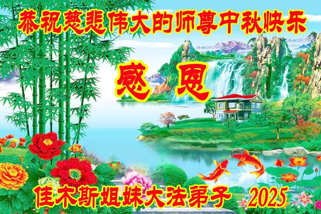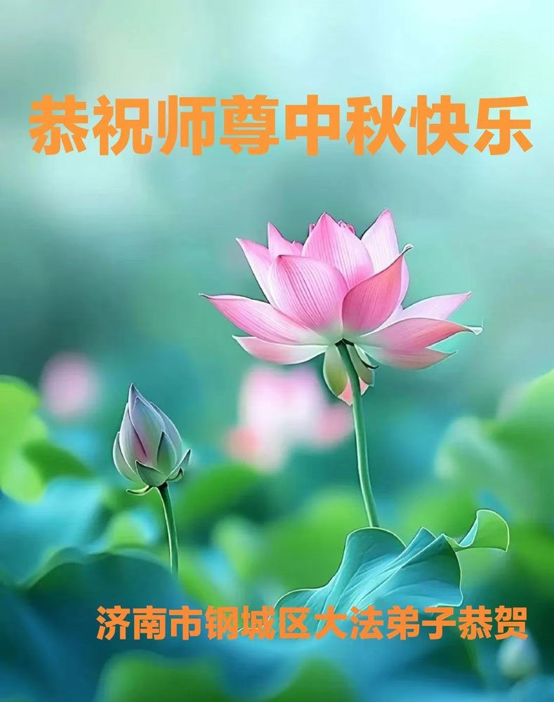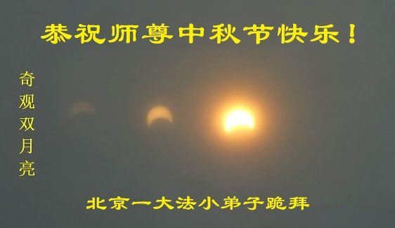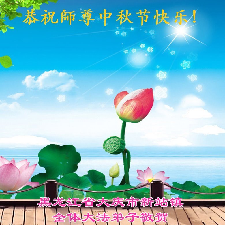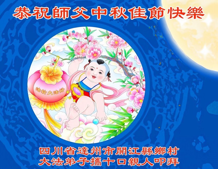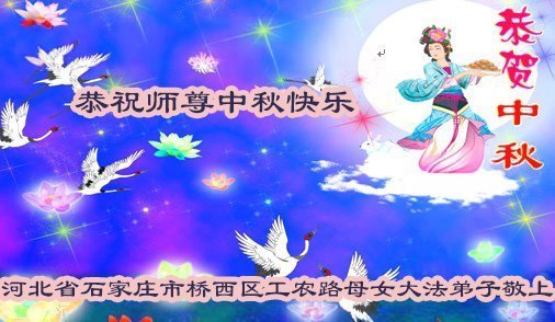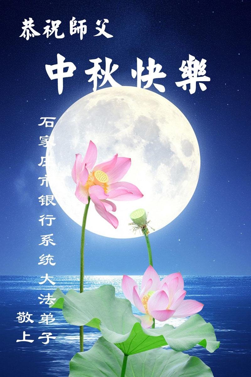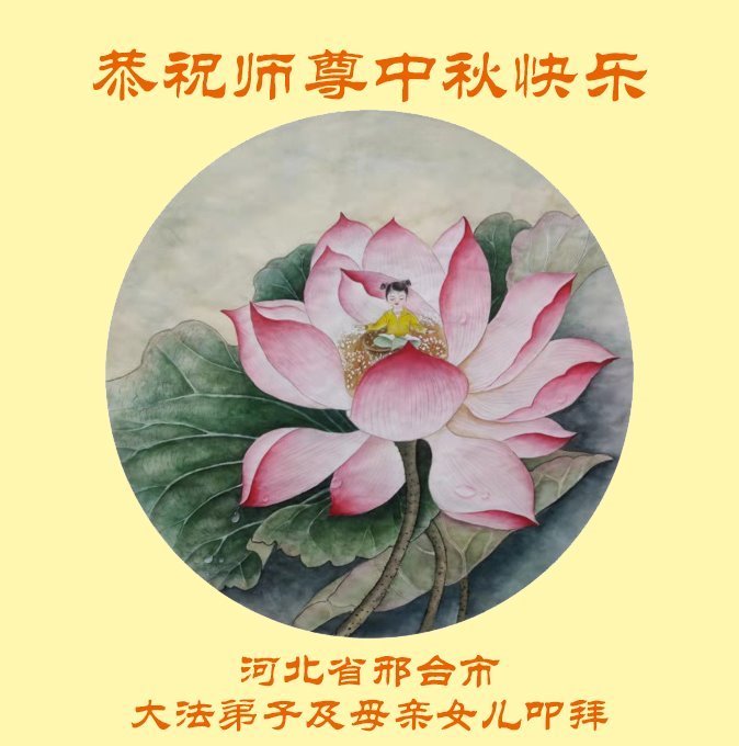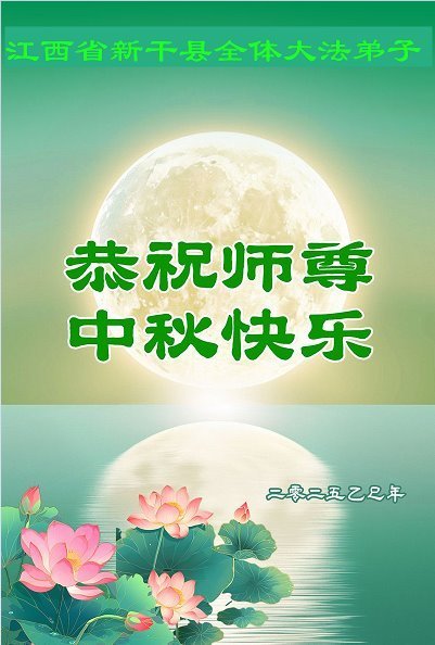 我們大法弟子攜家人和明真相的世人恭祝師尊中秋節快樂!師尊辛苦了!謝謝師尊的慈悲苦度!弟子一定破除舊勢力的安排,消除間隔,形成強大的整體,反迫害,救度眾生。弟子們要多學法,學好法,發好正念,向內找,兌現自己的誓約,跟師父回家。