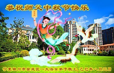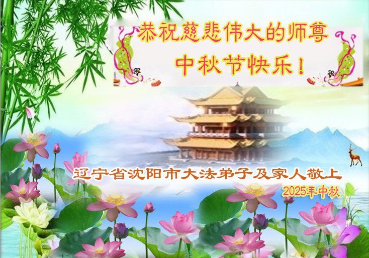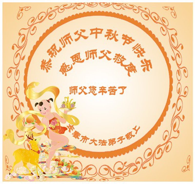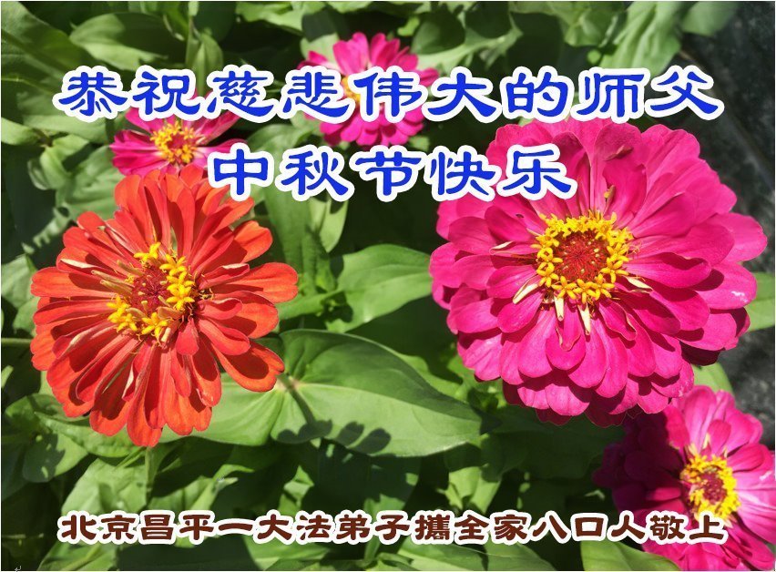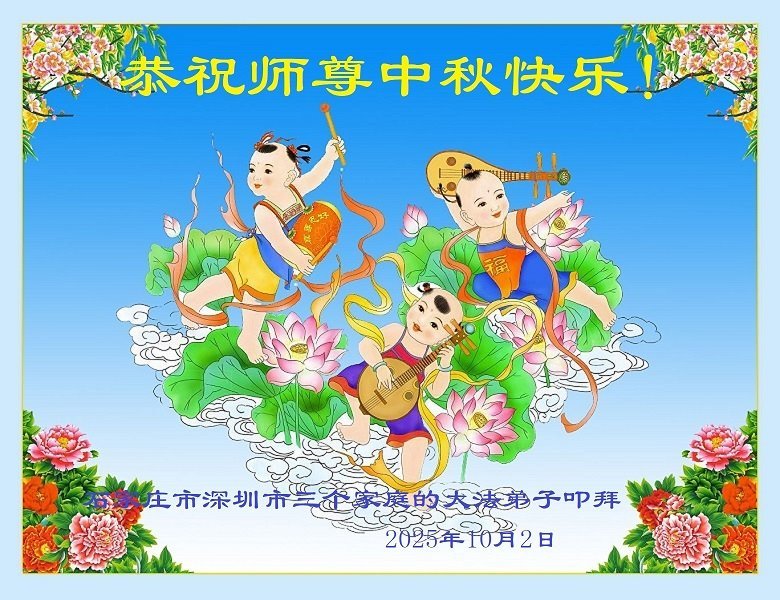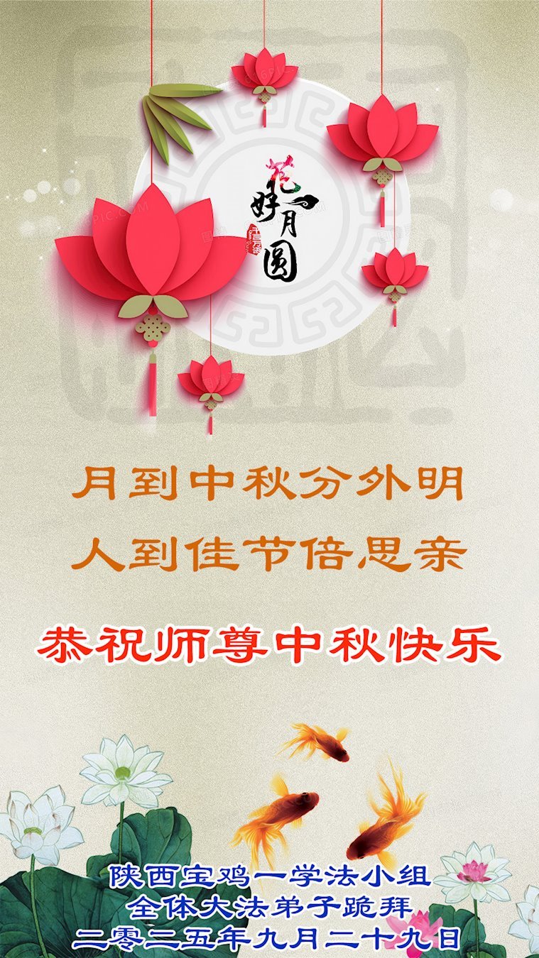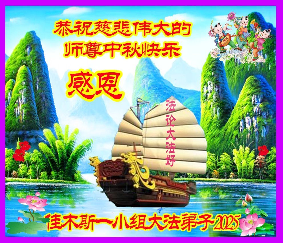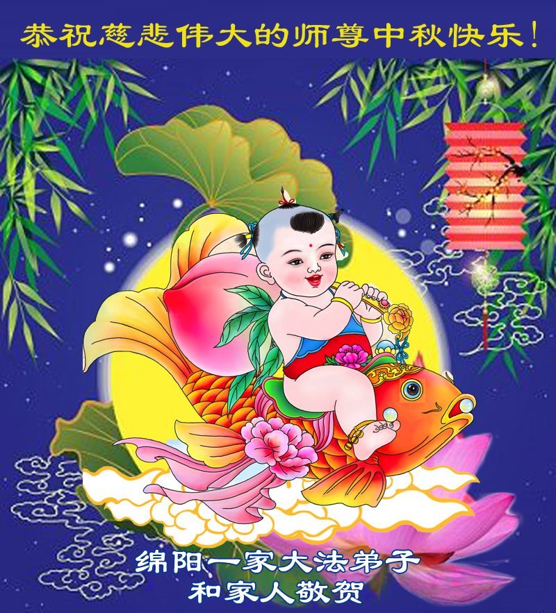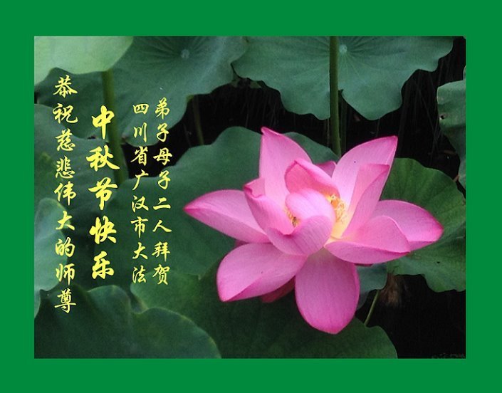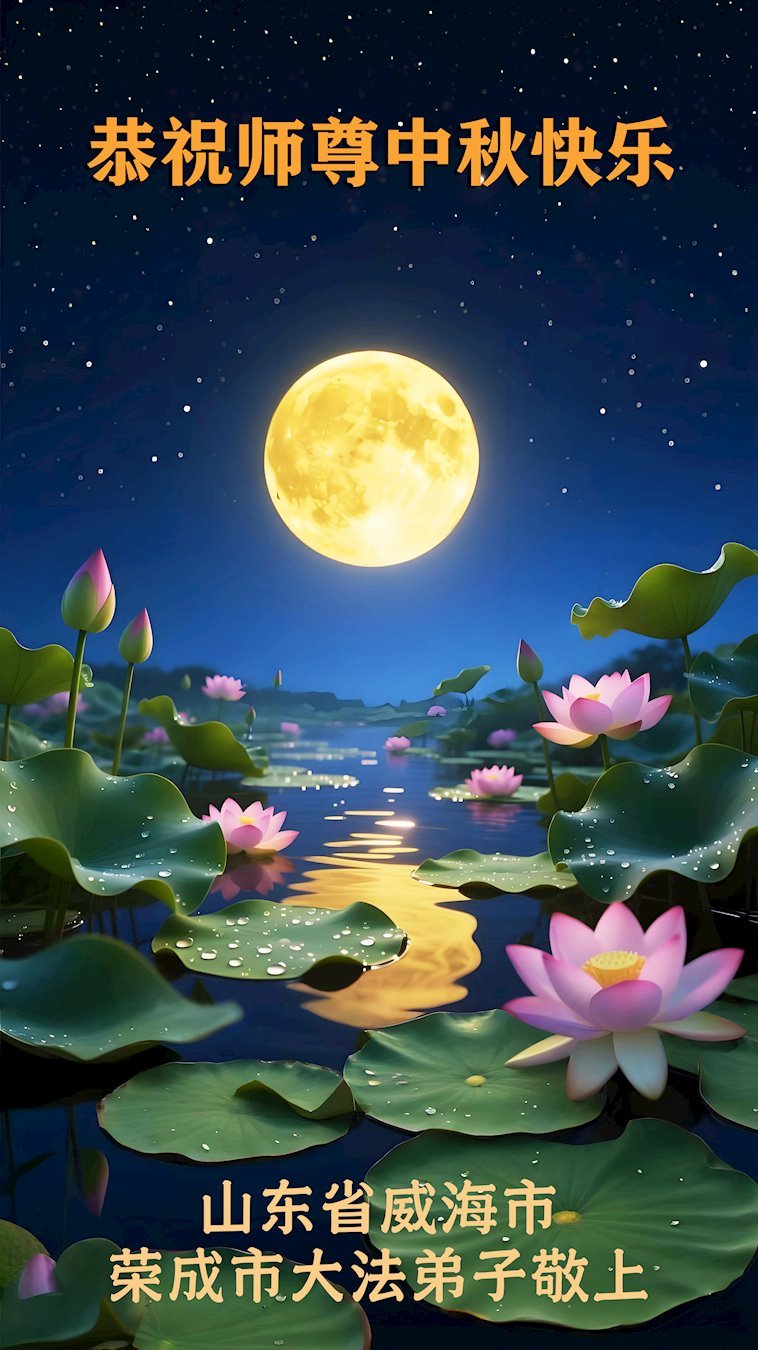 我們大法弟子攜家人和明真相的世人恭祝師尊中秋節快樂!師尊辛苦了!謝謝師尊的慈悲苦度!弟子一定破除舊勢力的安排,消除間隔,形成強大的整體,反迫害,救度眾生。弟子們要多學法,學好法,發好正念,向內找,兌現自己的誓約,跟師父回家。