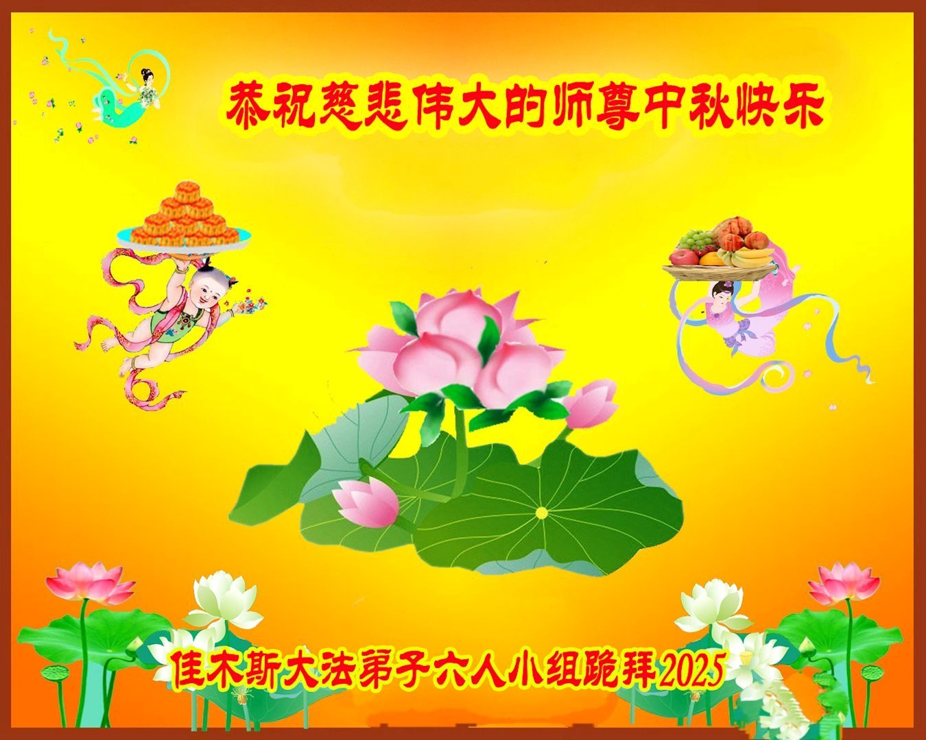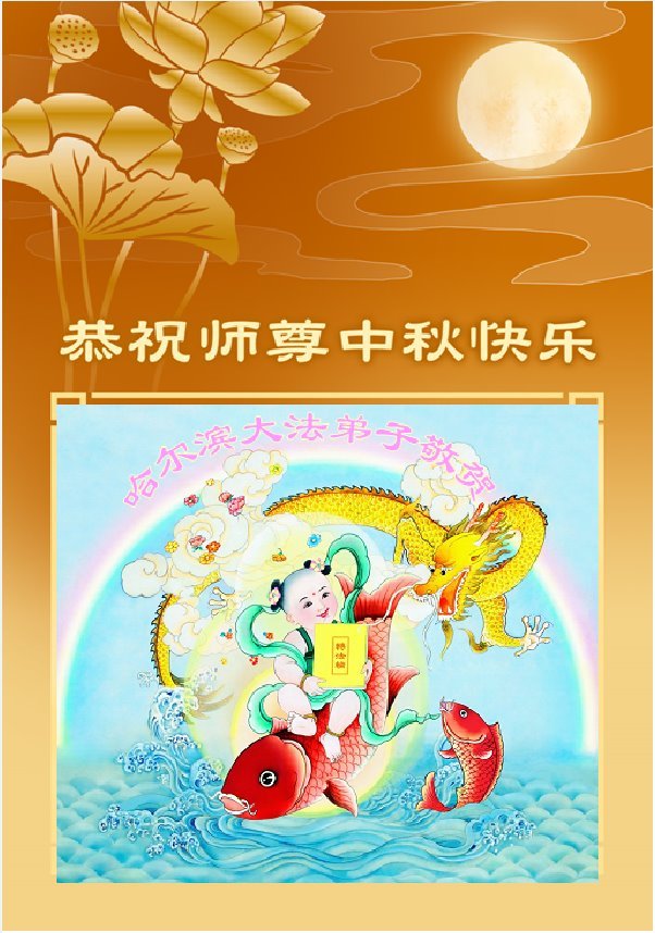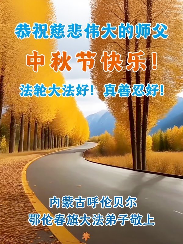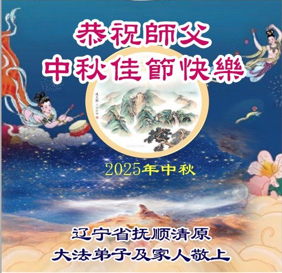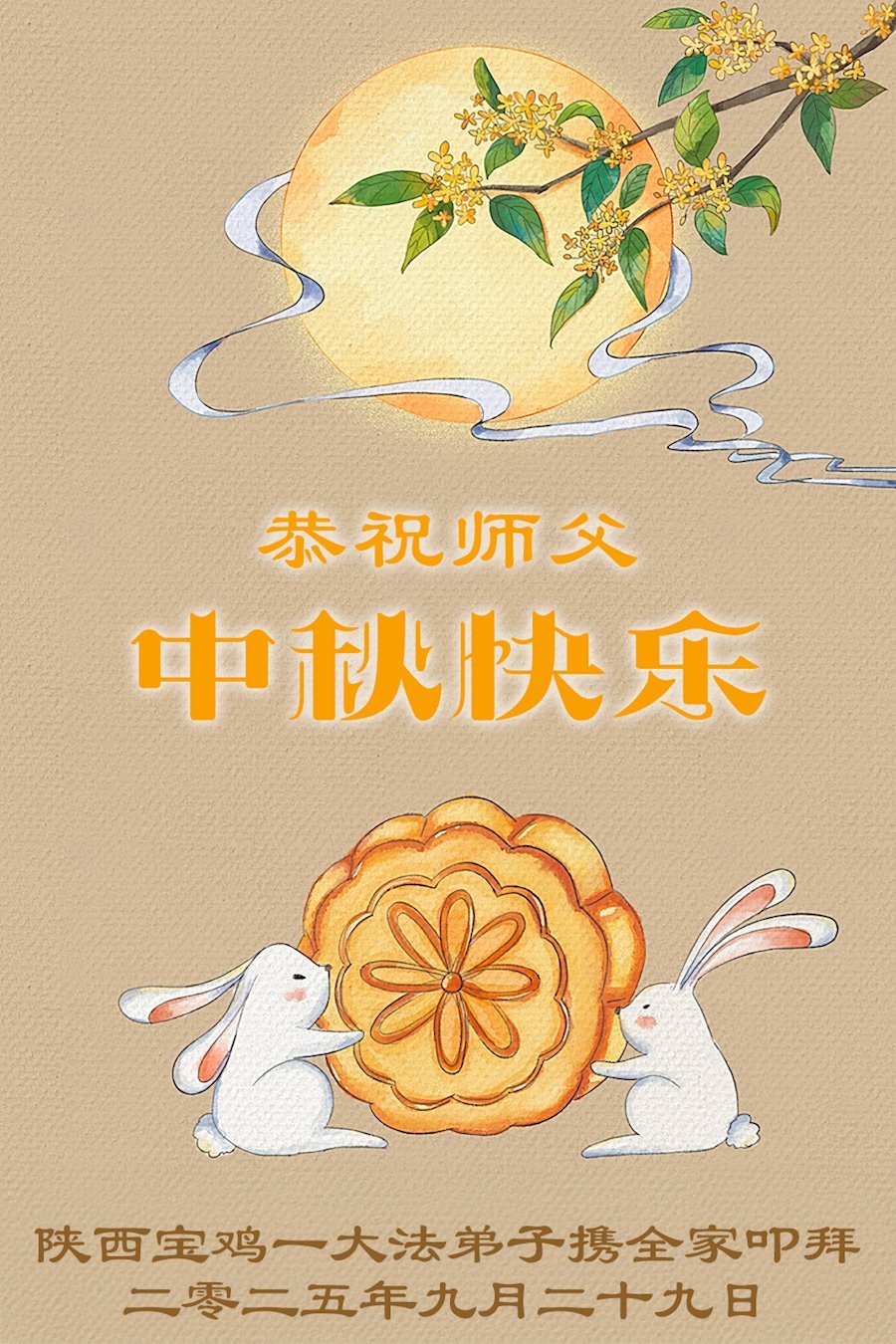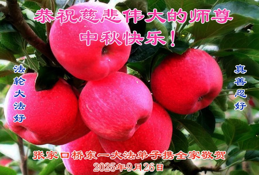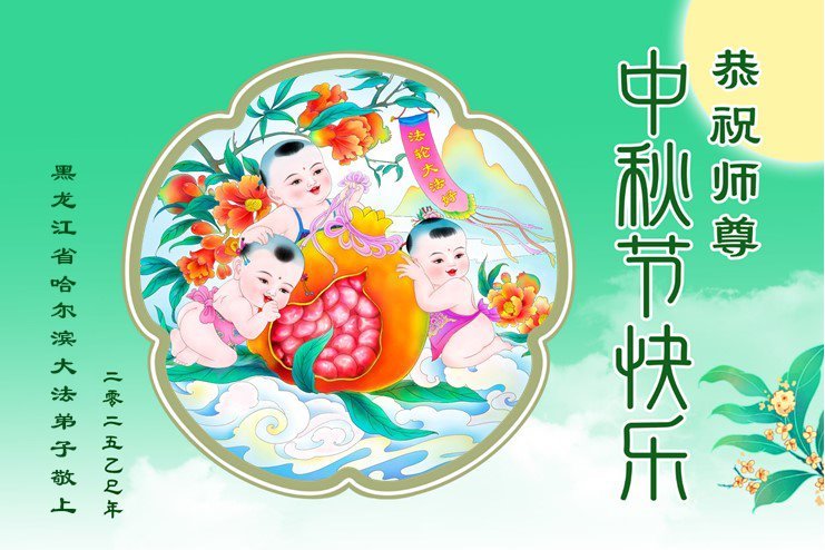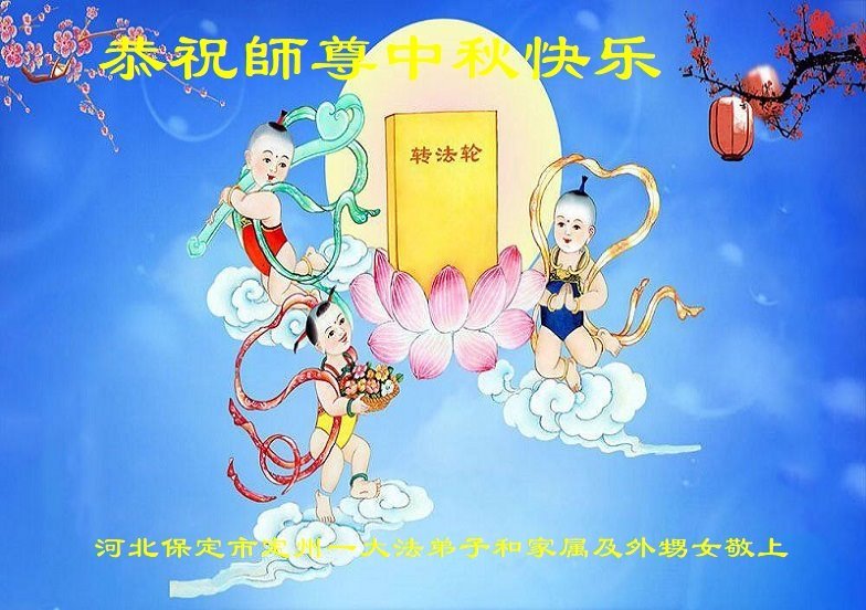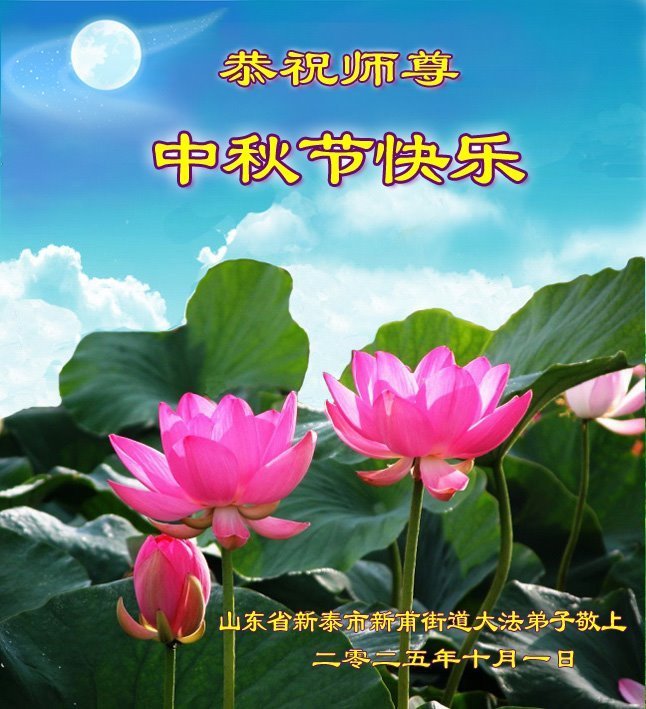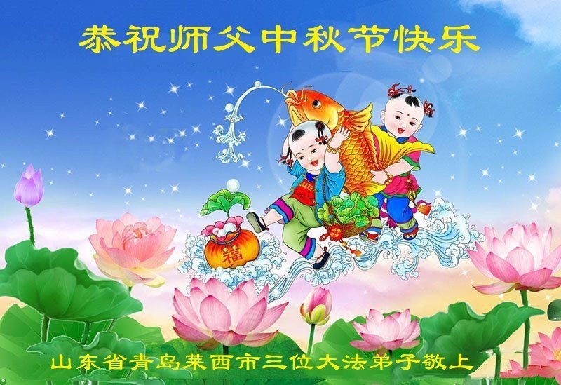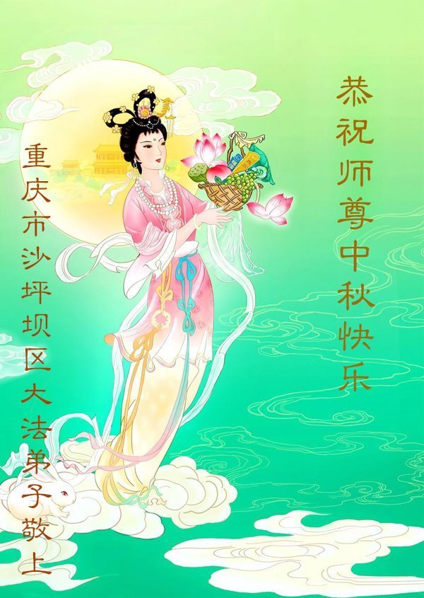 我們大法弟子攜家人和明真相的世人恭祝師尊中秋節快樂!師尊辛苦了!謝謝師尊的慈悲苦度!弟子一定破除舊勢力的安排,消除間隔,形成強大的整體,反迫害,救度眾生。弟子們要多學法,學好法,發好正念,向內找,兌現自己的誓約,跟師父回家。