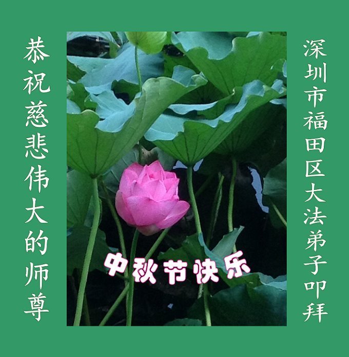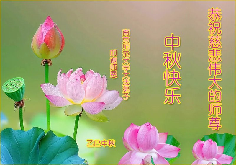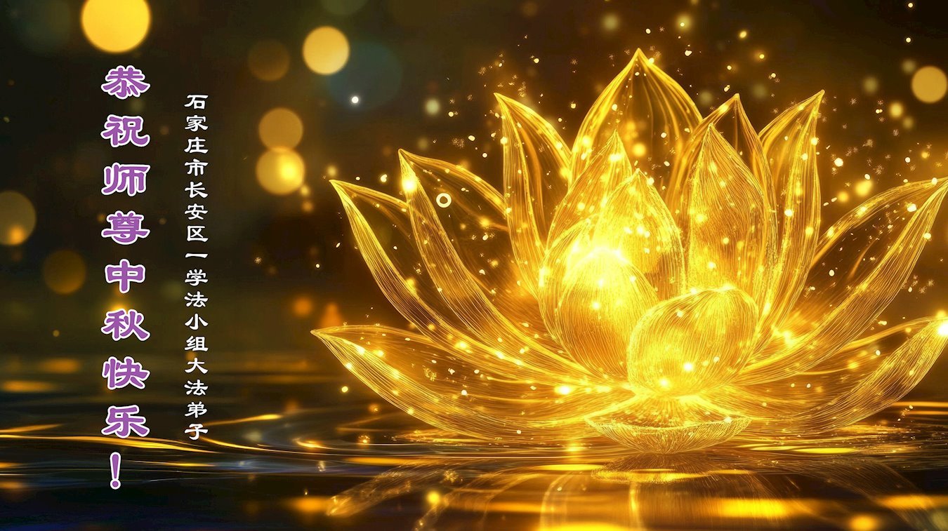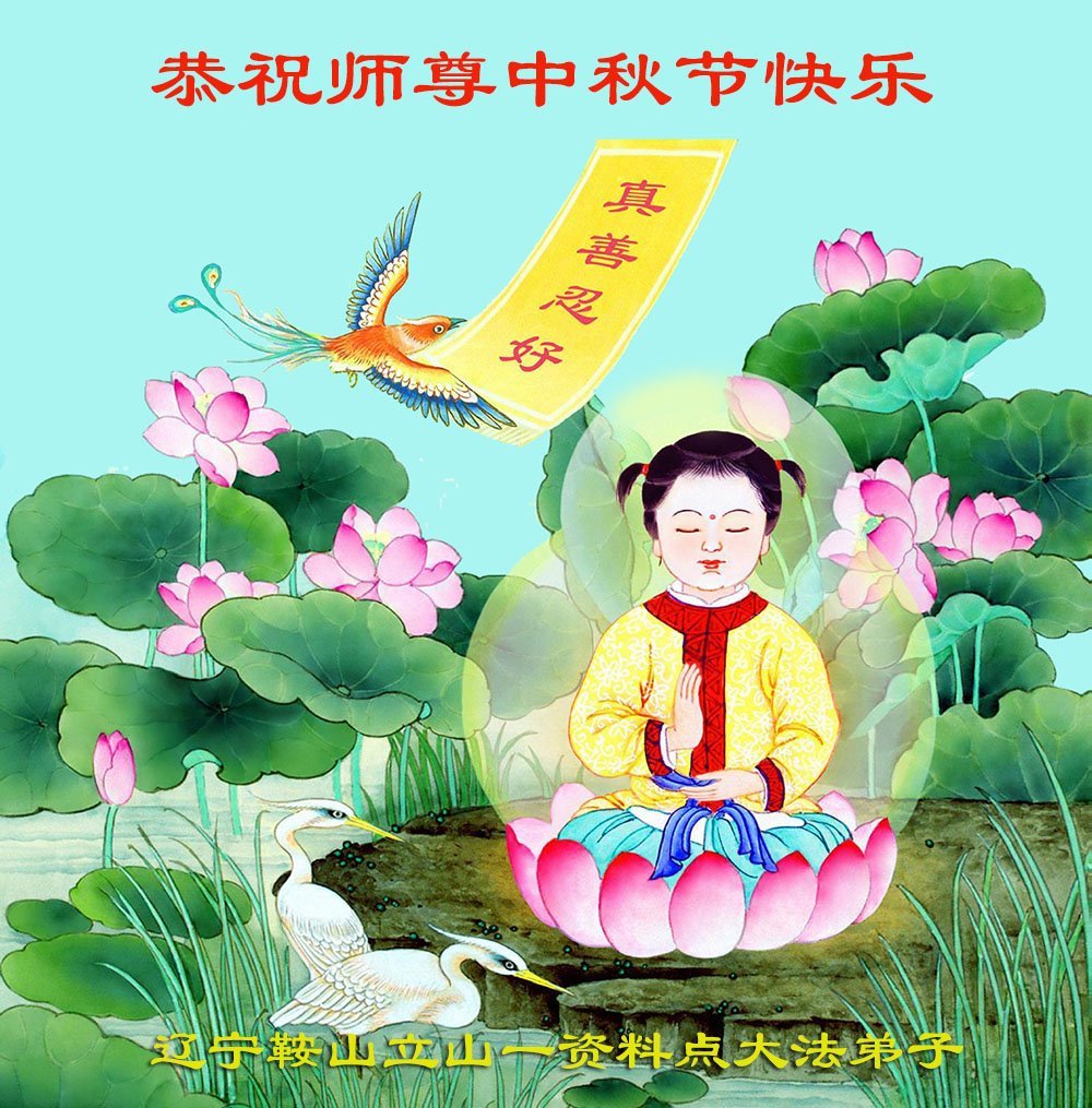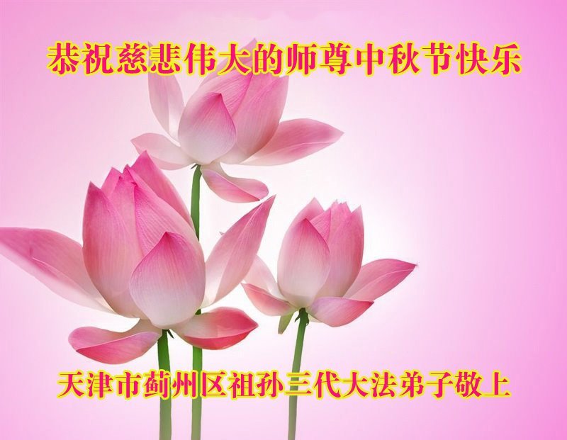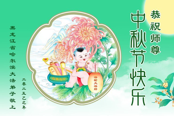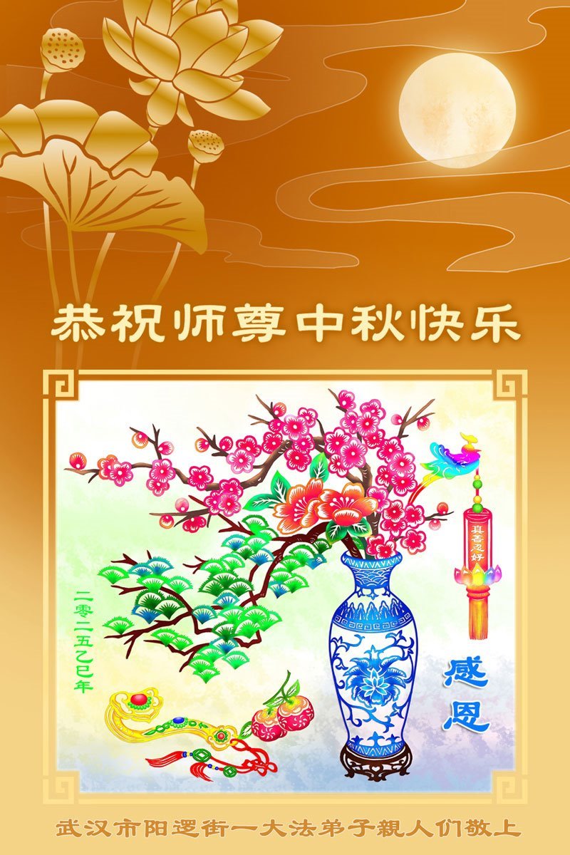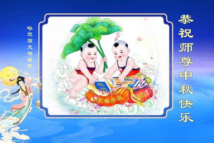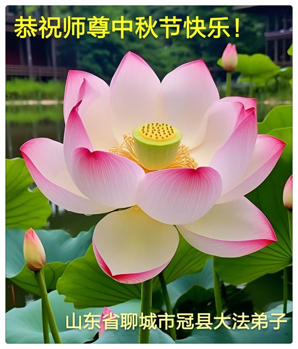 我們大法弟子攜家人和明真相的世人恭祝師尊中秋節快樂!師尊辛苦了!謝謝師尊的慈悲苦度!弟子一定破除舊勢力的安排,消除間隔,形成強大的整體,反迫害,救度眾生。弟子們要多學法,學好法,發好正念,向內找,兌現自己的誓約,跟師父回家。