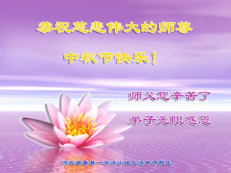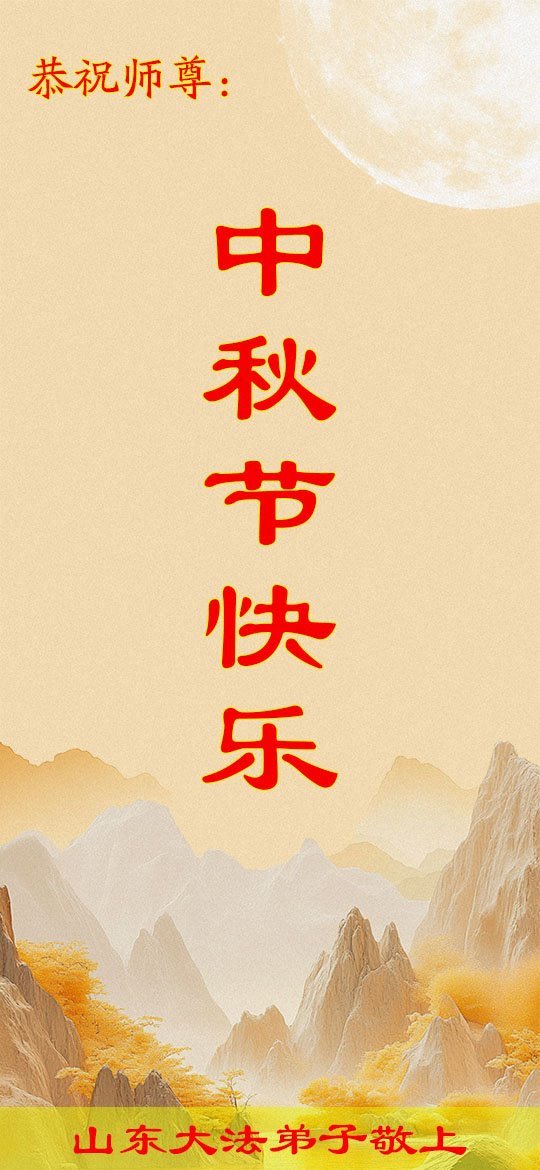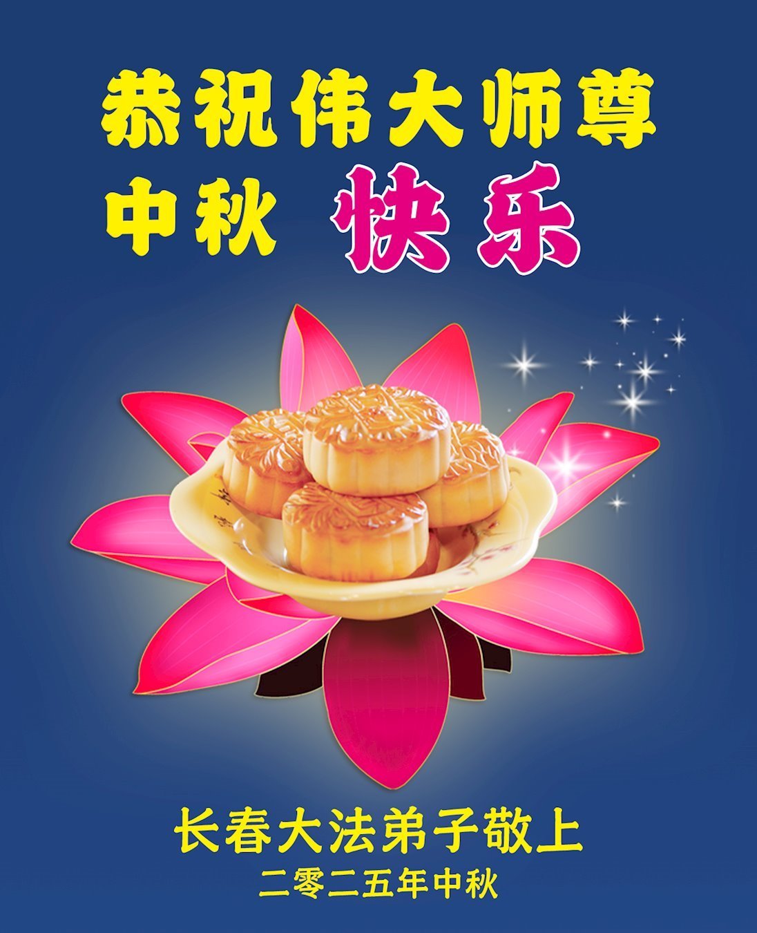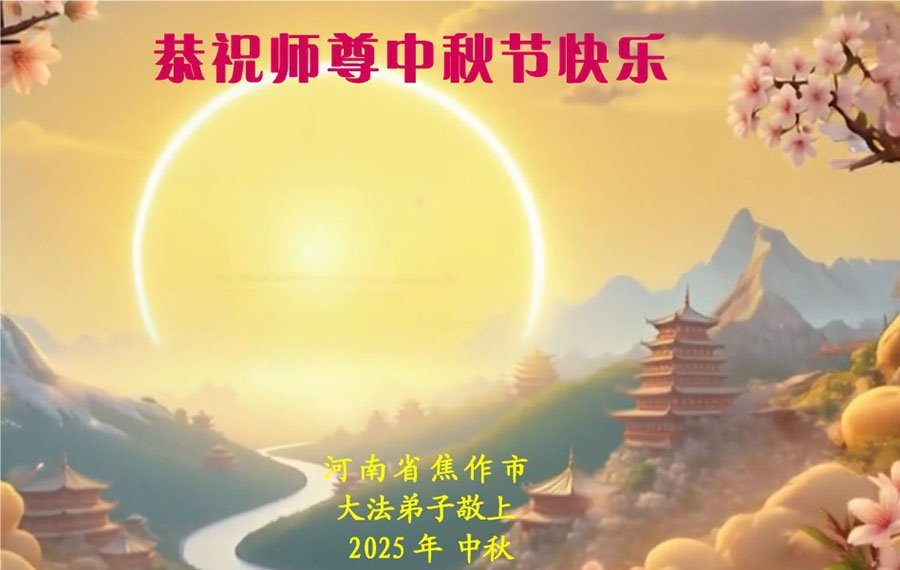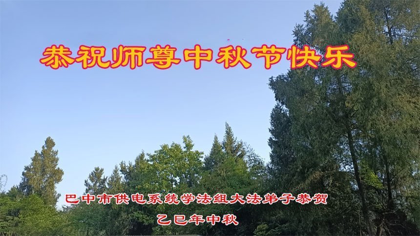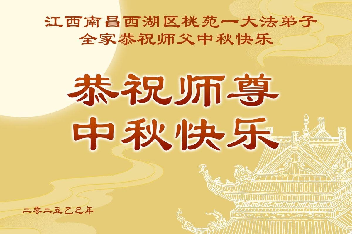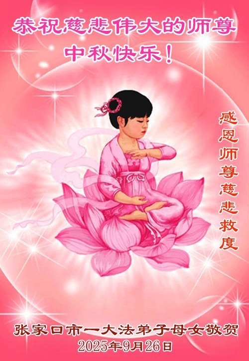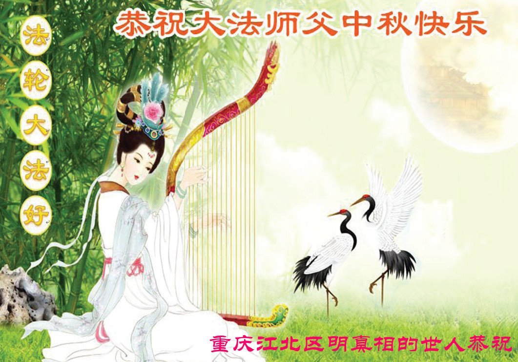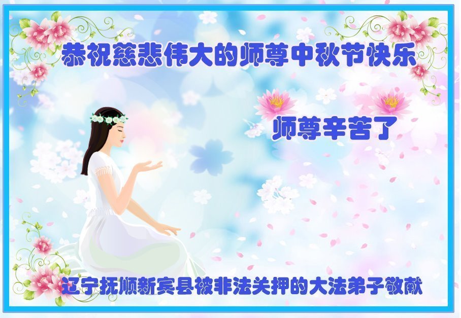 我們大法弟子攜家人和明真相的世人恭祝師尊中秋節快樂!師尊辛苦了!謝謝師尊的慈悲苦度!弟子一定破除舊勢力的安排,消除間隔,形成強大的整體,反迫害,救度眾生。弟子們要多學法,學好法,發好正念,向內找,兌現自己的誓約,跟師父回家。