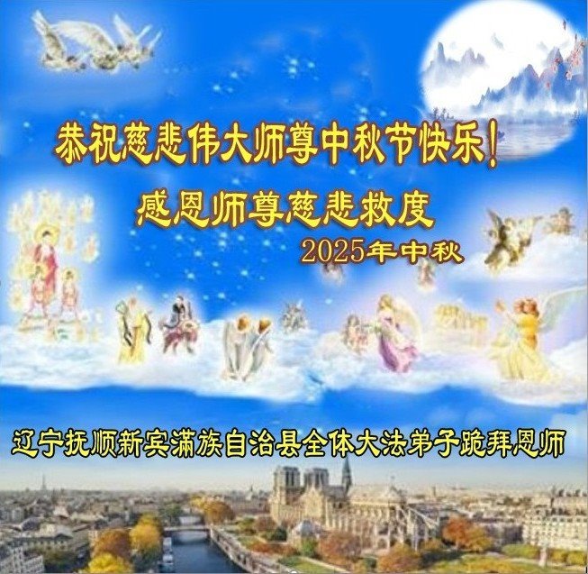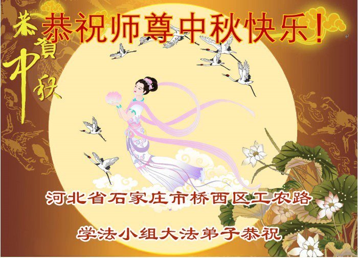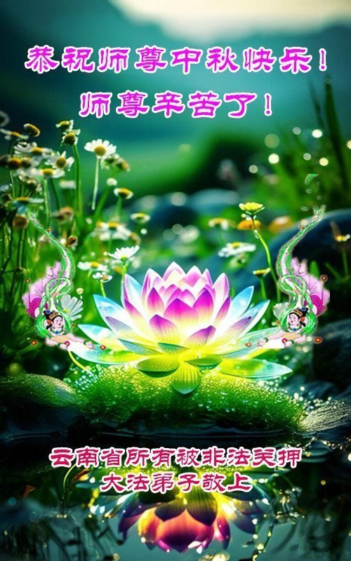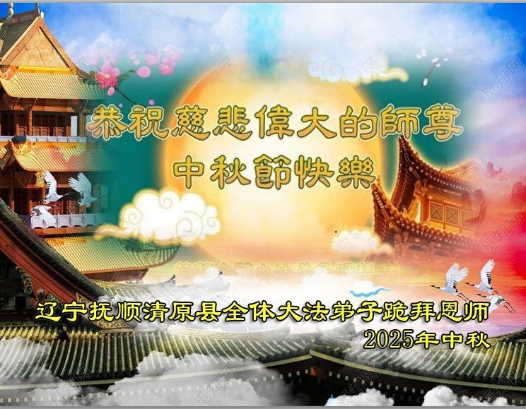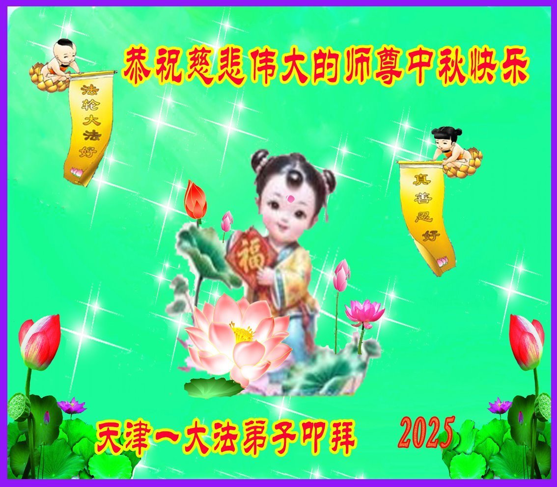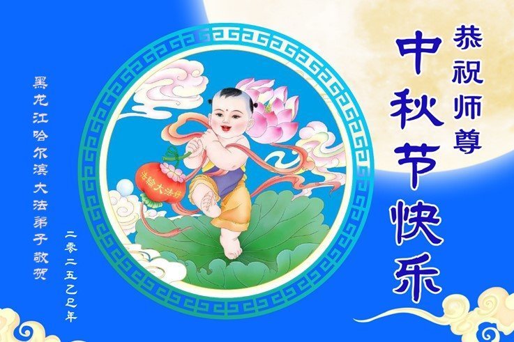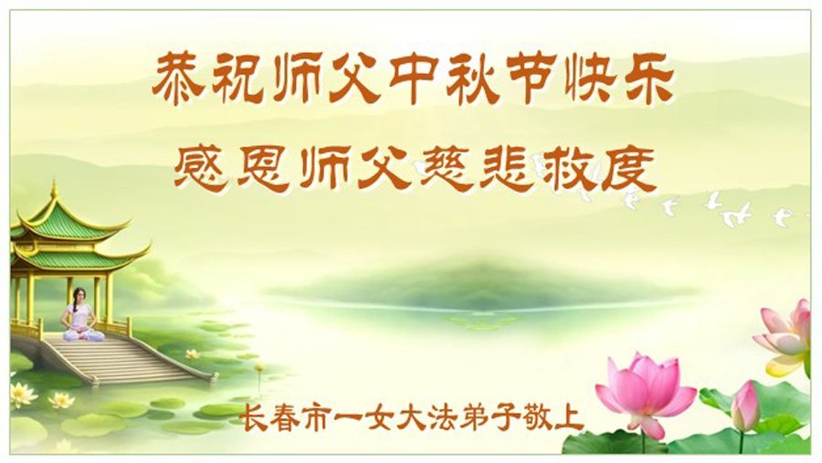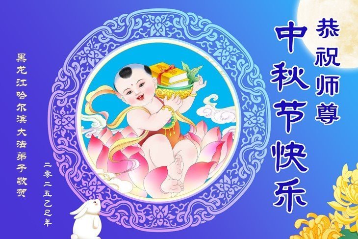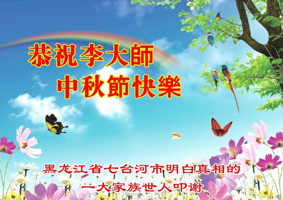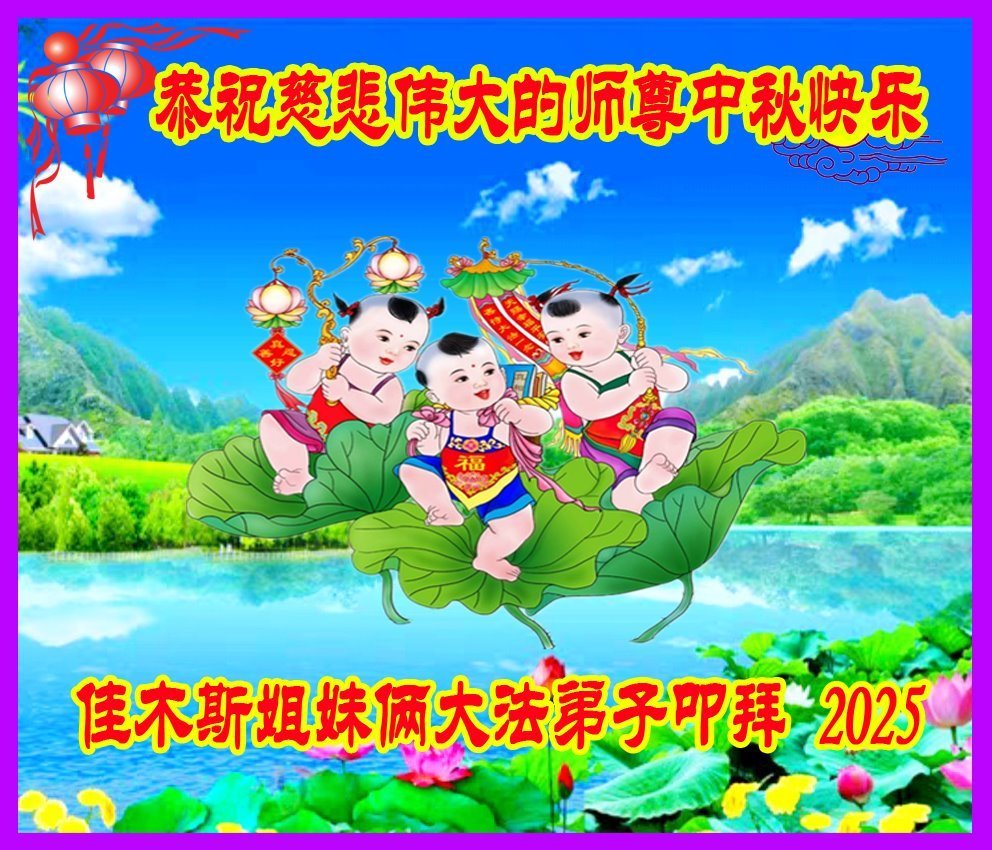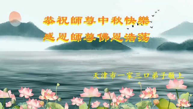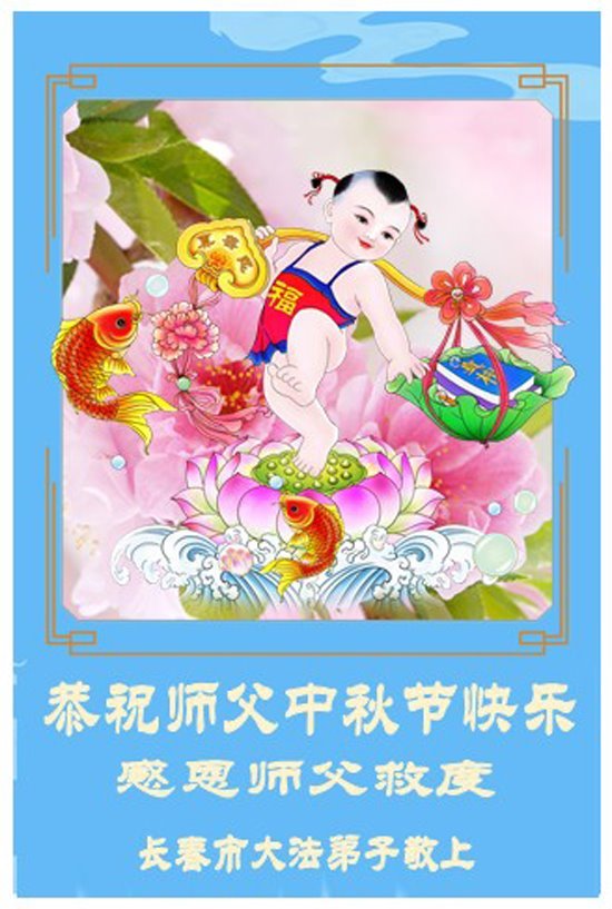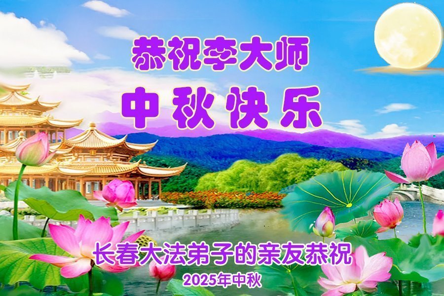 我們大法弟子攜家人和明真相的世人恭祝師尊中秋節快樂!師尊辛苦了!謝謝師尊的慈悲苦度!弟子一定破除舊勢力的安排,消除間隔,形成強大的整體,反迫害,救度眾生。弟子們要多學法,學好法,發好正念,向內找,兌現自己的誓約,跟師父回家。