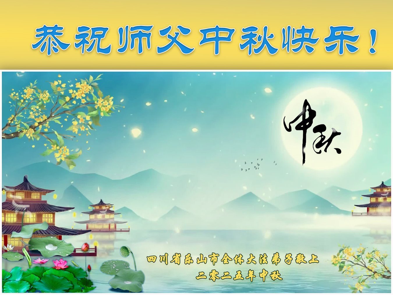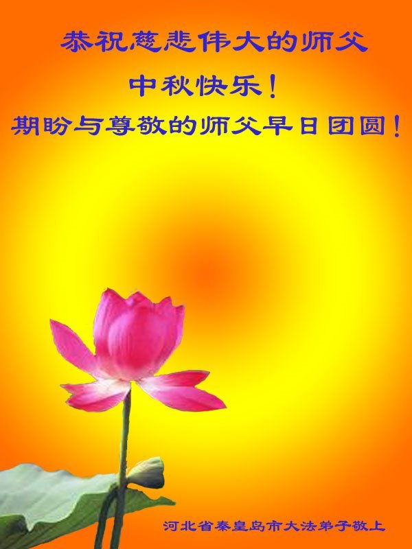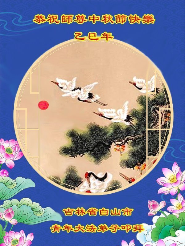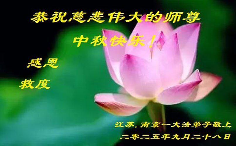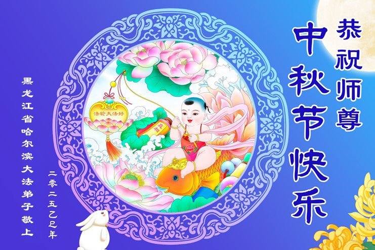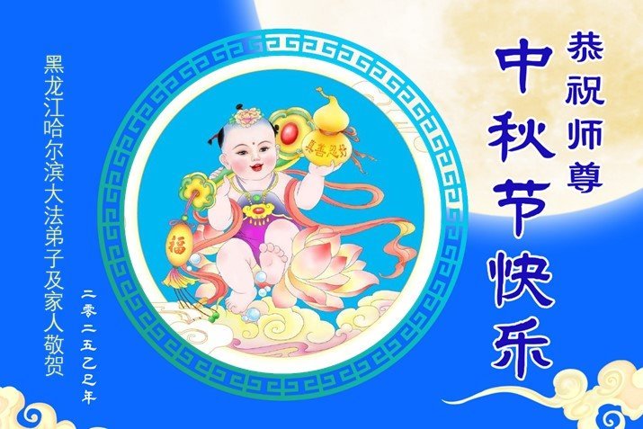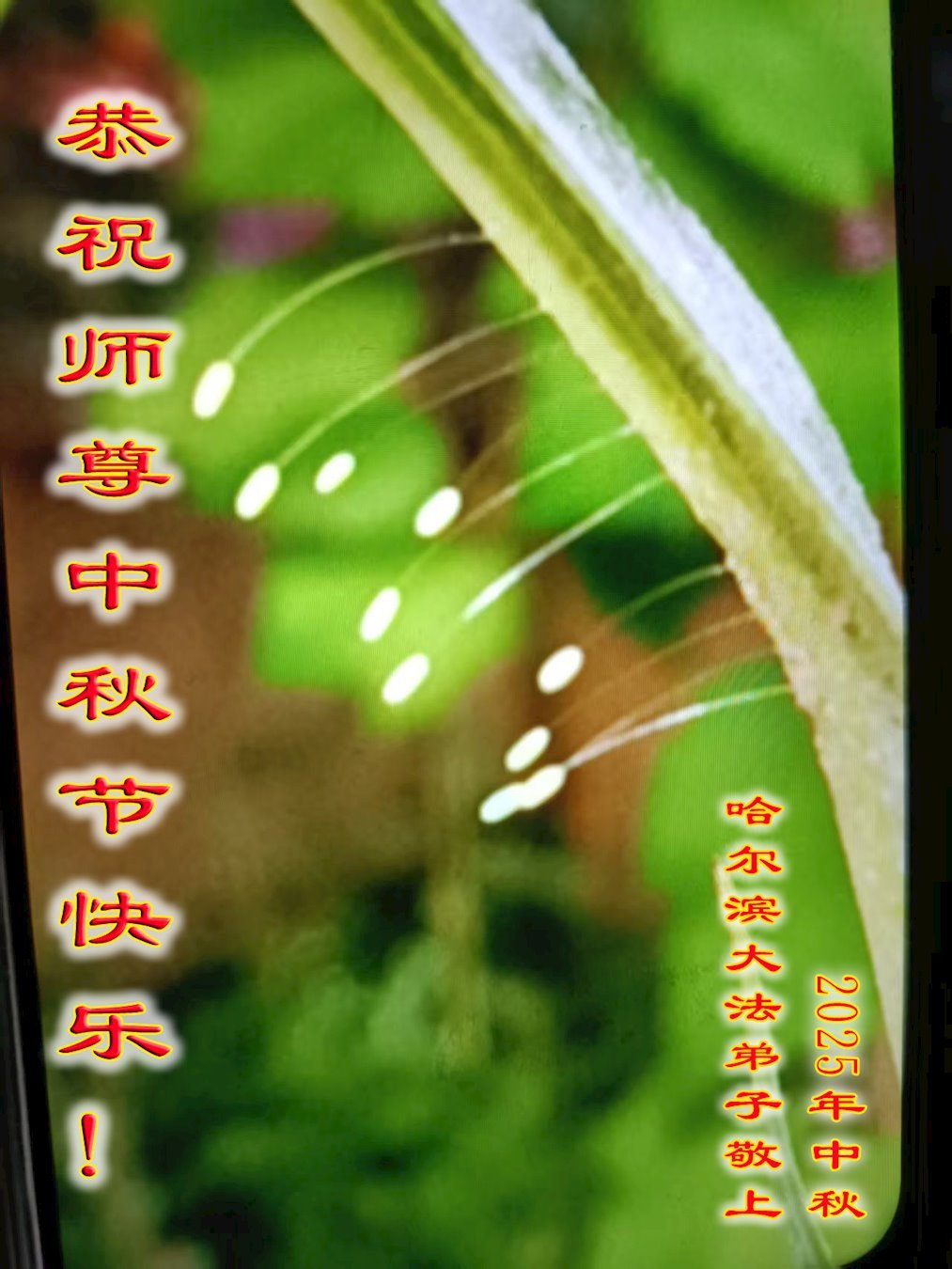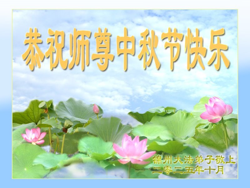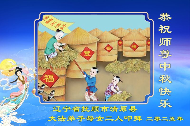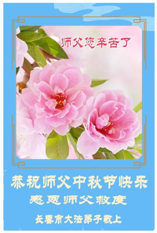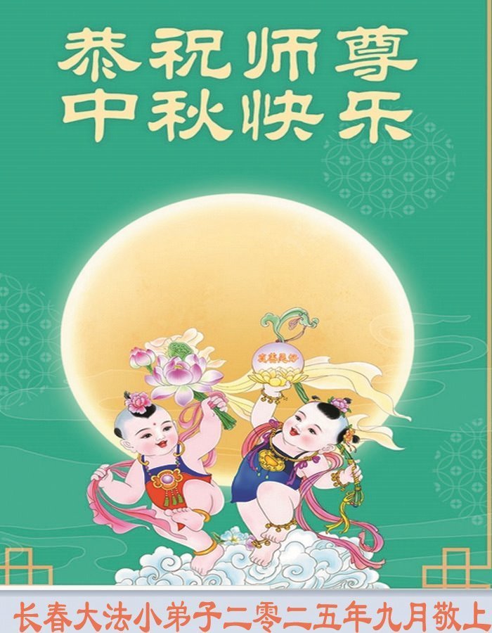 我們大法弟子攜家人和明真相的世人恭祝師尊中秋節快樂!師尊辛苦了!謝謝師尊的慈悲苦度!弟子一定破除舊勢力的安排,消除間隔,形成強大的整體,反迫害,救度眾生。弟子們要多學法,學好法,發好正念,向內找,兌現自己的誓約,跟師父回家。
