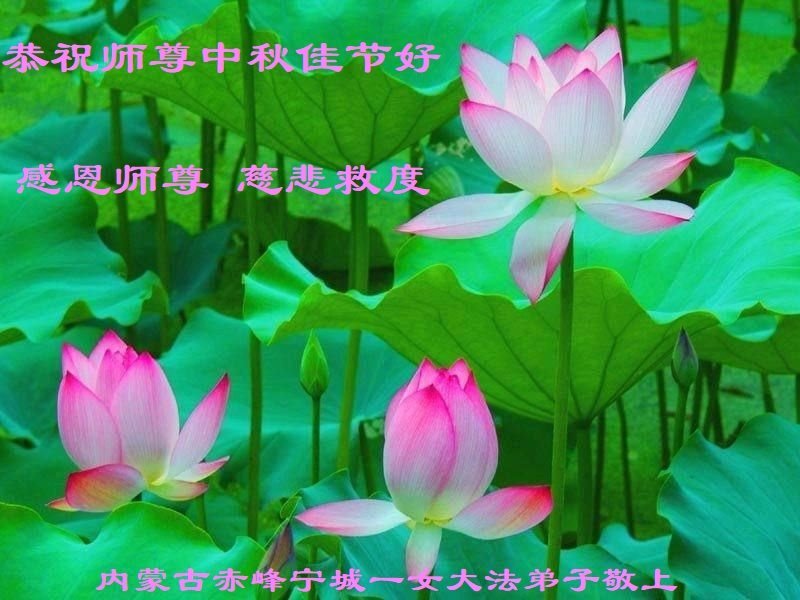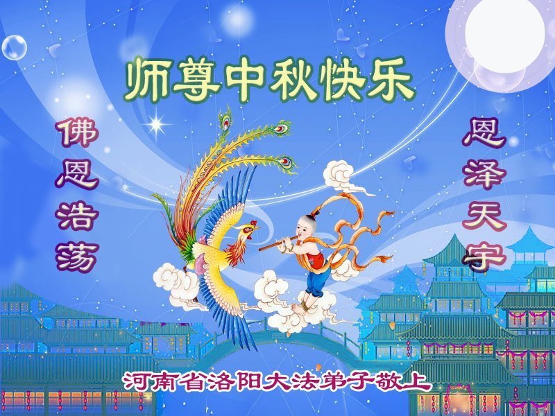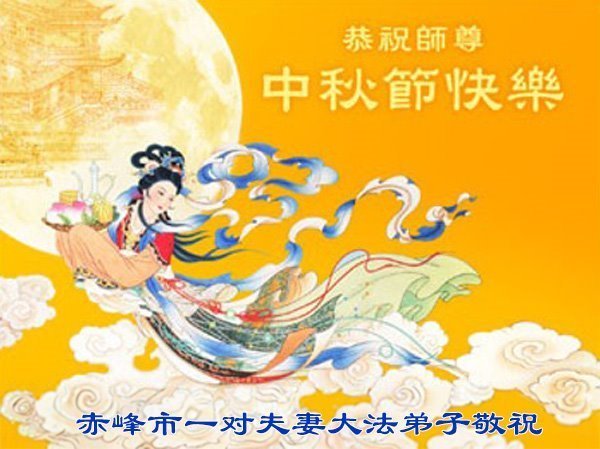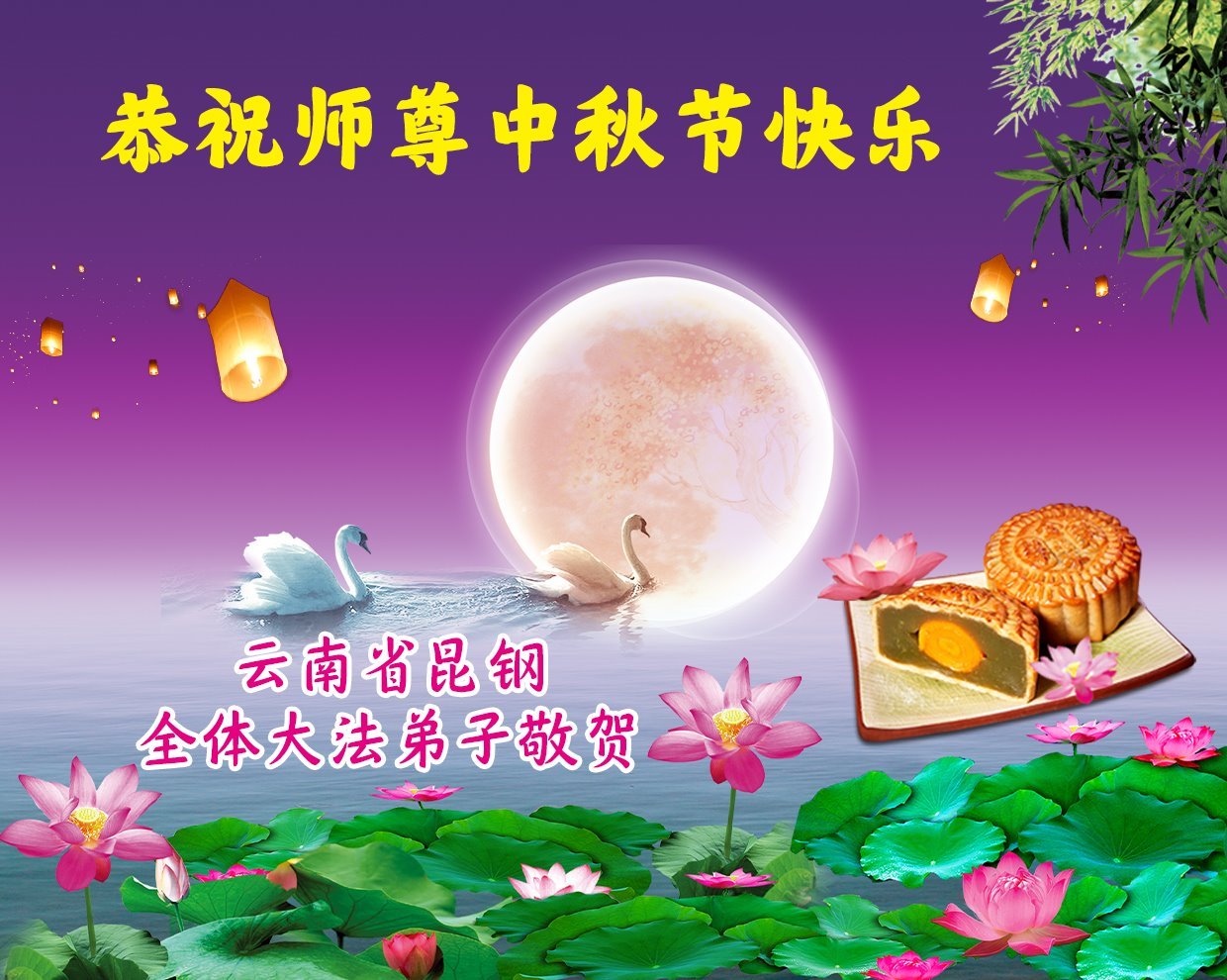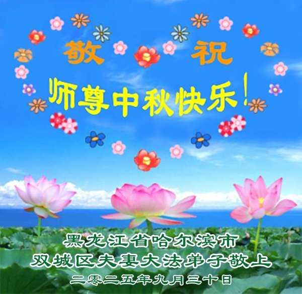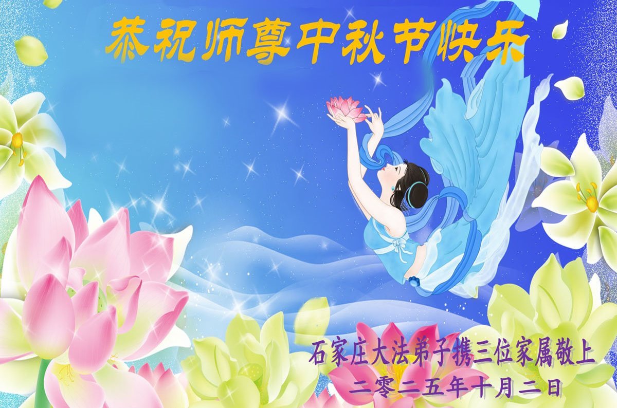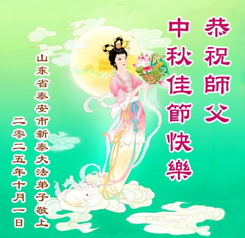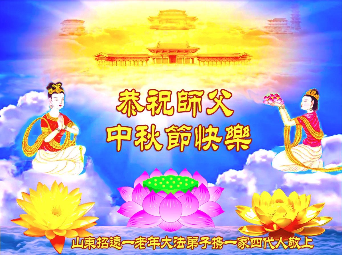 我們大法弟子攜家人和明真相的世人恭祝師尊中秋節快樂!師尊辛苦了!謝謝師尊的慈悲苦度!弟子一定破除舊勢力的安排,消除間隔,形成強大的整體,反迫害,救度眾生。弟子們要多學法,學好法,發好正念,向內找,兌現自己的誓約,跟師父回家。