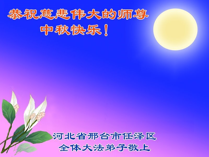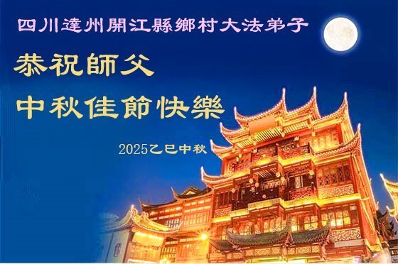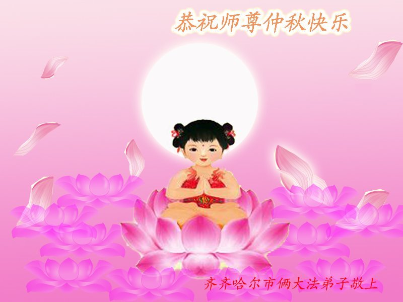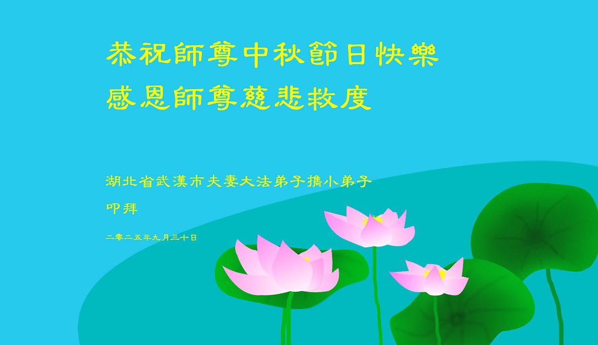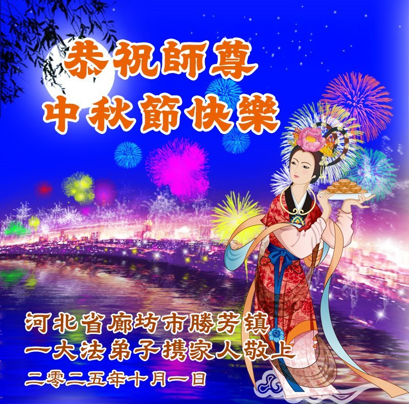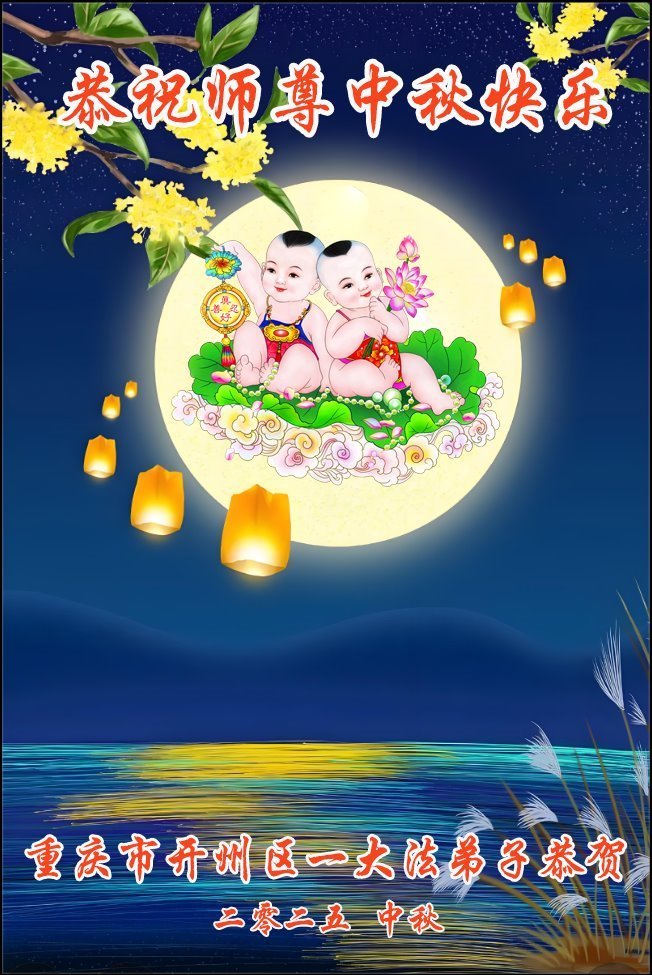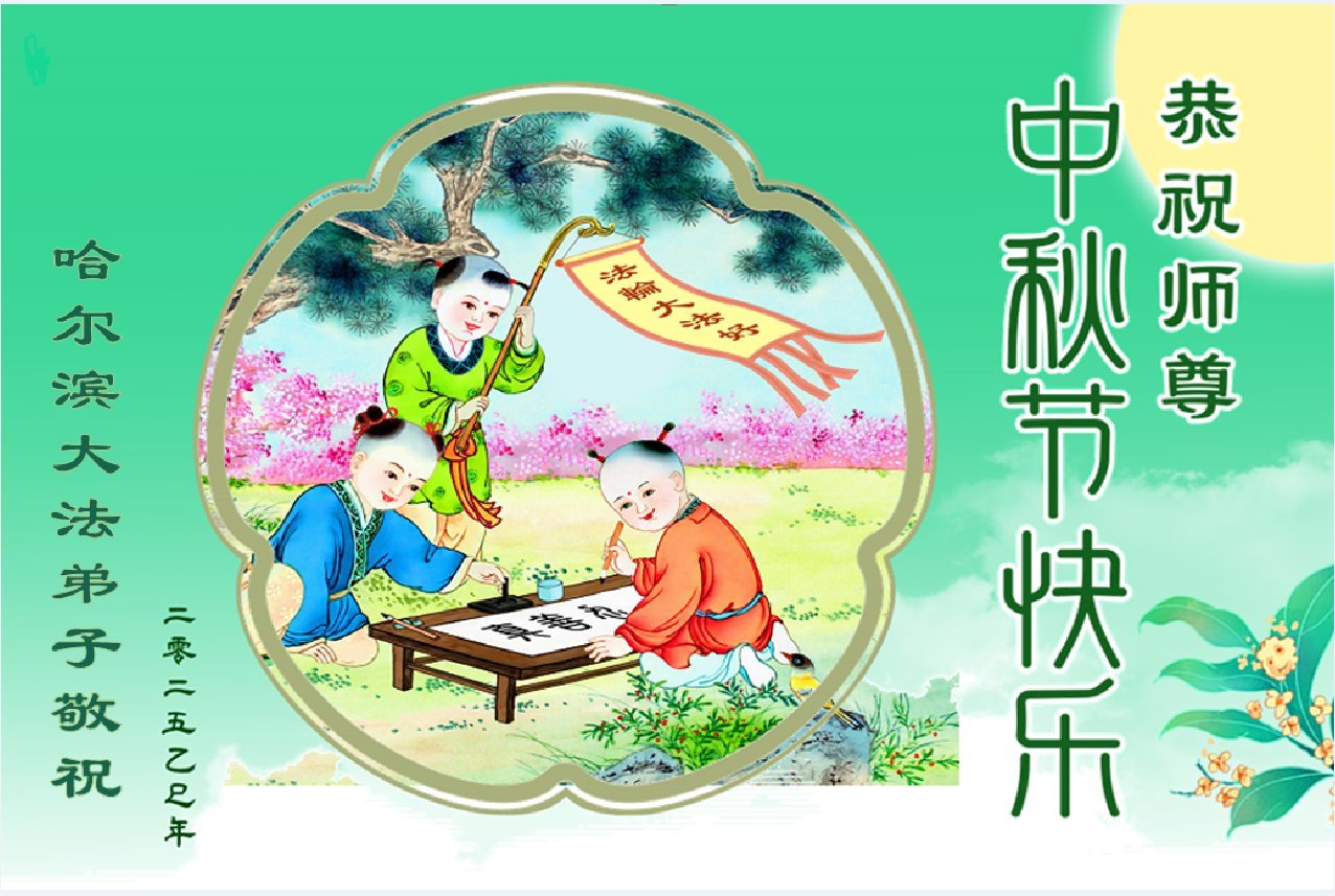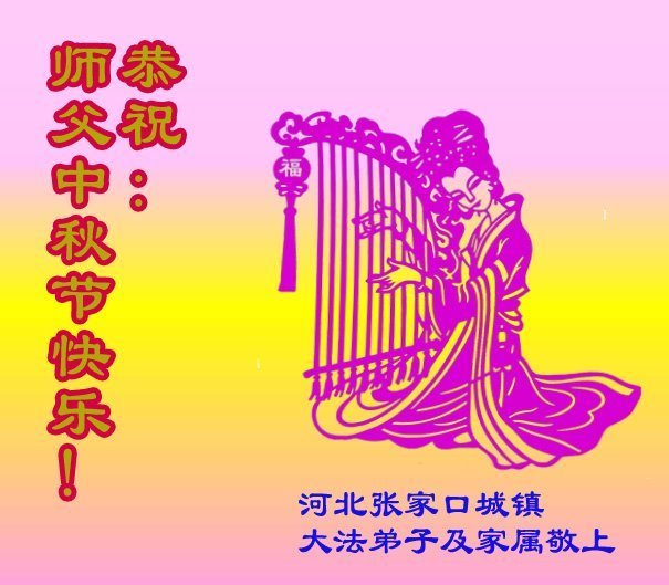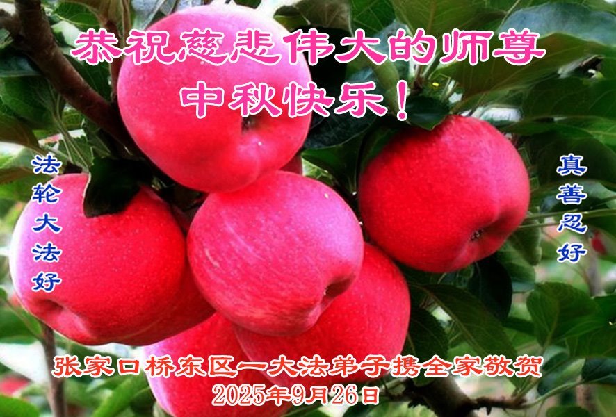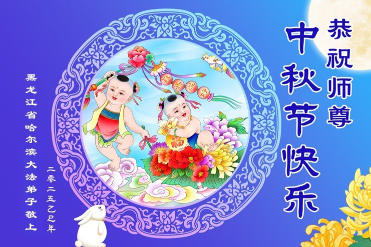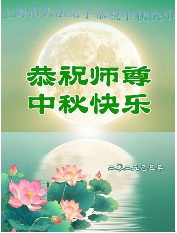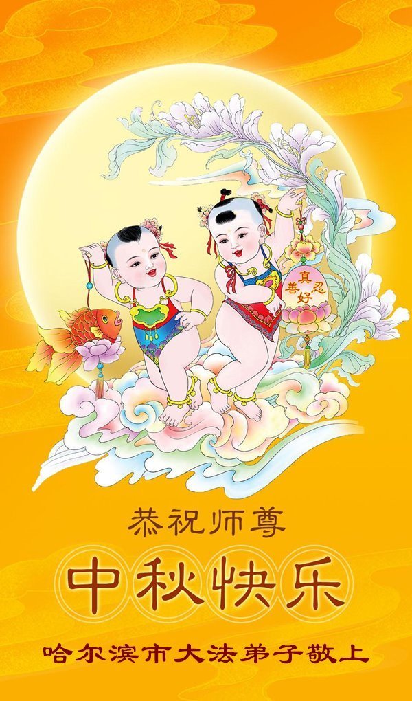 我們大法弟子攜家人和明真相的世人恭祝師尊中秋節快樂!師尊辛苦了!謝謝師尊的慈悲苦度!弟子一定破除舊勢力的安排,消除間隔,形成強大的整體,反迫害,救度眾生。弟子們要多學法,學好法,發好正念,向內找,兌現自己的誓約,跟師父回家。