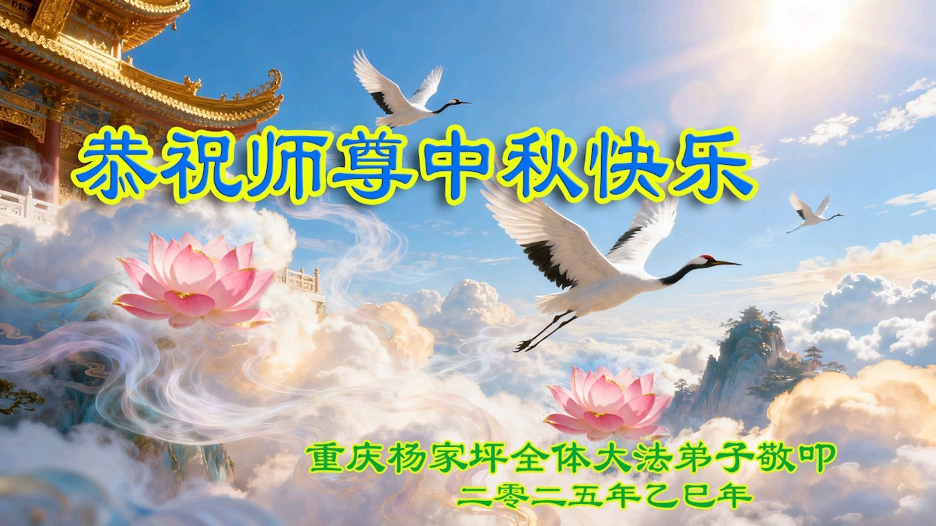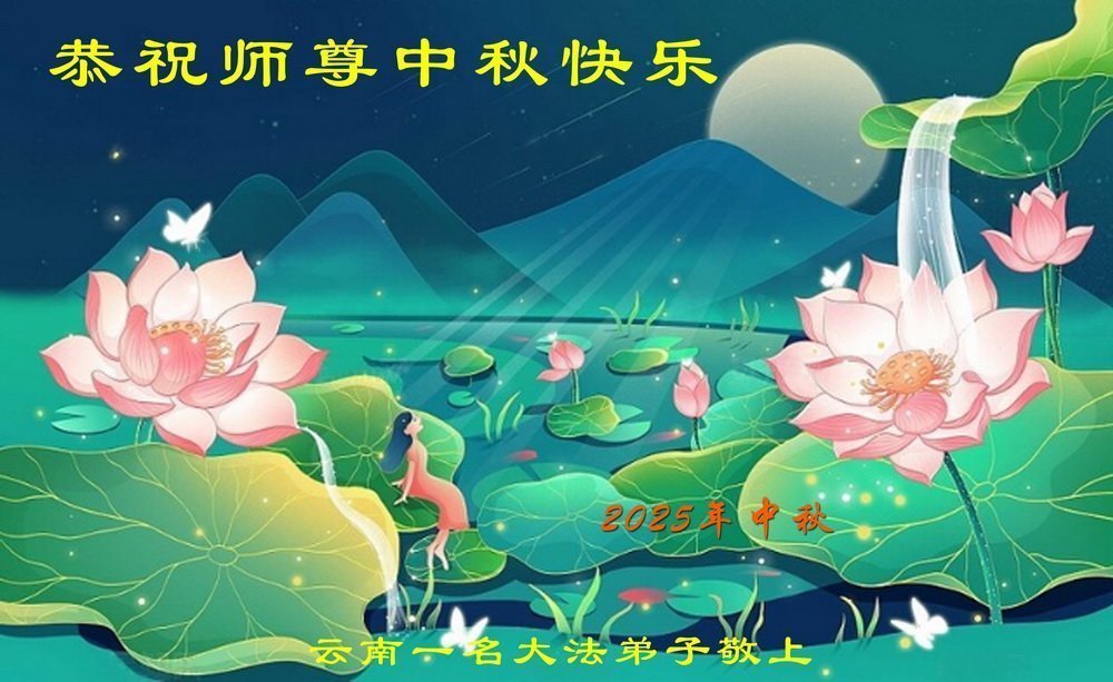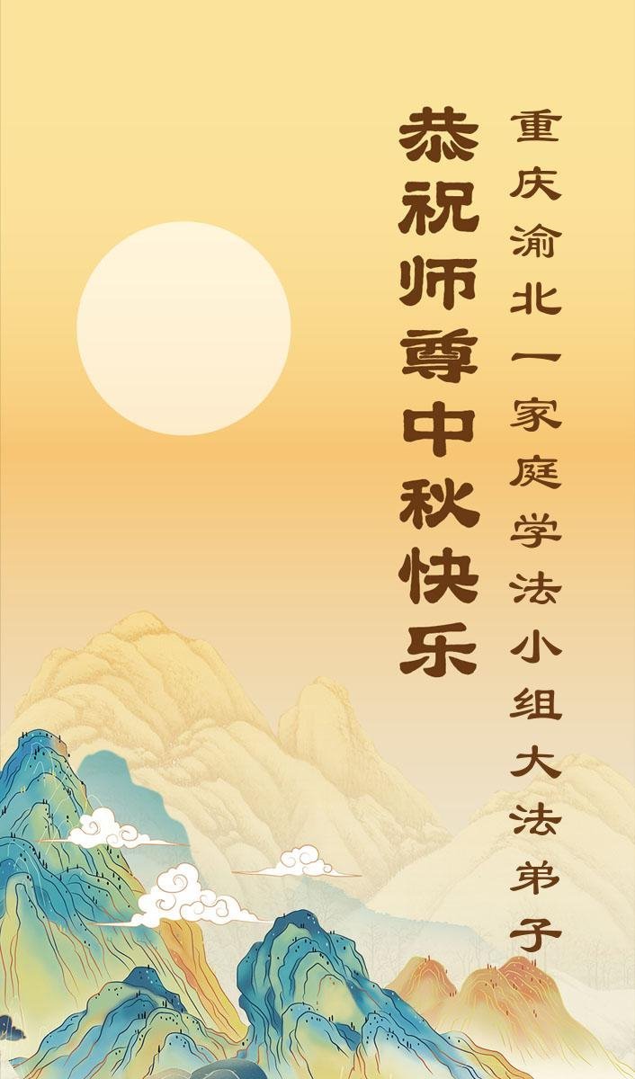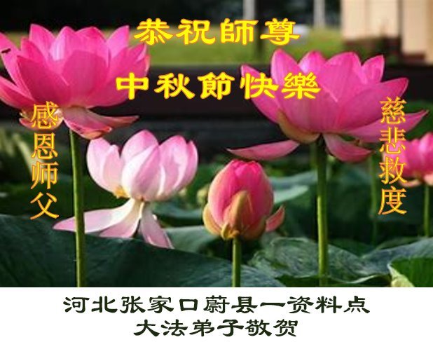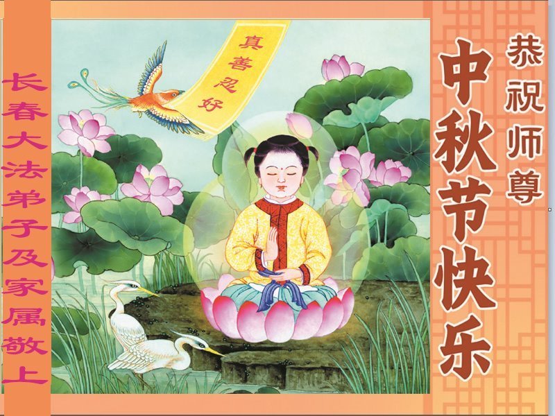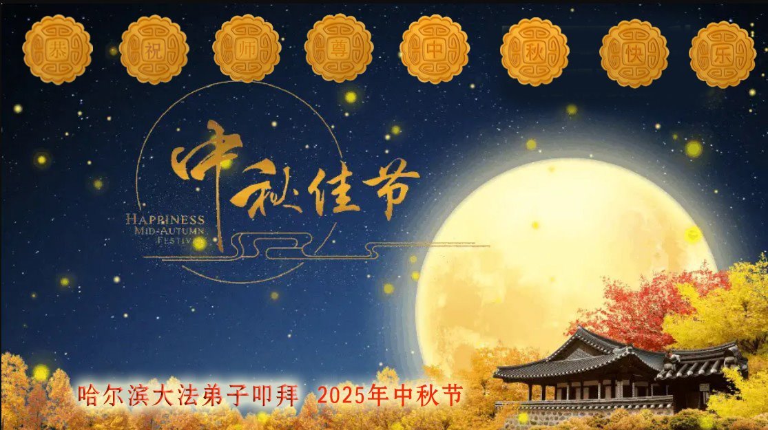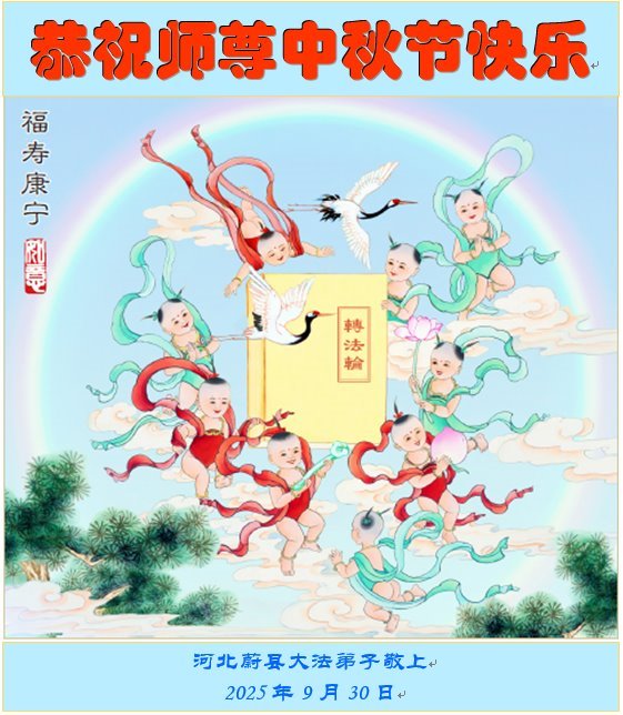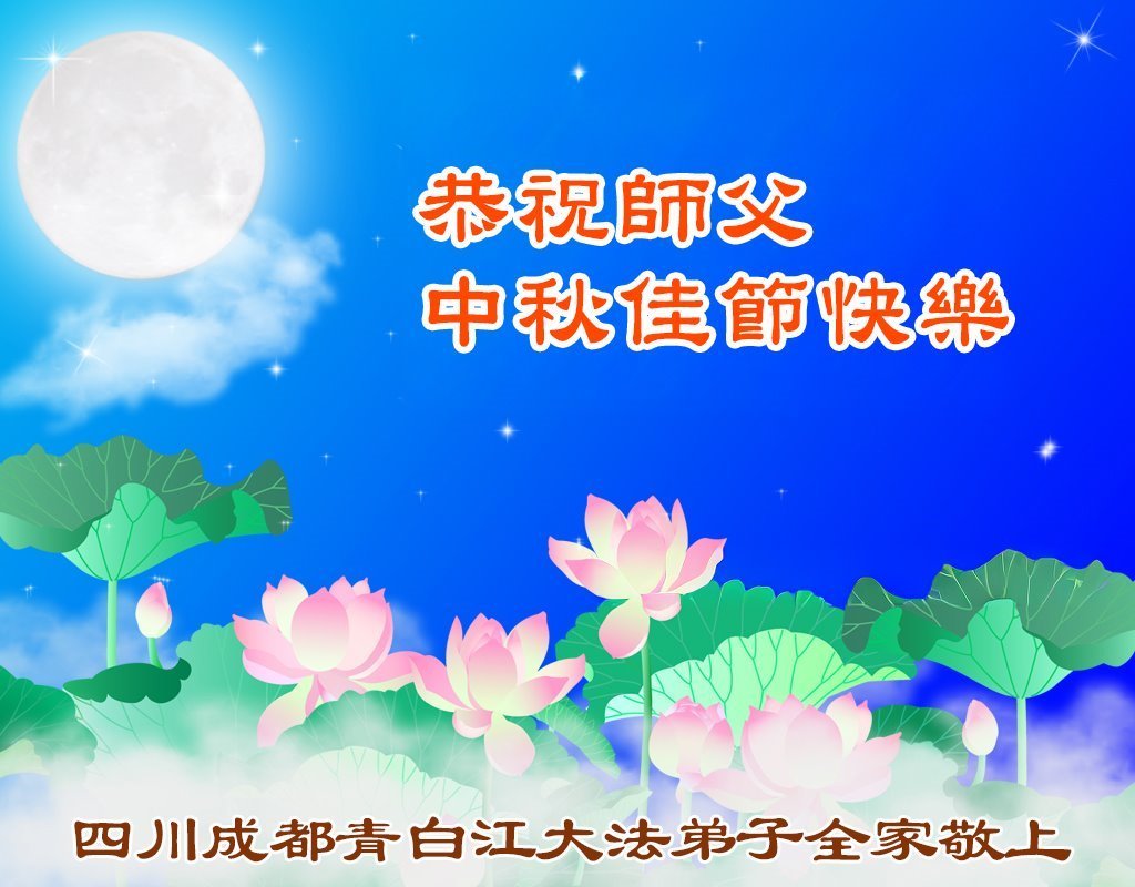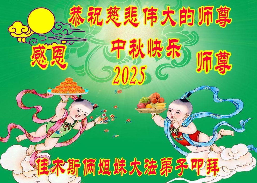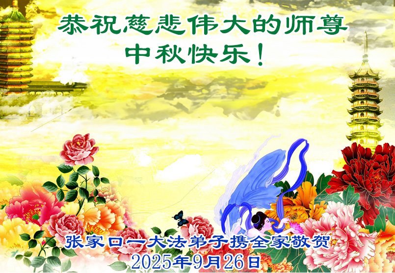 我們大法弟子攜家人和明真相的世人恭祝師尊中秋節快樂!師尊辛苦了!謝謝師尊的慈悲苦度!弟子一定破除舊勢力的安排,消除間隔,形成強大的整體,反迫害,救度眾生。弟子們要多學法,學好法,發好正念,向內找,兌現自己的誓約,跟師父回家。