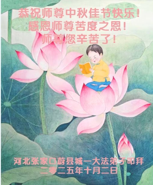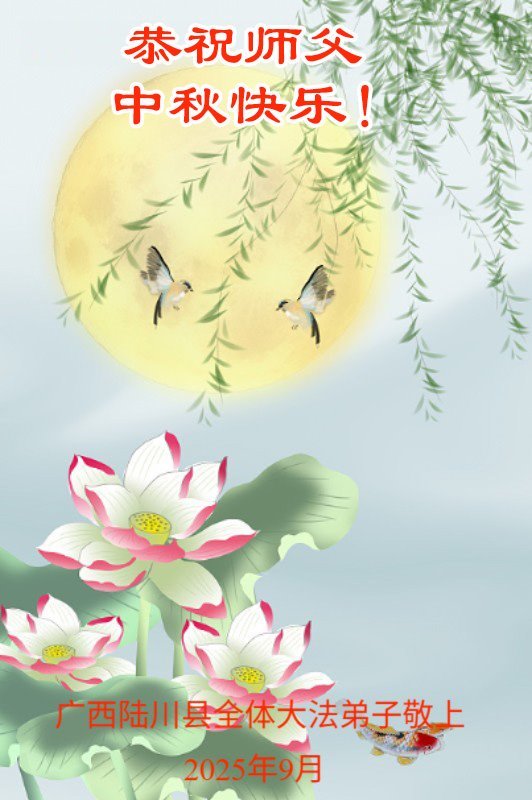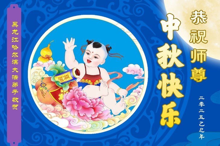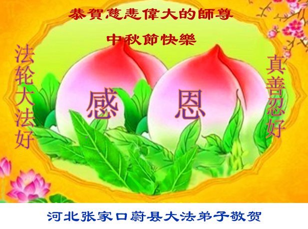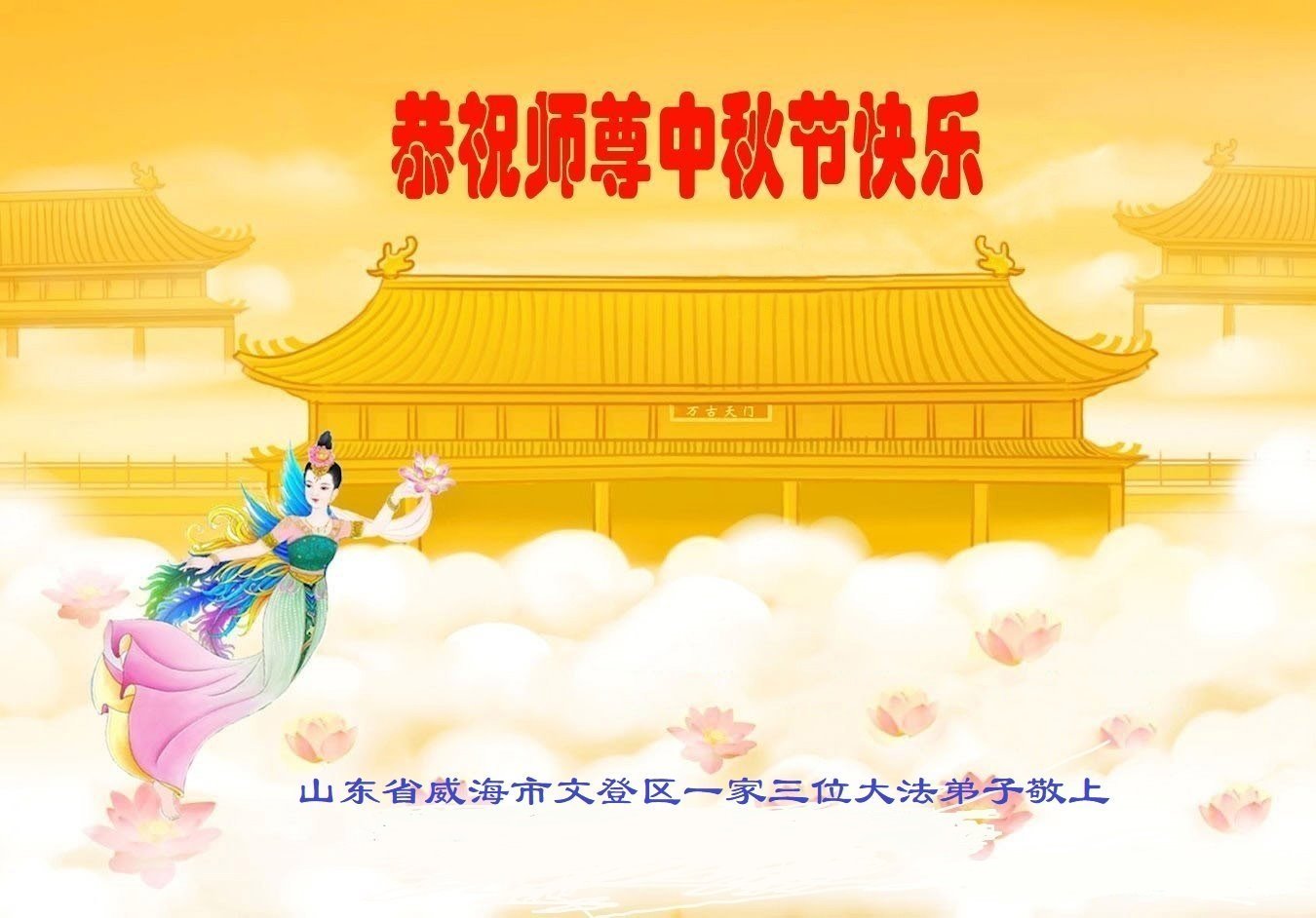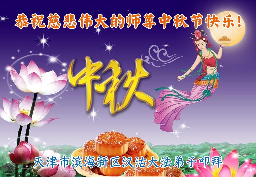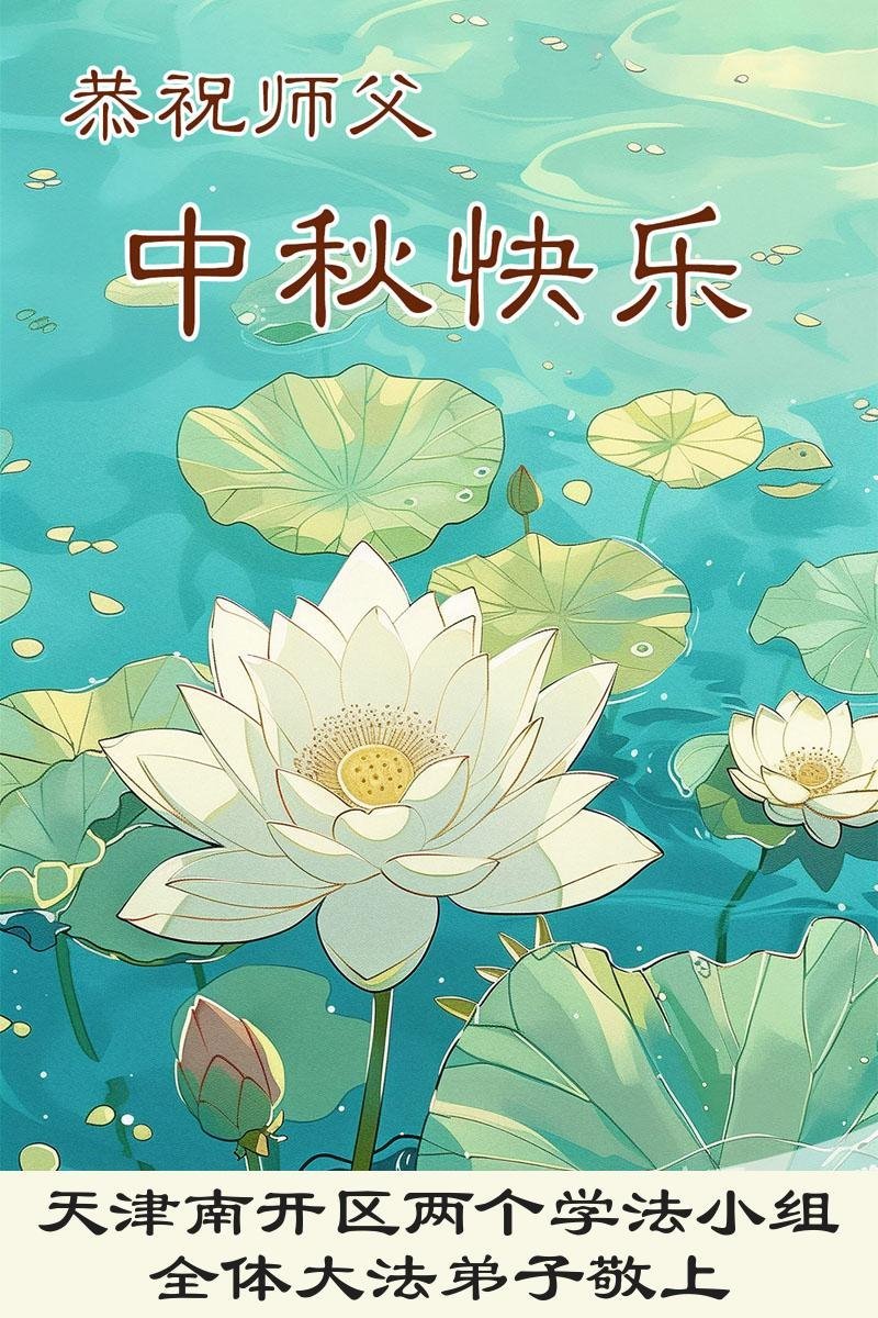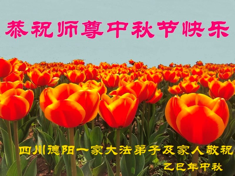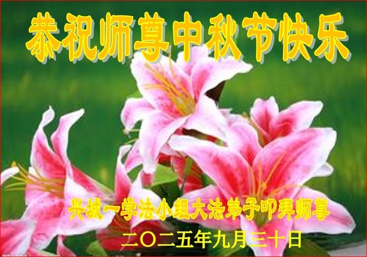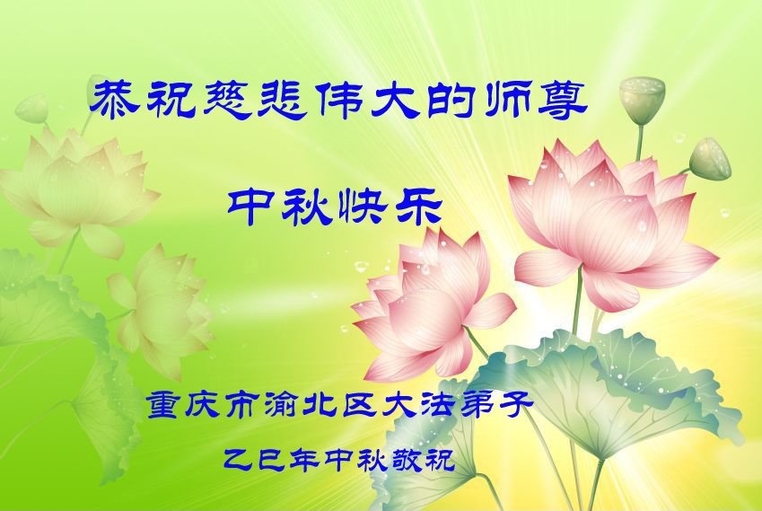 我們大法弟子攜家人和明真相的世人恭祝師尊中秋節快樂!師尊辛苦了!謝謝師尊的慈悲苦度!弟子一定破除舊勢力的安排,消除間隔,形成強大的整體,反迫害,救度眾生。弟子們要多學法,學好法,發好正念,向內找,兌現自己的誓約,跟師父回家。