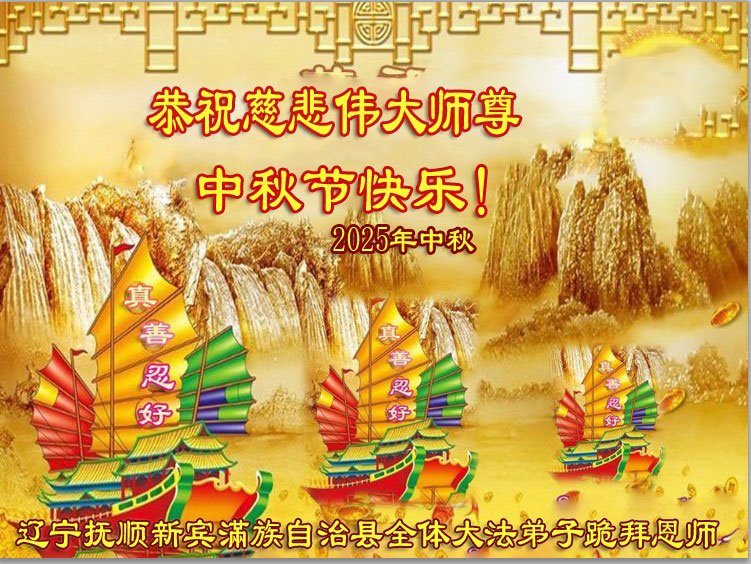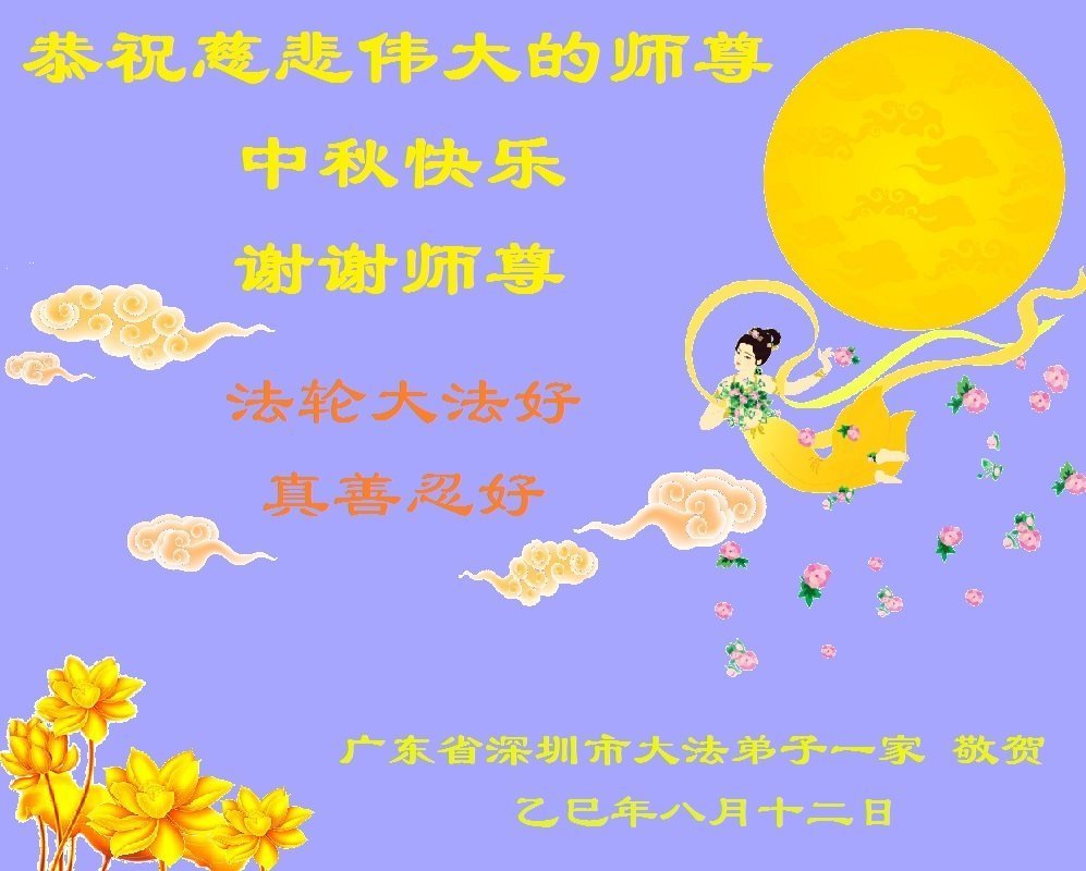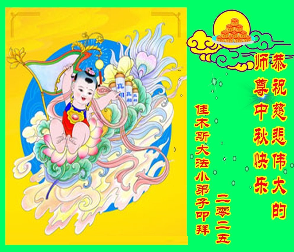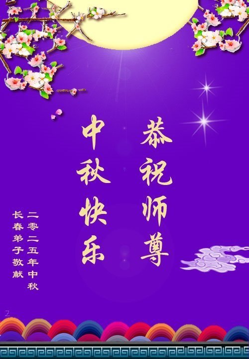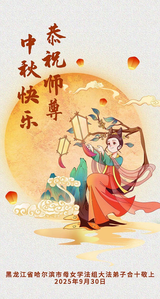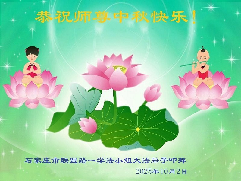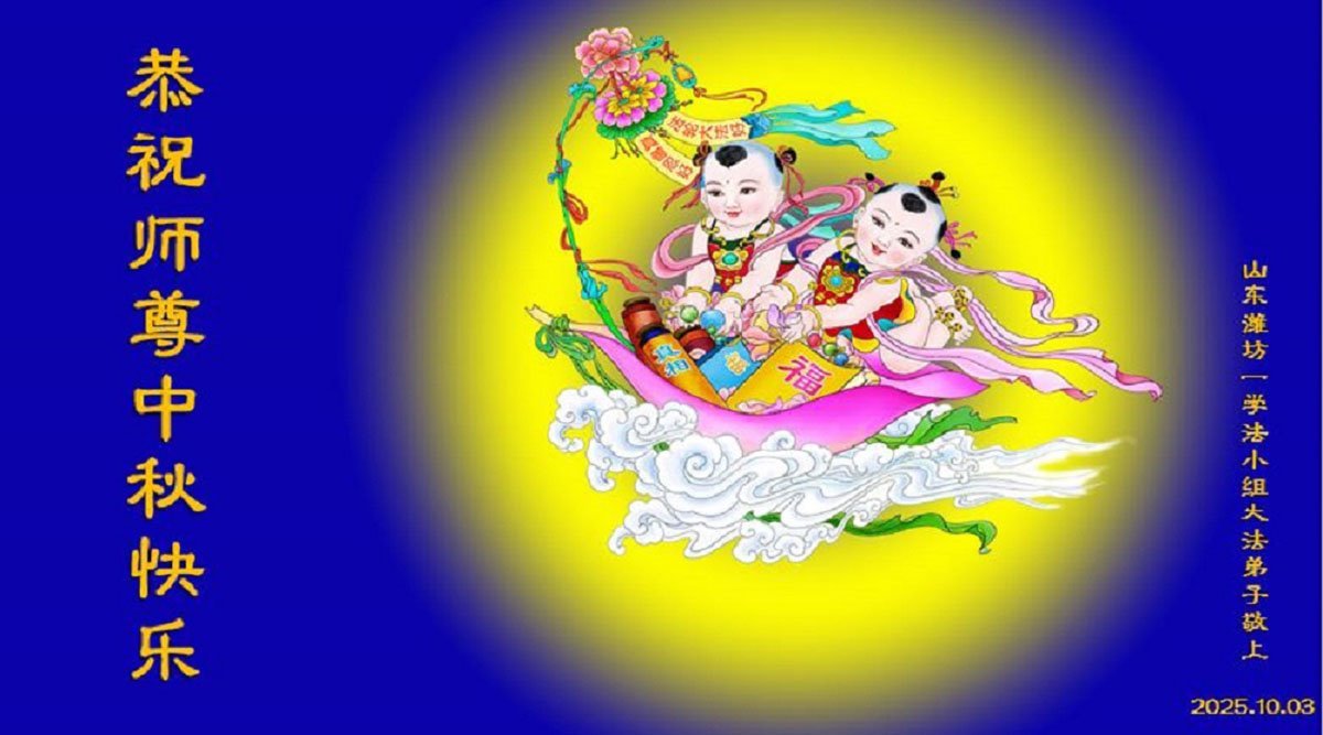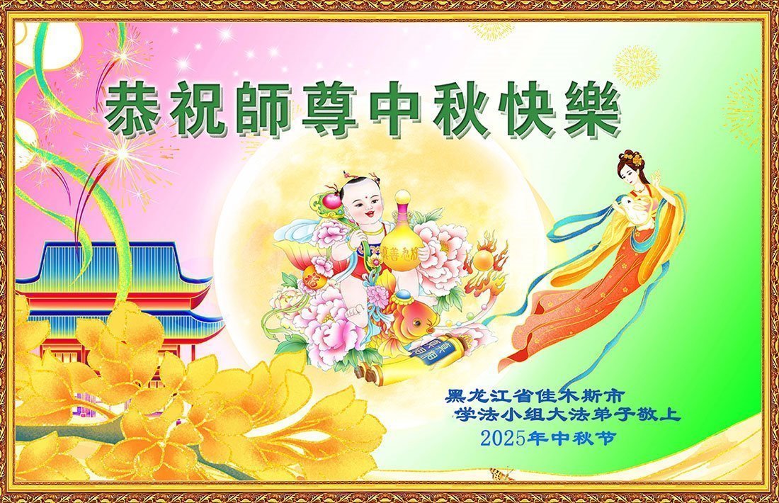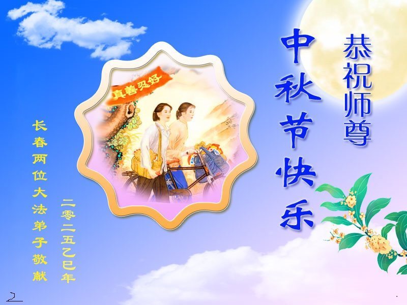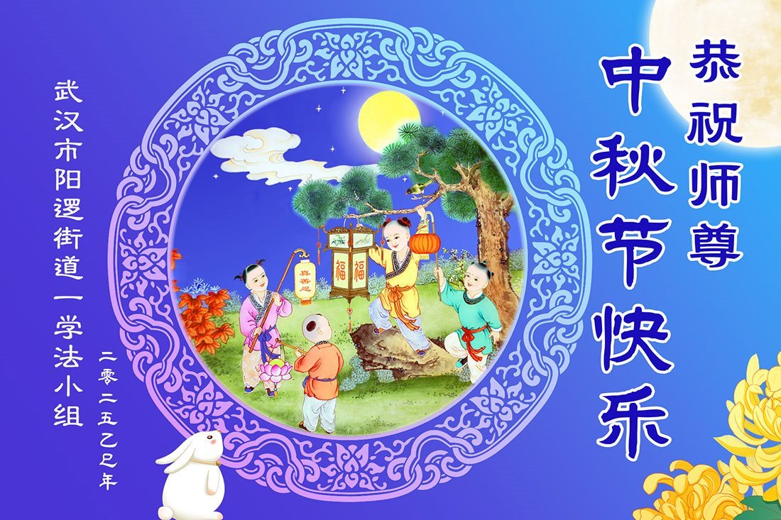 我們大法弟子攜家人和明真相的世人恭祝師尊中秋節快樂!師尊辛苦了!謝謝師尊的慈悲苦度!弟子一定破除舊勢力的安排,消除間隔,形成強大的整體,反迫害,救度眾生。弟子們要多學法,學好法,發好正念,向內找,兌現自己的誓約,跟師父回家。