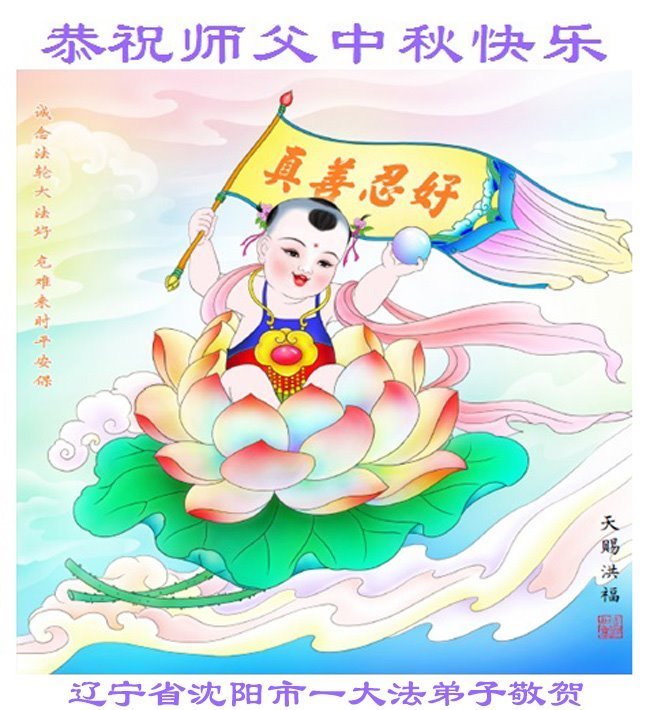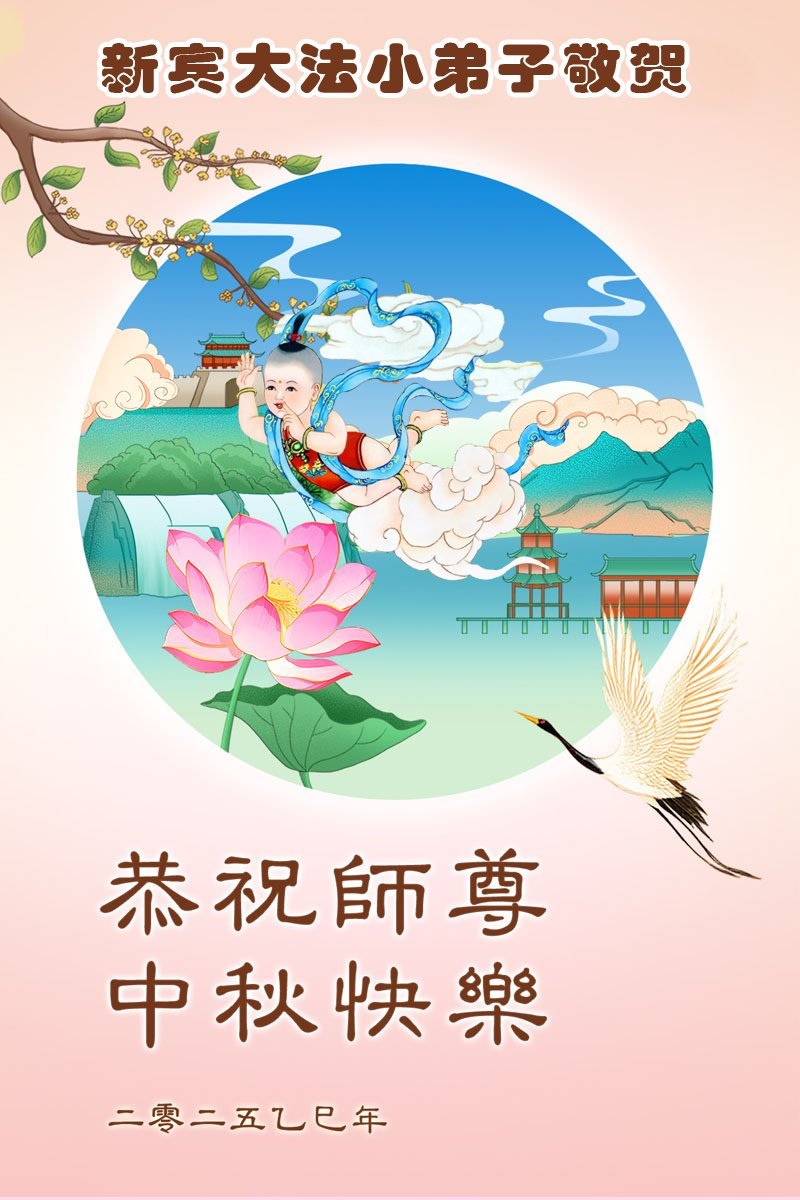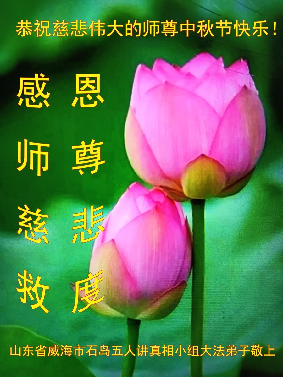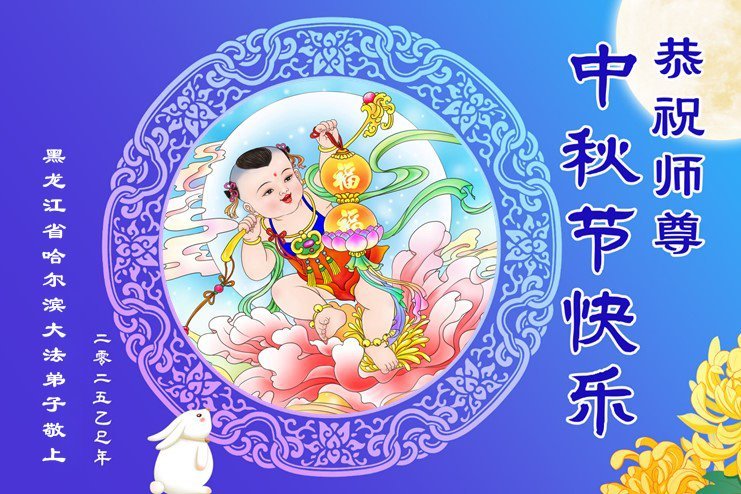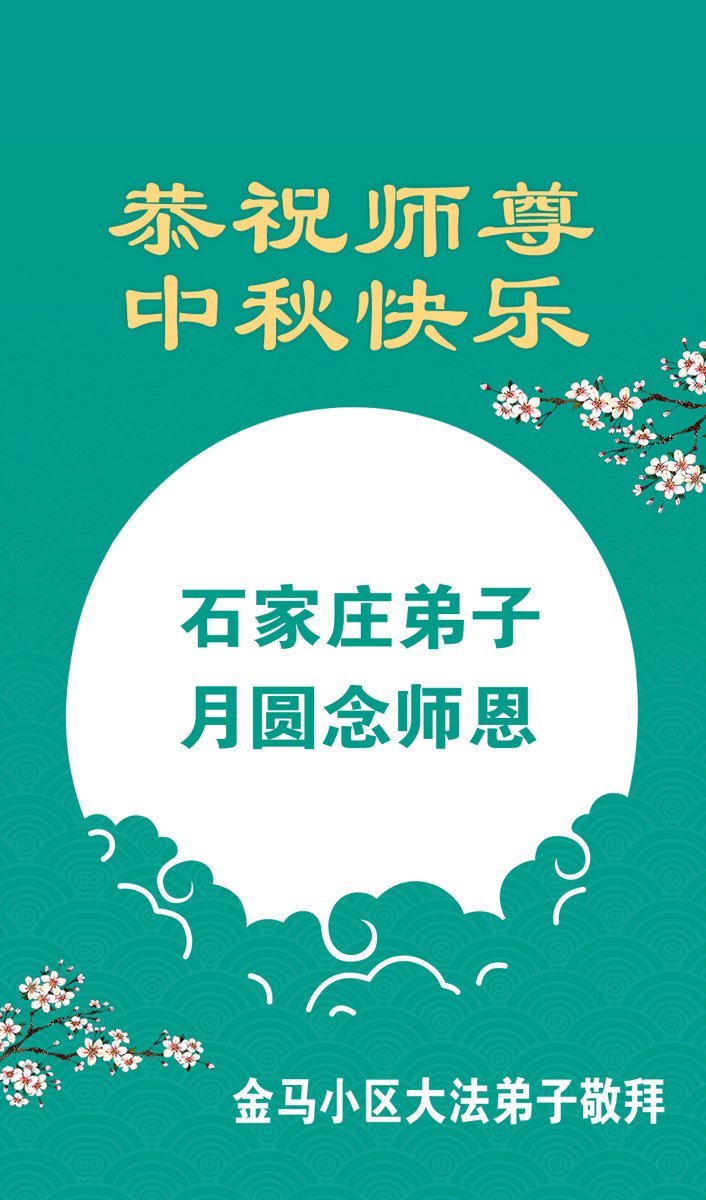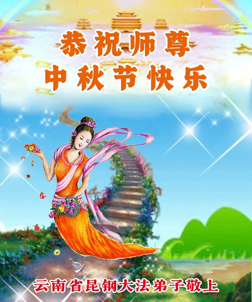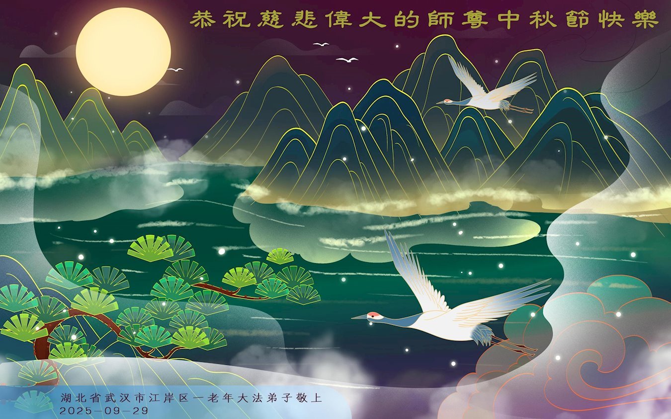 我們大法弟子攜家人和明真相的世人恭祝師尊中秋節快樂!師尊辛苦了!謝謝師尊的慈悲苦度!弟子一定破除舊勢力的安排,消除間隔,形成強大的整體,反迫害,救度眾生。弟子們要多學法,學好法,發好正念,向內找,兌現自己的誓約,跟師父回家。