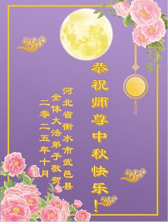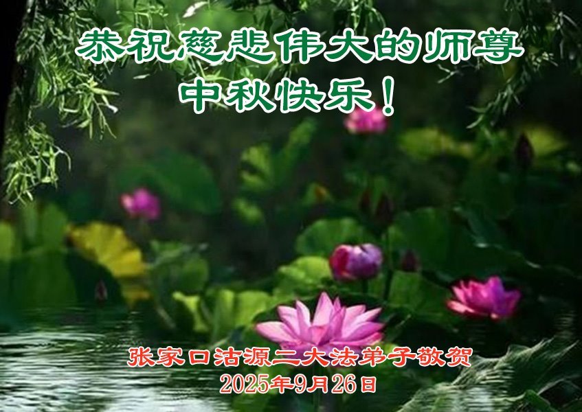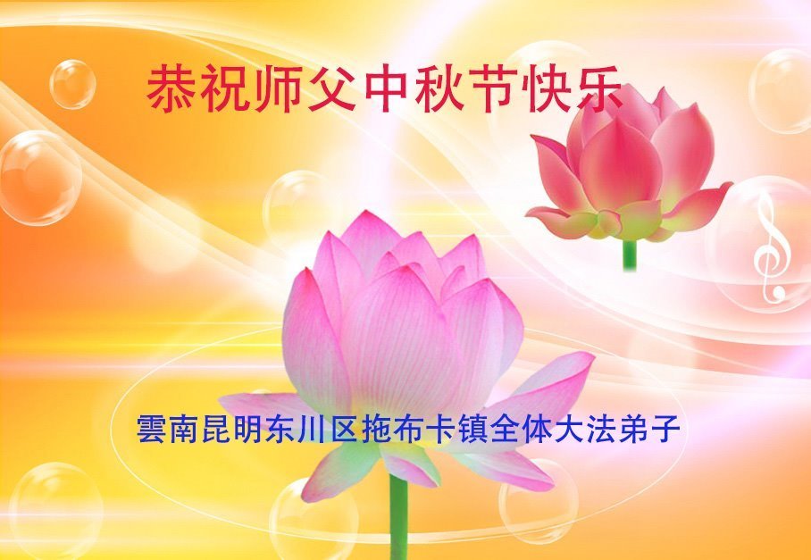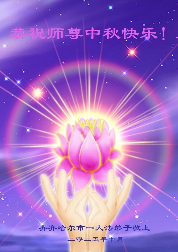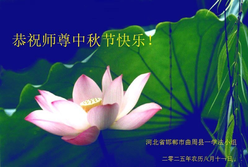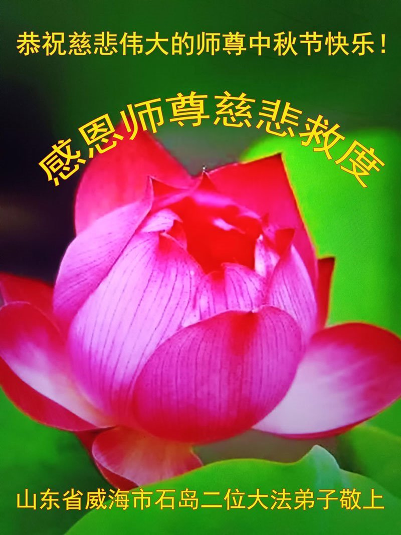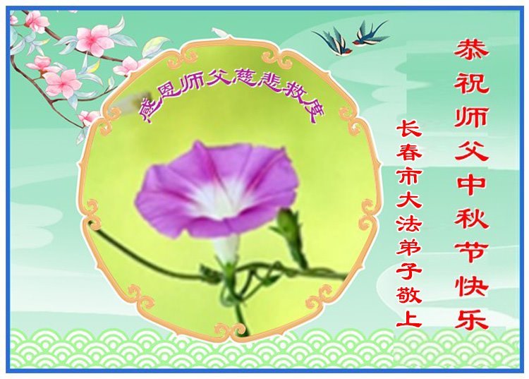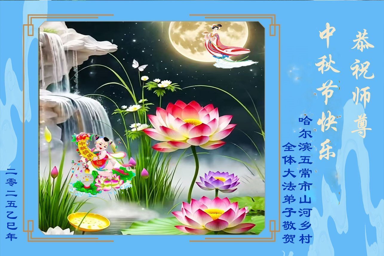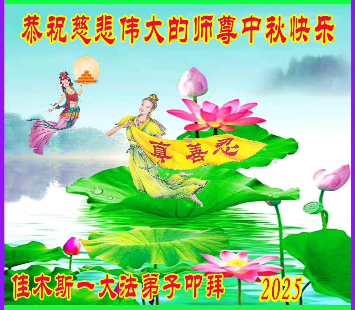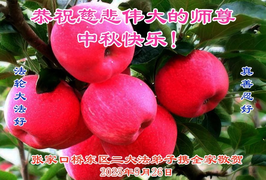 我們大法弟子攜家人和明真相的世人恭祝師尊中秋節快樂!師尊辛苦了!謝謝師尊的慈悲苦度!弟子一定破除舊勢力的安排,消除間隔,形成強大的整體,反迫害,救度眾生。弟子們要多學法,學好法,發好正念,向內找,兌現自己的誓約,跟師父回家。