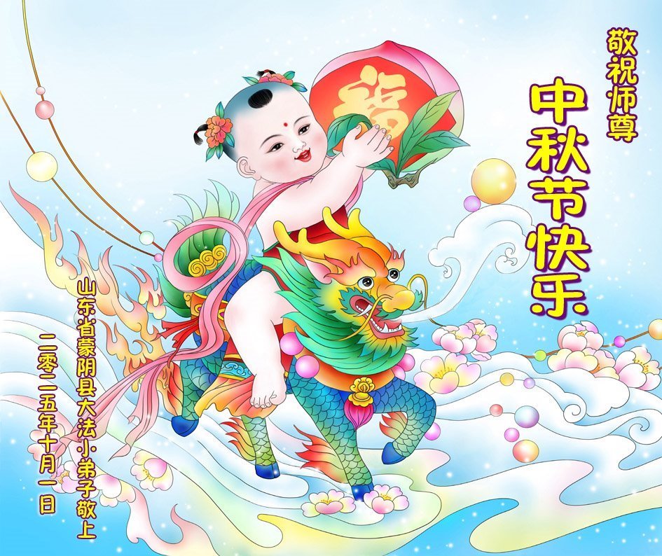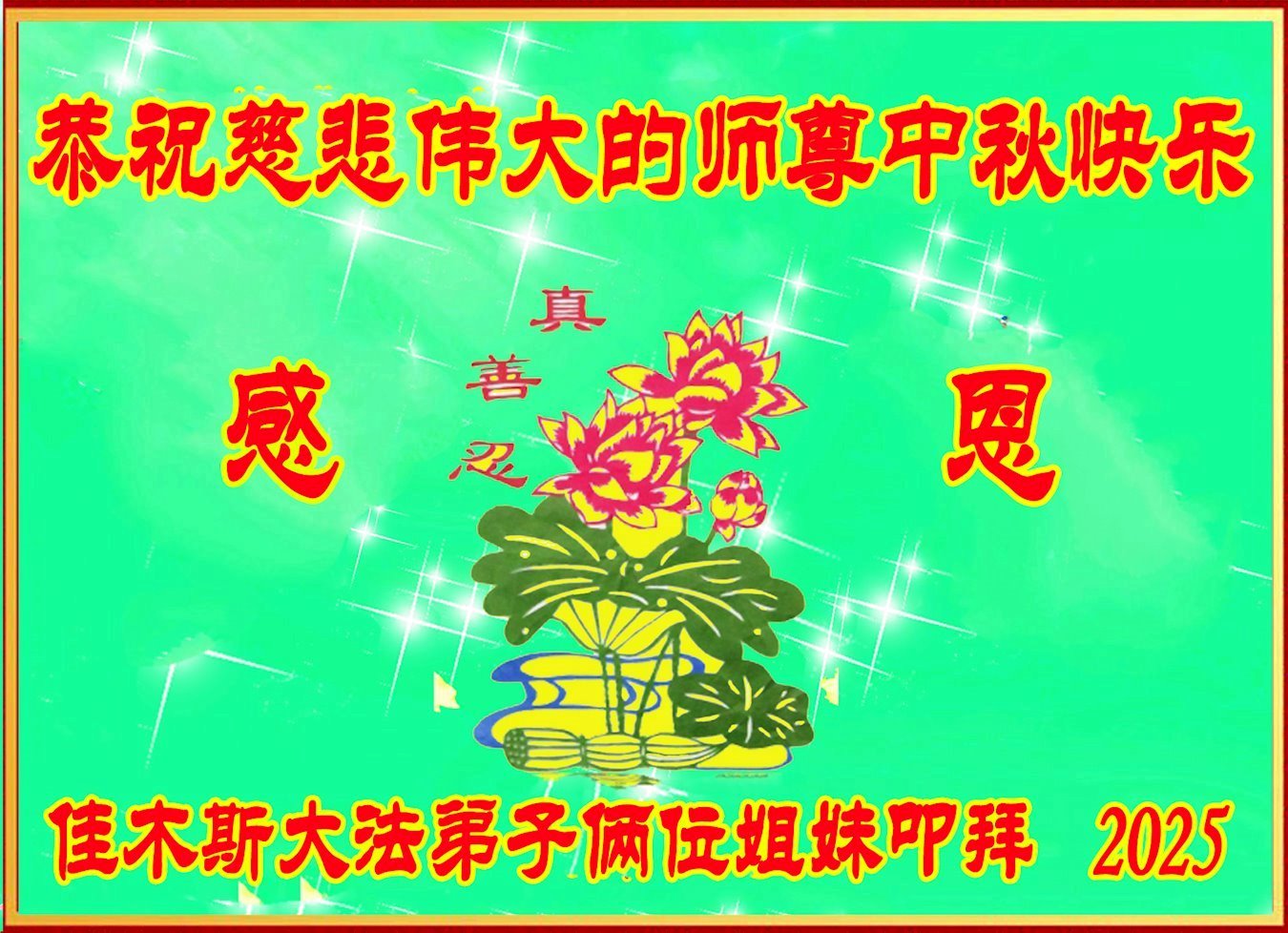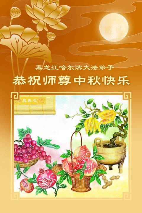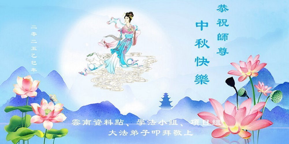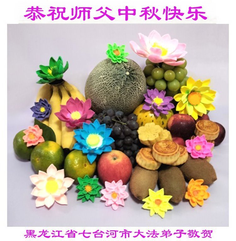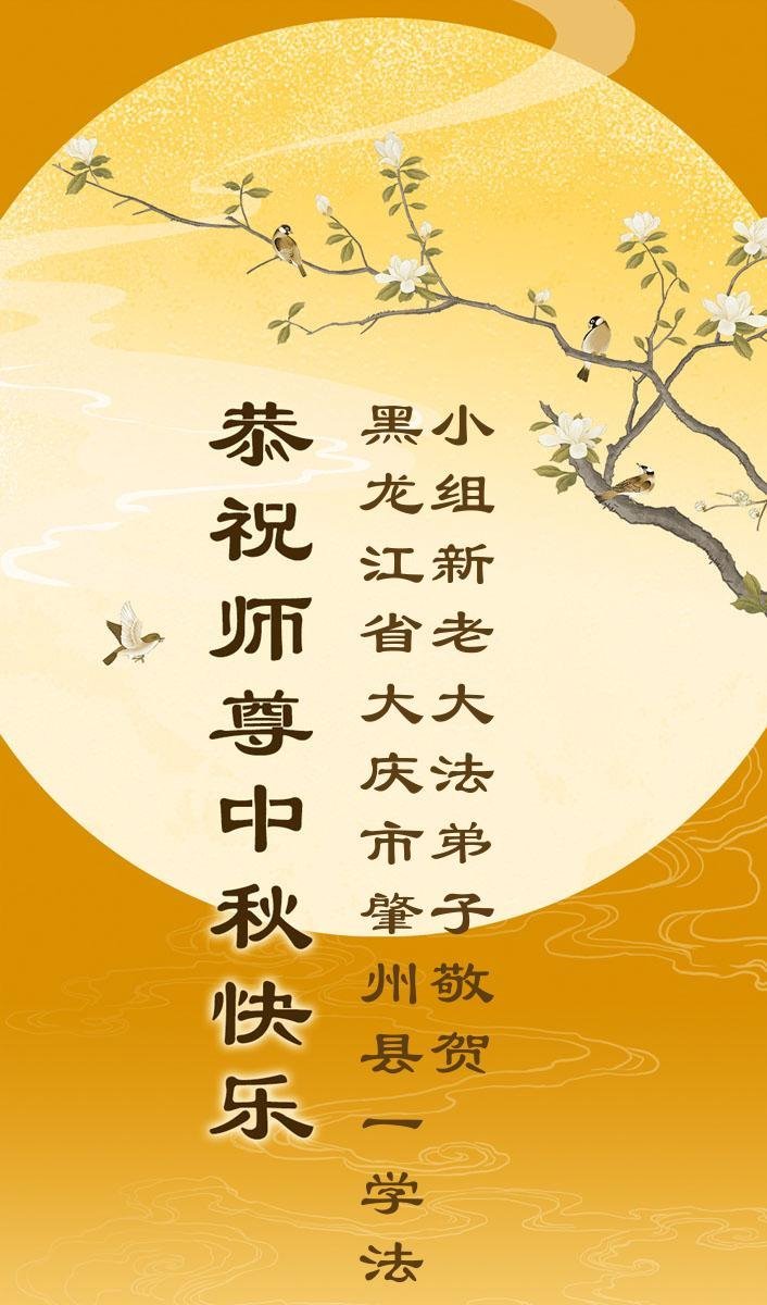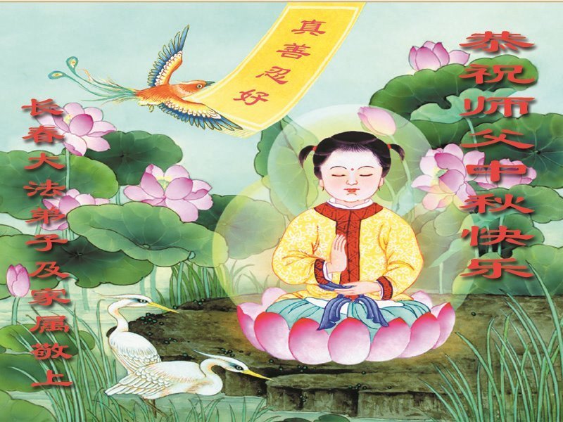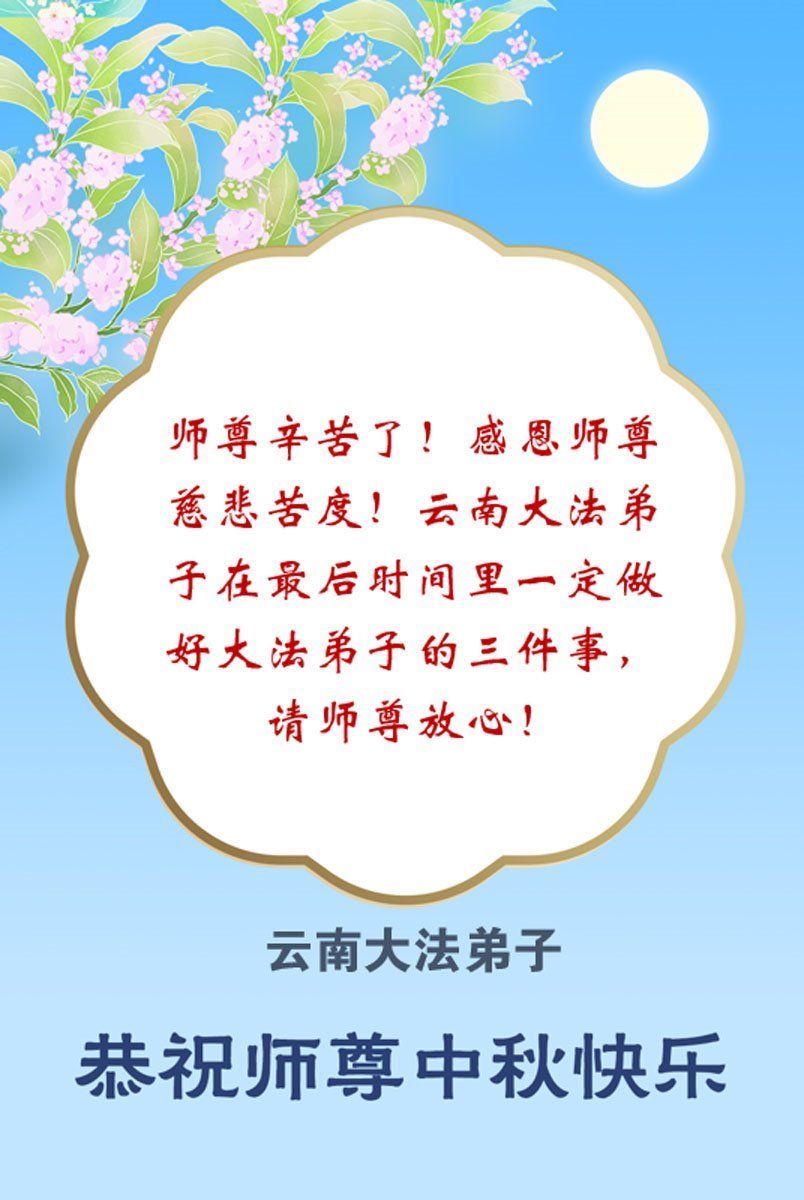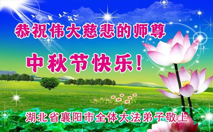 我們大法弟子攜家人和明真相的世人恭祝師尊中秋節快樂!師尊辛苦了!謝謝師尊的慈悲苦度!弟子一定破除舊勢力的安排,消除間隔,形成強大的整體,反迫害,救度眾生。弟子們要多學法,學好法,發好正念,向內找,兌現自己的誓約,跟師父回家。