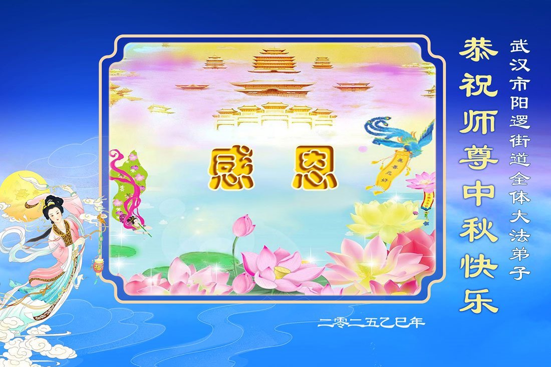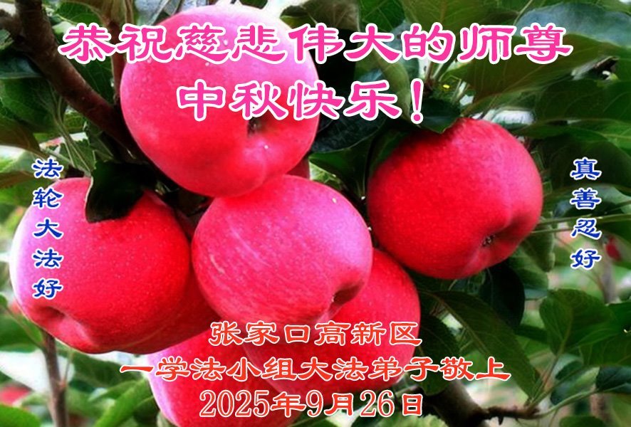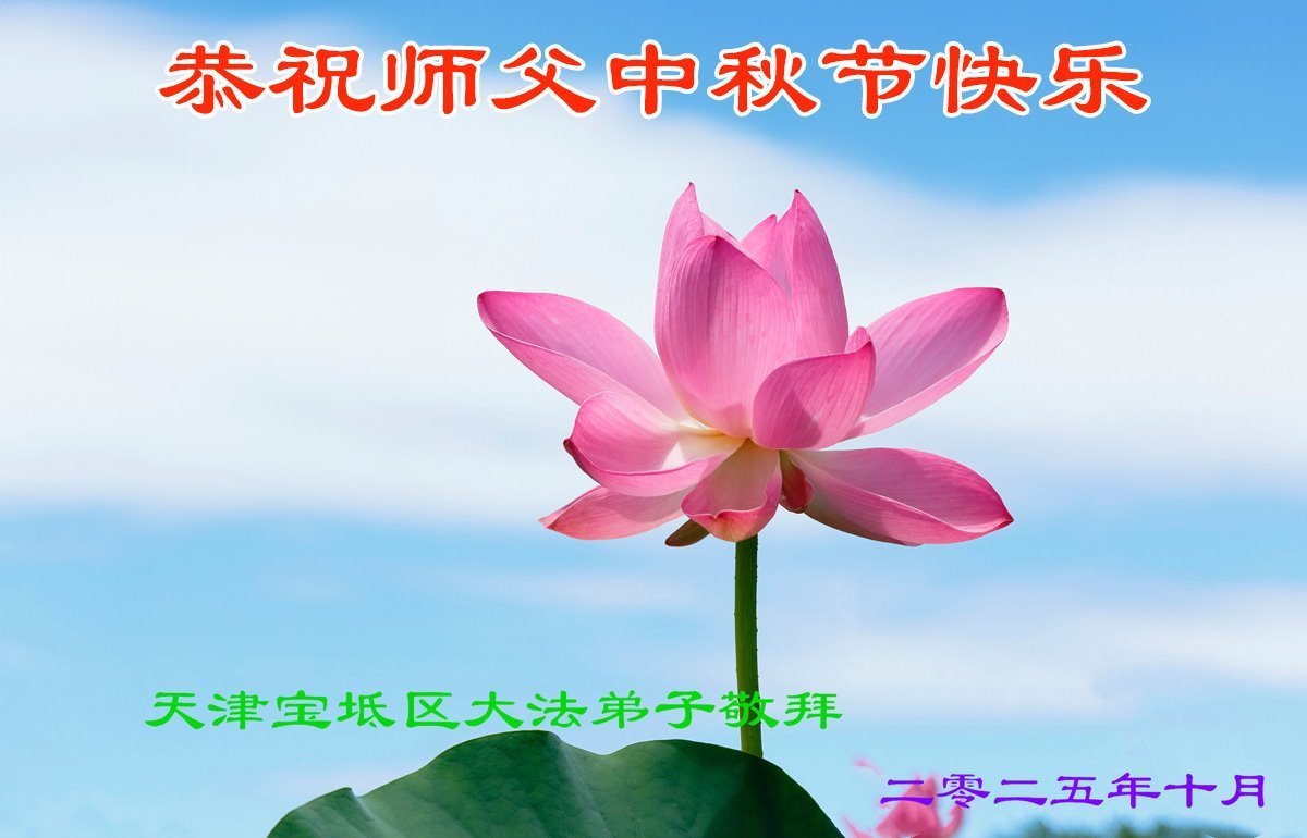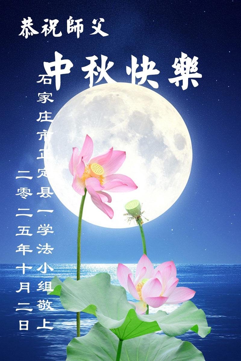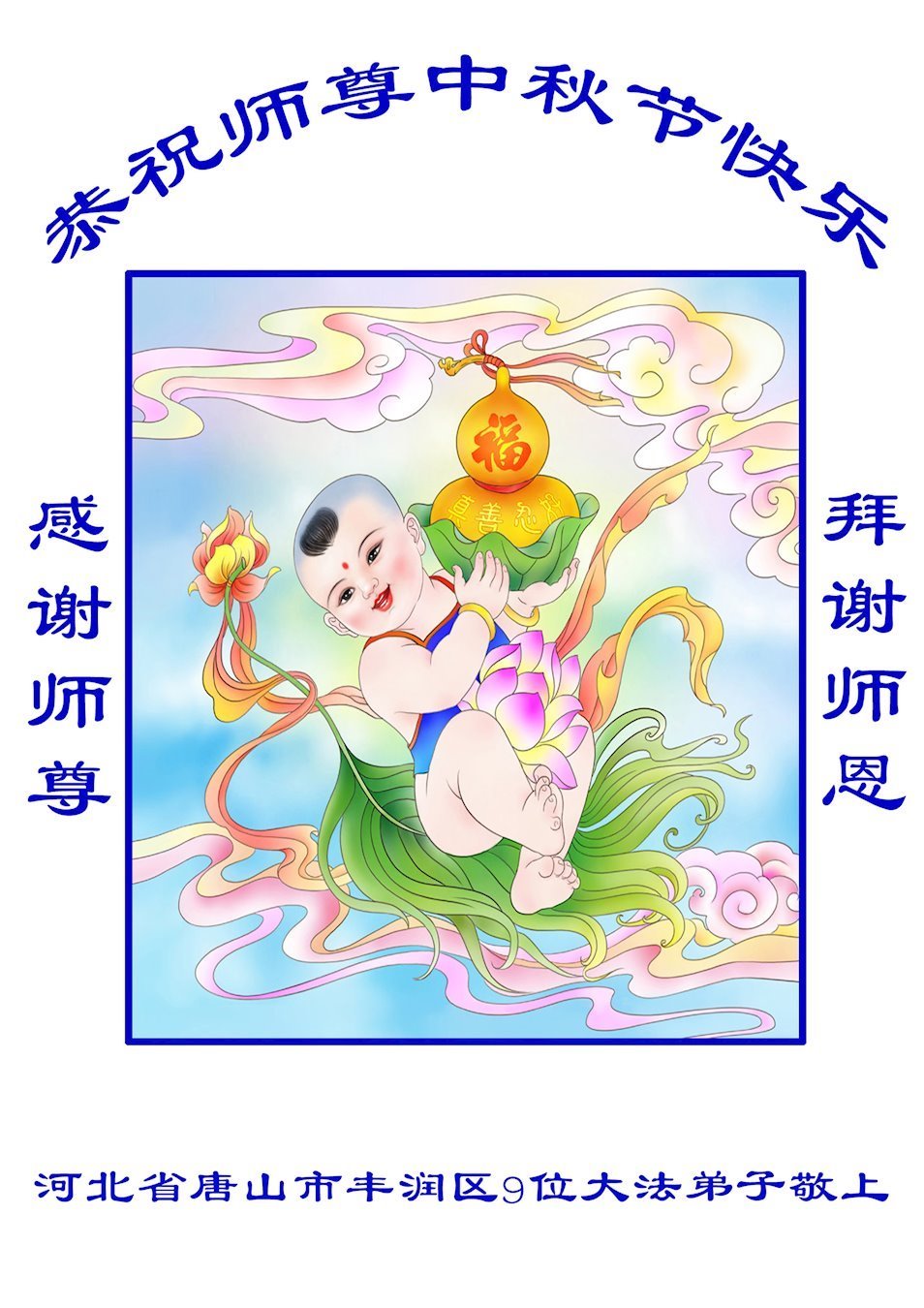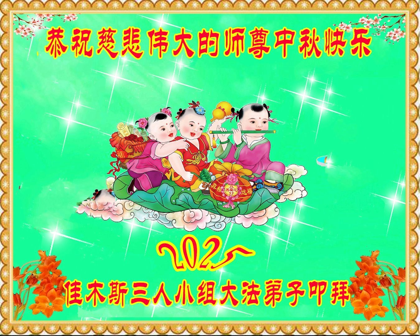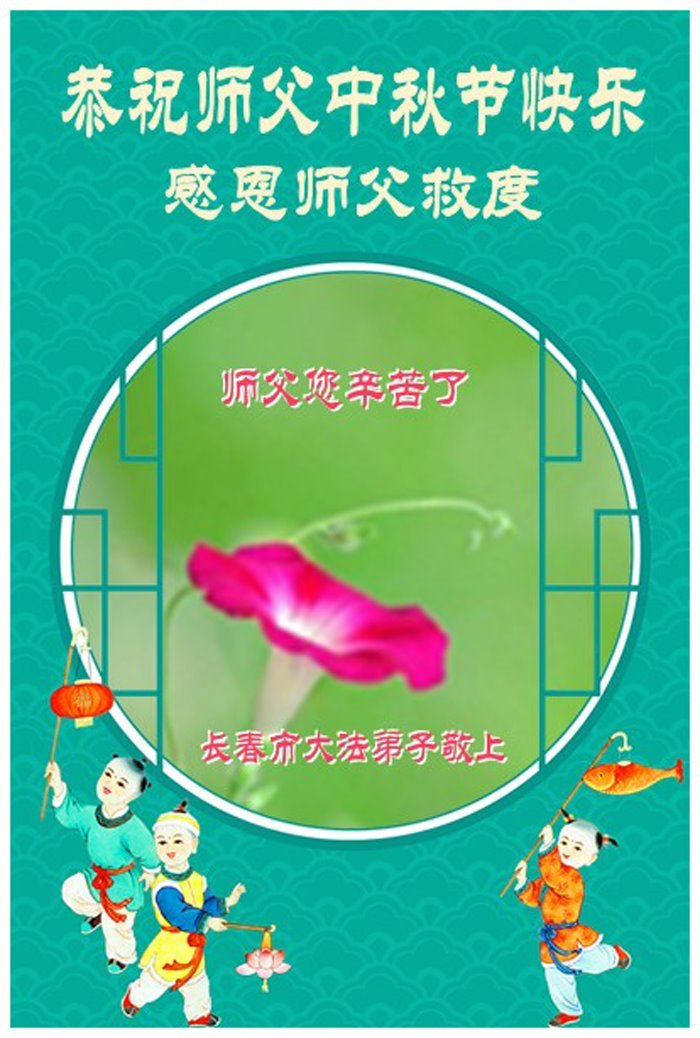 我們大法弟子攜家人和明真相的世人恭祝師尊中秋節快樂!師尊辛苦了!謝謝師尊的慈悲苦度!弟子一定破除舊勢力的安排,消除間隔,形成強大的整體,反迫害,救度眾生。弟子們要多學法,學好法,發好正念,向內找,兌現自己的誓約,跟師父回家。
